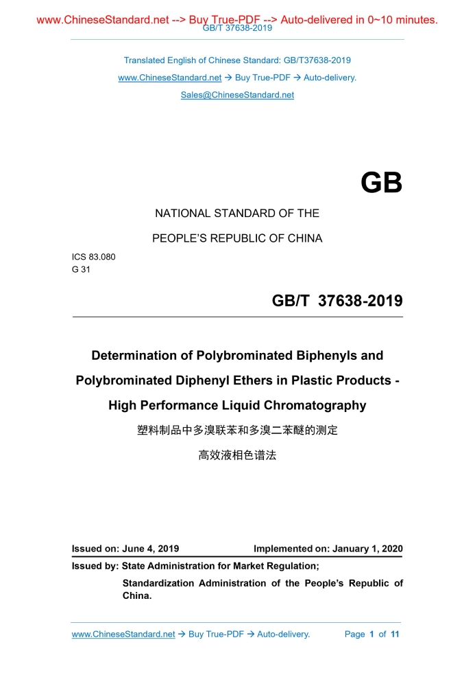 GB/T 37638-2019: Determination of Polybrominated Biphenyls and Polybrominated Diphenyl Ethers in Plastic Products - High Performance Liquid Chromatography Delivery: 9 seconds. True-PDF full-copy in English & invoice will be downloaded + auto-delivered via email. See step-by-step procedure Status: Valid