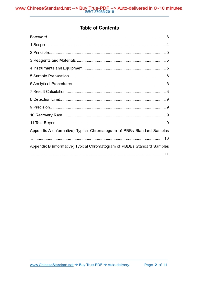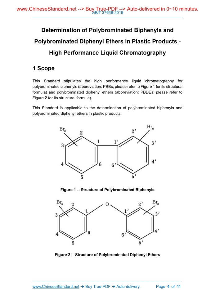 Similar standardsGB/T 37638-2019: Determination of Polybrominated Biphenyls and Polybrominated Diphenyl Ethers in Plastic Products - High Performance Liquid Chromatography---This is an excerpt. Full copy of true-PDF in English version (including equations, symbols, images, flow-chart, tables, and figures etc.), auto-downloaded/delivered in 9 seconds, can be purchased online: https://www.ChineseStandard.net/PDF.aspx/GBT37638-2019 NATIONAL STANDARD OF THE PEOPLE’S REPUBLIC OF CHINA ICS 83.080 G 31 Determination of Polybrominated Biphenyls and Polybrominated Diphenyl Ethers in Plastic Products - High Performance Liquid Chromatography ISSUED ON: JUNE 4, 2019 IMPLEMENTED ON: JANUARY 1, 2020 Issued by: State Administration for Market Regulation; Standardization Administration of the People’s Republic of China. Table of ContentsForeword ... 3 1 Scope ... 4 2 Principle ... 5 3 Reagents and Materials ... 5 4 Instruments and Equipment ... 5 5 Sample Preparation ... 6 6 Analytical Procedures ... 6 7 Result Calculation ... 8 8 Detection Limit ... 9 9 Precision ... 9 10 Recovery Rate ... 9 11 Test Report ... 9 Appendix A (informative) Typical Chromatogram of PBBs Standard Samples ... 10 Appendix B (informative) Typical Chromatogram of PBDEs Standard Samples ... 11 Determination of Polybrominated Biphenyls and Polybrominated Diphenyl Ethers in Plastic Products - High Performance Liquid Chromatography1 ScopeThis Standard stipulates the high performance liquid chromatography for polybrominated biphenyls (abbreviation: PBBs; please refer to Figure 1 for its structural formula) and polybrominated diphenyl ethers (abbreviation: PBDEs; please refer to Figure 2 for its structural formula). This Standard is applicable to the determination of polybrominated biphenyls and polybrominated diphenyl ethers in plastic products. Figure 1 -- Structure of Polybrominated Biphenyls Figure 2 -- Structure of Polybrominated Diphenyl Ethers 4.4 Rotary evaporator. 4.5 Pulverizer. 4.6 Solid-phase extraction device. 4.7 Constant-temperature water bath (temperature accuracy shall be less than 1 °C). 4.8 Analytical balance (accurate to: 0.0001 g). 4.9 Centrifuge. 4.10 Closed microwave extractor. 4.11 Organic-phase filtration membrane: 0.45 μm filtration membrane.5 Sample PreparationIn accordance with product’s property, through the modes of clipping, crushing or liquid nitrogen freezing and pulverization, prepare sample into particles with the particle size of less than 1 mm.6 Analytical Procedures6.1 Extraction Extraction includes the following three methods: a) Soxhlet extraction method: on the analytical balance, accurately weigh-take 0.1 g of sample (accurate to 1 mg); place it into a filtration paper cylinder. Add 150 mL of dichloromethane solution, then, control the water bath temperature at 60 °C ± 5 °C. At the rate of 2 drops/s ~ 3 drops/s, conduct extraction for over 12 h. After the extraction is completed, in terms of relatively clean sample or slightly turbid sample, which can be improved through the adding of methanol, use the rotary evaporator to concentrate the extract and reach a constant volume of 100 mL. Then, use 0.45 μm filtration membrane (see 4.11) to filter it; directly analyze it. In terms of dark-colored sample with a lot of impurities, use the rotary evaporator to concentrate the extract to a smaller volume, then, conduct purification treatment in accordance with 6.2. b) Microwave extraction method: accurately weigh-take 0.5 g ~ 2 g of sample, which is already pulverized, accurate to 1 mg. Place it into an extraction tank, then, accurately transfer-take 20 mL of methylbenzene-methanol (see 3.7); seal it up and place it in the microwave extractor (see 4.10). Within 5 min, raise the temperature to 115 °C, maintain for over 15 min, then, cool it down to the room temperature. Completely transfer the extract; use the extracting solvent e) Flow rate: 1.0 mL/min; f) Injection volume: 20 μL. 6.3.2 Liquid chromatographic determination In accordance with the PBBs and PBDEs content being tested in the sample solution, select a standard solution (see 3.6) with an approximate concentration, conduct iso- volumetric interspersed sample injection. The response value of PBBs and PBDEs in the standard solution and the sample solution to be tested shall be within the linear range of the standard solution. In accordance with the chromatographic peak area, use external standard method to quantify it. Please refer to Figure A.1 in Appendix 1 and Figure B.1 in Appendix B for the typical chromatogram of some PBBs and PBDEs standard substances. 6.3.3 Blank test Except from the step of adding sample, comply with the other above-mentioned steps for determination.7 Result CalculationIn accordance with Formula (1), calculate the mass fraction of PBB or PBDE in the sample: Where, w---mass fraction of PBBs/PBDEs in the sample, expressed in (mg/kg); Ai---chromatographic peak area of PBBs and PBDEs in the sample solution; A0---chromatographic peak area in the blank sample; A---chromatographic peak area of PBBs and PBDEs in the standard working solution; ---mass concentration of PBBs and PBDEs in the standard working solution, expressed in (mg/L); V---final constant volume of the sample solution, expressed in (mL); m---sample mass represented by the final sample solution, expressed in (g). The calculation result shall retain 3 significant figures. The ratio of the difference value between two determination results and the arithmetic mean value shall not exceed 10%. ......Source: Above contents are excerpted from the full-copy PDF -- translated/reviewed by: www.ChineseStandard.net / Wayne Zheng et al. Tips & Frequently Asked Questions:Question 1: How long will the true-PDF of English version of GB/T 37638-2019 be delivered?Answer: The full copy PDF of English version of GB/T 37638-2019 can be downloaded in 9 seconds, and it will also be emailed to you in 9 seconds (double mechanisms to ensure the delivery reliably), with PDF-