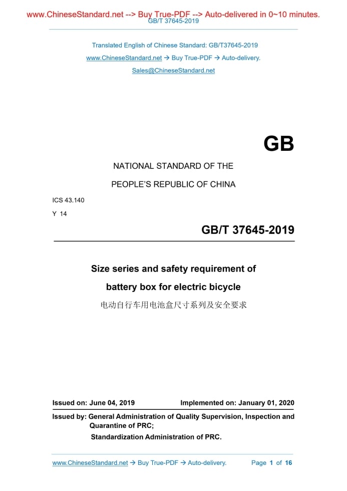 GB/T 37645-2019: Size series and safety requirement of battery box for electric bicycle Delivery: 9 seconds. True-PDF full-copy in English & invoice will be downloaded + auto-delivered via email. See step-by-step procedure Status: Valid