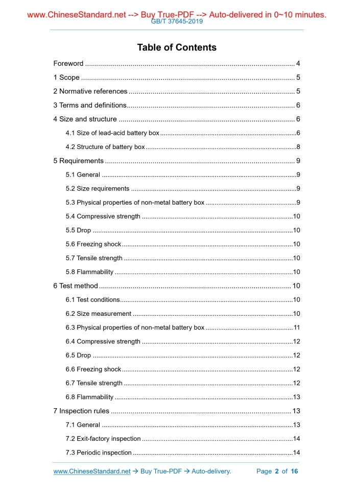 Similar standardsGB/T 37645-2019: Size series and safety requirement of battery box for electric bicycle---This is an excerpt. Full copy of true-PDF in English version (including equations, symbols, images, flow-chart, tables, and figures etc.), auto-downloaded/delivered in 9 seconds, can be purchased online: https://www.ChineseStandard.net/PDF.aspx/GBT37645-2019NATIONAL STANDARD OF THE PEOPLE’S REPUBLIC OF CHINA ICS 43.140 Y 14 Size series and safety requirement of battery box for electric bicycle ISSUED ON: JUNE 04, 2019 IMPLEMENTED ON: JANUARY 01, 2020 Issued by: General Administration of Quality Supervision, Inspection and Quarantine of PRC; Standardization Administration of PRC. Table of ContentsForeword ... 4 1 Scope ... 5 2 Normative references ... 5 3 Terms and definitions ... 6 4 Size and structure ... 6 4.1 Size of lead-acid battery box ... 6 4.2 Structure of battery box ... 8 5 Requirements ... 9 5.1 General ... 9 5.2 Size requirements ... 9 5.3 Physical properties of non-metal battery box ... 9 5.4 Compressive strength ... 10 5.5 Drop ... 10 5.6 Freezing shock ... 10 5.7 Tensile strength ... 10 5.8 Flammability ... 10 6 Test method ... 10 6.1 Test conditions ... 10 6.2 Size measurement ... 10 6.3 Physical properties of non-metal battery box ... 11 6.4 Compressive strength ... 12 6.5 Drop ... 12 6.6 Freezing shock ... 12 6.7 Tensile strength ... 12 6.8 Flammability ... 13 7 Inspection rules ... 13 7.1 General ... 13 7.2 Exit-factory inspection ... 14 7.3 Periodic inspection ... 14 7.4 Type inspection ... 15 Size series and safety requirement of battery box for electric bicycle1 ScopeThis standard specifies the terms and definitions, size and structure, requirements, test methods and inspection rules of battery boxes for electric bicycles. This standard applies to the size series and safety requirements of battery boxes for electric bicycles. Other types of battery boxes may refer to this standard.2 Normative referencesThe following documents are essential for the application of this document. For dated references, only the dated version applies to this document. For undated references, the latest version (including all amendments) applies to this document. GB/T 1633-2000 Plastics - Thermoplastic materials--Determination of Vicat softening temperature (VST) GB/T 2828.1-2012 Sampling procedures for inspection by attributes - Part 1: Sampling schemes indexed by acceptance quality limit (AQL) for lot-by-lot inspection GB/T 2829-2002 Sampling procedures and tables for periodic inspection by attributes (Apply to inspection of process stability) GB/T 5169.11-2006 Fire hazard testing for electric and electronic products - Part 11: Glowing/hot-wire based test methods - Glow-wire flammability test method for end-products GB/T 7141-2008 Plastics - Methods of heat aging GB/T 14152-2001 Pipes - Determination of resistance to external blows - Round - The clock method QB/T 4428 Specification and dimension of lithium-ion batteries for electric bicycle 3 - Charging base; 4 - Keyhole; 5 - Fuse; 6 - Hander; 7 - Wiring slot. Figure 5 -- Basic structure of battery box5 Requirements5.1 General The battery box for electric bicycles shall meet the relevant requirements for physical, mechanical, environmental, fire protection. 5.2 Size requirements 5.2.1 Sizes The size series of lead-acid battery box shall comply with the provisions of 4.1; the size series of lithium ion battery box shall meet the requirements of QB/T 4428. If there are special requirements, it shall be agreed between the supplier and the purchaser. 5.2.2 Wall thickness The wall thickness of the metal battery box shall be not less than 1.3 mm; the wall thickness of the non-metal battery box shall be not less than 2.5 mm. 5.3 Physical properties of non-metal battery box 5.3.1 Softening temperature Determine the softening temperature according to the method specified in 6.3.1. The softening temperature of the thermoplastic battery box shall not be lower than 100 °C. 5.3.2 Size change rate The size change rate of the thermoplastic battery box shall not be greater than ± 5%. 6.4 Compressive strength Use a rigid cylindrical end face with a diameter of 30 mm to apply a force of 250 N to the weakest positions at the top, bottom, side of the battery box; maintain this force for 60 s. Check the surface change of the battery box. 6.5 Drop Place the battery box (lowest point) at a height of 1000 mm from the ground. Drop it freely from the three directions of X, Y, Z to the concrete floor each time, to check the surface change of the battery box. 6.6 Freezing shock The impact tester and impact hammer shall meet the requirements of GB/T 14152-2001. The weight of the hammer is 1 kg. Put the battery box in a freezer which has a temperature of -20 °C ± 2 °C for 2 hours. Take it out and place it on an impact test bench. Let the weakest side of the battery box face up. At a vertical height of 700 mm from the impact point, drop the hammer freely, to check the change in the surface of the battery box. The operation from removing the battery box from the freezer to the end of the impact test shall be completed within 1 min. 6.7 Tensile strength 6.7.1 Overview There are two methods of tensile strength test: tensile force at room temperature and hot air aging tensile force. The test may be performed by either method. When the test results are in dispute, the arbitration test is carried out using the tensile force at room temperature. 6.7.2 Tensile force at room temperature Fix the battery box in a special clamp. At the position of 50 mm width at the middle of the hander, along the stressed direction of the hander, uniformly apply the tensile force F (as shown in Figure 7). For a battery box with a single hander, the tensile force F value is 3 times the gravity of the battery pack as allowed to be loaded in the battery box. For a battery box with double handers, the tensile force F value of each hander is 1.5 times the gravity of the battery pack as a