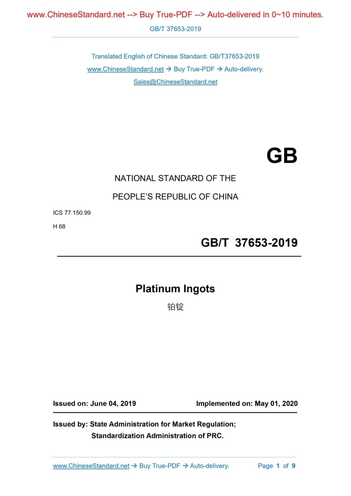 GB/T 37653-2019: Platinum ingots Delivery: 9 seconds. True-PDF full-copy in English & invoice will be downloaded + auto-delivered via email. See step-by-step procedure Status: Valid