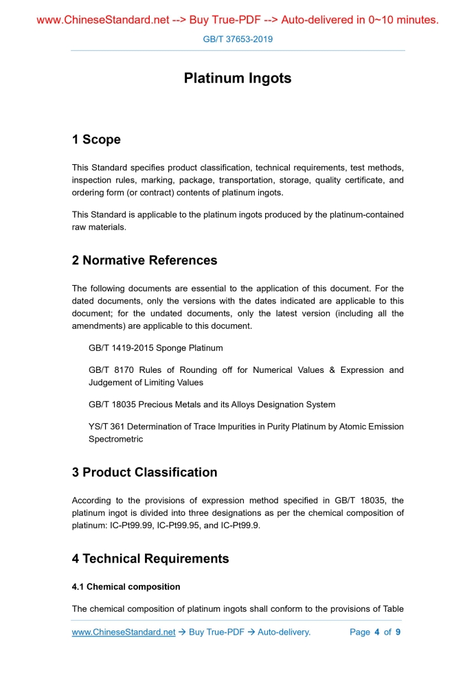 Similar standardsGB/T 37653-2019: Platinum ingots---This is an excerpt. Full copy of true-PDF in English version (including equations, symbols, images, flow-chart, tables, and figures etc.), auto-downloaded/delivered in 9 seconds, can be purchased online: https://www.ChineseStandard.net/PDF.aspx/GBT37653-2019NATIONAL STANDARD OF THE PEOPLE’S REPUBLIC OF CHINA ICS 77.150.99 H 68 Platinum Ingots 铂锭 ISSUED ON: JUNE 04, 2019 IMPLEMENTED ON: MAY 01, 2020 Issued by: State Administration for Market Regulation; Standardization Administration of PRC. Table of ContentsForeword ... 3 1 Scope ... 4 2 Normative References ... 4 3 Product Classification ... 4 4 Technical Requirements ... 4 5 Test Methods ... 6 6 Inspection Rules ... 6 7 Marking, Package, Transportation, Storage and Quality Certificate ... 8 8 Ordering Form (or Contract) Contents ... 9 Platinum Ingots1 ScopeThis Standard specifies product classification, technical requirements, test methods, inspection rules, marking, package, transportation, storage, quality certificate, and ordering form (or contract) contents of platinum ingots. This Standard is applicable to the platinum ingots produced by the platinum-contained raw materials.2 Normative ReferencesThe following documents are essential to the application of this document. For the dated documents, only the versions with the dates indicated are applicable to this document; for the undated documents, only the latest version (including all the amendments) are applicable to this document. GB/T 1419-2015 Sponge Platinum GB/T 8170 Rules of Rounding off for Numerical Values & Expression and Judgement of Limiting Values GB/T 18035 Precious Metals and its Alloys Designation System YS/T 361 Determination of Trace Impurities in Purity Platinum by Atomic Emission Spectrometric3 Product ClassificationAccording to the provisions of expression method specified in GB/T 18035, the platinum ingot is divided into three designations as per the chemical composition of platinum: IC-Pt99.99, IC-Pt99.95, and IC-Pt99.9.4 Technical Requirements4.1 Chemical composition The chemical composition of platinum ingots shall conform to the provisions of Table Figure 1 – Schematic Diagram of Sampling Points for Single Ingot 6.4.3 Use a 5mm~8mm drill bit to drill the platinum ingot; the drilling depth shall be no less than 2/3 for the ingot thickness. After conducting the magnet treatment against the drilled specimen, mix it evenly. Reduce it into 6 parts by quartering; each part is no less than 2g. 6.4.4 In order to avoid the surface contamination of the sample, before analyzing the sample, use 45°C~55°C hot hydrochloric acid (1+1) to immerse for 5min~10min. After washing by water, rinse with alcohol or acetone twice and dry in an oven at 105°C~110°C. 6.5 Judgment of the inspection results 6.5.1 The actually-measured value of the impurity element shall be rounded off to 3 significant figures after the decimal points according to GB/T 8170; it shall be expressed by the maximum limit value. 6.5.2 If the chemical composition is unqualified, such batch of products shall be judged to be unqualified. 6.5.3 If the appearance quality is unqualified, then such block of platinum ingot shall be judged to be unqualified. 6.4.4 When the weight or dimension are deviated, it shall not serve as the basis for judging whether it is qualified or not.7 Marking, Package, Transportation, Storage andQuality Certificate 7.1 Marking The surface of each block of platinum ingot shall be cast or printed with batch number, weight, trademark, and designation, etc. 7.2 Package Each block of platinum ingot shall be wrapped by clean paper or plastic film; then packed into the wooden or plastic boxes. 7.3 Transportation and storage The product shall not be damaged or contaminated during the transporting and storing periods. ......Source: Above contents are excerpted from the full-copy PDF -- translated/reviewed by: www.ChineseStandard.net / Wayne Zheng et al. Tips & Frequently Asked Questions:Question 1: How long will the true-PDF of English version of GB/T 37653-2019 be delivered?Answer: The full copy PDF of English version of GB/T 37653-2019 can be downloaded in 9 seconds, and it will also be emailed to you in 9 seconds (double mechanisms to ensure the delivery reliably), with PDF-invoice.Question 2: Can I share the purchased PDF of GB/T 37653-2019_English with my colleagues?Answer: Yes. The purchased PDF of GB/T 37653-2019_English will be deemed to be sold to your employer/organization who actually paid for it, including your colleagues and your employer's intranet.Question 3: Does the price include tax/VAT?Answer: Yes. Our tax invoice, downloaded/delivered in 9 seconds, includes all tax/VAT and complies with 100+ countries' tax regulations (tax exempted in 100+ countries) -- See Avoidance of Double Taxation Agreements (DTAs): List of DTAs signed between Singapore and 100+ countriesQuestion 4: Do you accept my currency other than USD?Answer: Yes. www.ChineseStandard.us -- GB/T 37653-2019 -- Click this link and select your country/currency to pay, the exact amount in your currency will be printed on the invoice. Full PDF will also be downloaded/emailed in 9 seconds.How to buy and download a true PDF of English version of GB/T 37653-2019?A step-by-step guide to download PDF of GB/T 37653-2019_EnglishStep 1: Visit website https://www.ChineseStandard.net (Pay in USD), or https://www.ChineseStandard.us (Pay in any currencies such as Euro, KRW, JPY, AUD).Step 2: Search keyword "GB/T 37653-2019". Step 3: Click "Add to Cart". If multiple PDFs are required, repeat steps 2 and 3 to add up to 12 PDFs to cart. Step 4: Select payment option (Via payment agents Stripe or PayPal). Step 5: Customize Tax Invoice -- Fill up your email etc. Step 6: Click "Checkout". Step 7: Make payment by credit card, PayPal, Google Pay etc. After the payment is completed and in 9 seconds, you will receive 2 emails attached with the purchased PDFs and PDF-invoice, respec