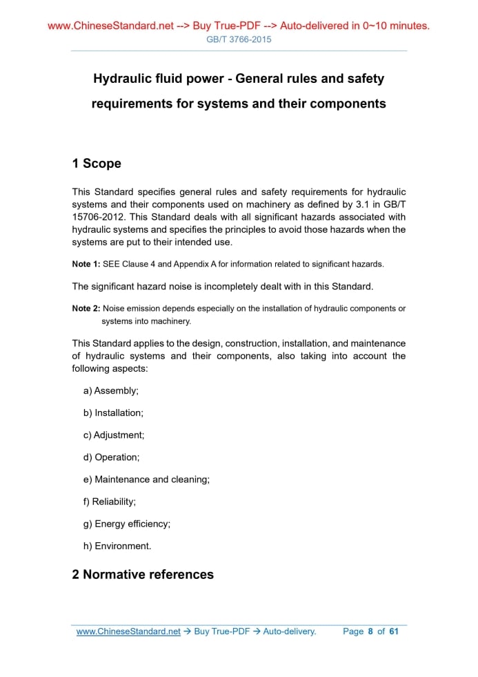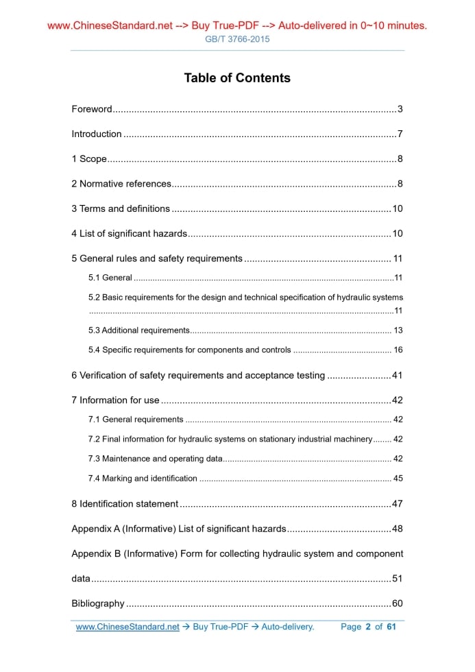 Similar standardsGB/T 3766-2015: Hydraulic fluid power -- General rules and safety requirements for systems and their components---This is an excerpt. Full copy of true-PDF in English version (including equations, symbols, images, flow-chart, tables, and figures etc.), auto-downloaded/delivered in 9 seconds, can be purchased online: https://www.ChineseStandard.net/PDF.aspx/GBT3766-2015 GB NATIONAL STANDARD OF THE PEOPLE’S REPUBLIC OF CHINA ICS 23.100.01 J 20 Replacing GB/T 3766-2001 Hydraulic fluid power - General rules and safety requirements for systems and their components (ISO 4413.2010, MOD) Issued on. DECEMBER 31, 2015 Implemented on. JULY 1, 2016 Issued by. General Administration of Quality Supervision, Inspection and Quarantine of the PRC; Standardization Administration of the PRC. Table of ContentsForeword... 3 Introduction... 7 1 Scope... 8 2 Normative references... 8 3 Terms and definitions... 10 4 List of significant hazards... 10 5 General rules and safety requirements... 11 5.1 General... 11 5.2 Basic requirements for the design and technical specification of hydraulic systems ... 11 5.3 Additional requirements... 13 5.4 Specific requirements for components and controls... 16 6 Verification of safety requirements and acceptance testing... 41 7 Information for use... 42 7.1 General requirements... 42 7.2 Final information for hydraulic systems on stationary industrial machinery... 42 7.3 Maintenance and operating data... 42 7.4 Marking and identification... 45 8 Identification statement... 47 Appendix A (Informative) List of significant hazards... 48 Appendix B (Informative) Form for collecting hydraulic system and component data... 51 Bibliography... 60ForewordThis Standard is drafted in accordance with the rules given in GB/T 1.1-2009. This Standard replaces GB/T 3766-2001 “Hydraulic Fluid Power - General Rules Relating to Systems”. As compared with GB/T 3766-2001, the main technical changes are as follows. - ADD reference standards GB/T 2878.1, GB/T 2878.2, GB/T 14048.14, GB/T 15706, GB 16754, GB/T 19671, GB/T 25133, ISO 1219-2, ISO 6149- 3, ISO 16874, ISO 17165-1 (SEE Clause 2); - DELETE reference standards GB/T 2514, GB/T 2877, GB 4208, GB/T 5226.1, GB/T 8098, GB/T 8010, GB/T 8101, JB/T 5244, JB/T 5963, ISO 4400, ISO 6149-1, ISO 6952, ISO 7790, ISO 8434-1, ISO 8434-2, ISO 8434-3, ISO 8434-4, ISO/TR 11688-1, ISO 12151-1, ISO 12151-2, ISO 12151-3, ISO 12151-4, ISO 12151-5 (SEE Clause 2 of the 2001 version); - ADD the content which shall be considered for valve selection and the requirements for “isolation valve” (SEE 5.4.4.1); - ADJUST some of the requirements for valve mounting (SEE 5.4.4.2); - ADD requirements for identification of “manifold” (SEE 5.4.4.3.5); - ADD the requirements for “level of contamination of hydraulic fluid” (SEE 5.4.5.1.3); - ADD the requirement of providing a “pan” for reservoir design (SEE 5.4.5.2.1); - ADD the requirement for the “structural integrity” of reservoirs (SEE 5.4.5.2.2.6); - ADD the “corrosion protection” requirement for reservoirs (SEE 5.4.5.2.2.7); - ADD “grounding” requirements for reservoirs (SEE 5.4.5.2.2.8); - ADD the requirement of “electromagnetic interference protection” for controls (SEE 5.4.7.6.1); - ADD the “contamination control” requirement for “diagnostics and monitoring” (SEE 5.4.8.5); - ADD the connection identification requirement for conductors (SEE 7.4.3.2). This Standard uses redraft law to modify and adopt ISO 4413.2010 “Hydraulic fluid power - General rules and safety requirements for systems and their components” (English version). The technical differences between this Standard and ISO 4413.2010 and their reasons are as follows. - About normative references, this Standard has made adjustments with technical differences, to adapt to the technical conditions of China. The adjustments are reflected in Clause 2 “Normative references”, as follows. REPLACE ISO 1219-1 with GB/T 786.1 identical to the international standard (SEE 7.4.1.1); REPLACE ISO 6149-1 with GB/T 2878.1 identical to the international standard (SEE 5.3.2.5.2); REPLACE ISO 6149-2 with GB/T 2878.2 which uses the international standard by modification (SEE 5.3.2.5.2); REPLACE ISO 4406 with GB/T 14039 which uses the international standard by modification (SEE 5.4.5.1.3, 7.3.1.1); REPLACE IEC 60947-5-5 with GB/T 14048.14 identical to the international standard (SEE 5.4.7.7.2); REPLACE ISO 12100 with GB/T 15706 identical to the international standard (SEE Clause 1, Clause 3, 5.1.1, 7.1, Table A.1); REPLACE ISO 13850 with GB/T 16754 identical to the international standard (SEE 5.4.7.7.2); REPLACE ISO 5598 with GB/T 17446 identical to the international standard (SEE Clause 3); REPLACE ISO 4021 with GB/T 17489 identical to the international standard (SEE 5.4.8.3); REPLACE ISO 13851 with GB/T 19671 which uses the international standard by modification (SEE 5.4.7.3.6); REPLACE ISO 23309 with GB/T 25133 identical to the international standard (SEE 5.4.7.4.4); - 5.4.1.7, ADD e), to cover more products for application; - 5.4.2.1, DELETE ISO/TS 13725.This document has been abolished; - b) of 5.4.5.1.2, CHANGE “fire-resistant hydraulic fluid” to “hydraulic fluid”; - g) of 5.4.5.2.1, ADD a narrative, to make the requirements more comprehensive; - g) of 5.4.5.2.2.4, ADD a narrative, to reflect the actual application requirements; - O) of 7.3.1.1, ADD “SEE 5.4.3”. This Standard also makes the following editorial changes. - 5.2.7f), after “energy isolation”, ADD “(e.g., disconnection of power, hydraulic sources)”, for easy understanding; - REORGANIZE the sub-clauses of 5.3.2, to make them consistent with the heading narrative order; SIMPLIFY the “Notes” of 5.3.2.3.2; - MODIFY the “Notes” of 5.4.2.12; - DELETE the statement “expressed in accordance with ISO 4406” in 5.4.5.3.1; - ADD 5.4.6.5.3.3, to incorporate and supplement the same statements in 5.4.6.5.3.1 and 5.4.6.5.3.2; - In Ap