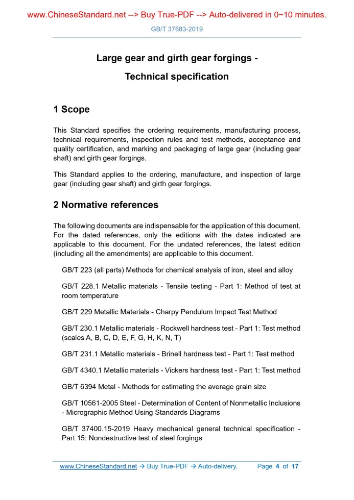 Similar standardsGB/T 37683-2019: Large gear and girth gear forgings - Technical specification---This is an excerpt. Full copy of true-PDF in English version (including equations, symbols, images, flow-chart, tables, and figures etc.), auto-downloaded/delivered in 9 seconds, can be purchased online: https://www.ChineseStandard.net/PDF.aspx/GBT37683-2019NATIONAL STANDARD OF THE PEOPLE’S REPUBLIC OF CHINA ICS 77.140.85 J 32 Large gear and girth gear forgings - Technical specification ISSUED ON: JUNE 04, 2019 IMPLEMENTED ON: JUNE 04, 2019 Issued by: State Administration for Market Regulation; Standardization Administration of the PRC. Table of ContentsForeword ... 3 1 Scope ... 4 2 Normative references ... 4 3 Ordering requirements ... 5 4 Manufacturing process ... 5 5 Technical requirements ... 6 6 Inspection rules and test methods ... 12 7 Acceptance and quality certification ... 16 8 Marking and packaging ... 17 Large gear and girth gear forgings - Technical specification1 ScopeThis Standard specifies the ordering requirements, manufacturing process, technical requirements, inspection rules and test methods, acceptance and quality certification, and marking and packaging of large gear (including gear shaft) and girth gear forgings. This Standard applies to the ordering, manufacture, and inspection of large gear (including gear shaft) and girth gear forgings.2 Normative referencesThe following documents are indispensable for the application of this document. For the dated references, only the editions with the dates indicated are applicable to this document. For the undated references, the latest edition (including all the amendments) are applicable to this document. GB/T 223 (all parts) Methods for chemical analysis of iron, steel and alloy GB/T 228.1 Metallic materials - Tensile testing - Part 1: Method of test at room temperature GB/T 229 Metallic Materials - Charpy Pendulum Impact Test Method GB/T 230.1 Metallic materials - Rockwell hardness test - Part 1: Test method (scales A, B, C, D, E, F, G, H, K, N, T) GB/T 231.1 Metallic materials - Brinell hardness test - Part 1: Test method GB/T 4340.1 Metallic materials - Vickers hardness test - Part 1: Test method GB/T 6394 Metal - Methods for estimating the average grain size GB/T 10561-2005 Steel - Determination of Content of Nonmetallic Inclusions - Micrographic Method Using Standards Diagrams GB/T 37400.15-2019 Heavy mechanical general technical specification - Part 15: Nondestructive test of steel forgings3 Ordering requirements3.1 The purchaser shall specify in the ordering contract the forging name, executed standard, material designation, quantity supplied, delivery state, and the corresponding technical requirements and inspection items specified by the supplier and the purchaser. 3.2 The purchaser shall provide the forging ordering drawings.4 Manufacturing process4.1 Melting Steel for forgings shall be melted in an electric furnace or converter and refined outside the furnace. With the consent of the purchaser, other melting methods which guarantee quality may also be used. 4.2 Forging 4.2.1 The nozzle and riser of the ingot shall have sufficient removal, to ensure that the forging product has no shrinkage cavity, looseness, severe segregation, and other harmful defects. 4.2.2 Forgings shall be forged and formed on forging equipment with sufficient capacity, to ensure that the entire section of the forging is thoroughly forged and evenly organized. 4.3 Heat treatment 4.3.1 After the forging is forged, the supplier shall perform normalizing and high temperature tempering treatment. 4.3.2 The normalizing temperature of carburized steel forgings shall be higher than the carburizing temperature. 4.3.3 The supplier may, according to the material designation of forging and the ordering technical requirements, perform performance heat treatment or carburizing heat treatment. 4.4 Machining 4.4.1 Forgings shall be roughed or semi-finished prior to quenching and tempering or carburizing heat treatment. 4.4.2 The dimensions, tolerances, and surface roughness of the forgings shall 5.3 Hardness When forgings are only required to be accepted according to hardness, the hardness deviation of the same forging does not exceed 40 HBW. However, when the mechanical properties of forgings are required at the same time, the absolute value of hardness is not used as the basis for acceptance. 5.4 Nondestructive testing 5.4.1 General requirements Forgings shall be free of defects such as white spots, cracks, folds, shrinkage cavities, severe segregation which affect the use performance and surface quality. 5.4.2 Ultrasonic testing Forgings shall be subjected to ultrasonic testing before tooth punching after roughing and heat treatment. The testing results within the range of 20 mm or 1.5mn (when the modulus mn >12) below the tooth and root shall meet the requirements of the quality grade II of Table 1 of GB/T 37400.15-2019. The testing results of the remaining positions shall meet the Grade IV requirements. 5.4.3 Magnetic particle testing When the ordering technical agreement or the ordering contract has the requirement for magnetic particle testing, the magnetic particle testing shall be carried out by the purchaser. The testing method and acceptance criteria shall meet the requirements of the ordering contract or the ordering technical agreement. 5.5 Metallographic structure 5.5.1 Grain size When the inspection of grain size is required, it shall be indicated in the ordering contract. The inherent grain size of carburized steel shall not be coarser than Grade 5.0. 5.5.2 Nonmetallic inclusions When it is required to inspect nonmetallic inclusions, it shall be indicated in the ordering contract. The A, B, C, and D nonmetallic inclusions of forgings shall not exceed Grade 2.5. deformation, the direction of the tensile and impact samples shall be axial (longitudinal). When the ordering technical agreement or ordering drawing requires a tangential or transv