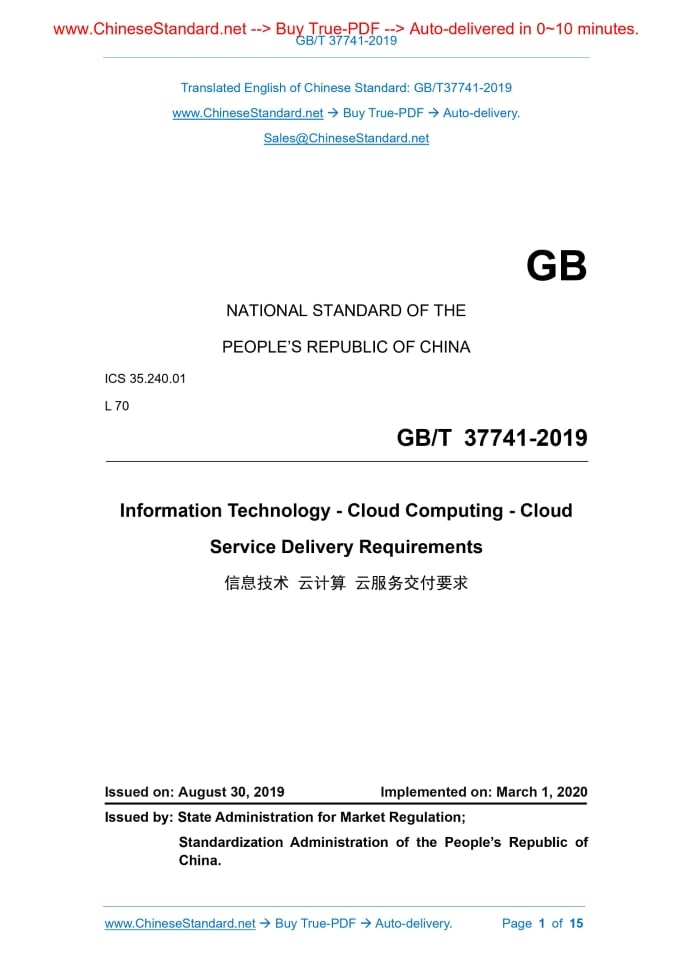 GB/T 37741-2019: Information Technology - Cloud Computing - Cloud Service Delivery Requirements Delivery: 9 seconds. True-PDF full-copy in English & invoice will be downloaded + auto-delivered via email. See step-by-step procedure Status: Valid