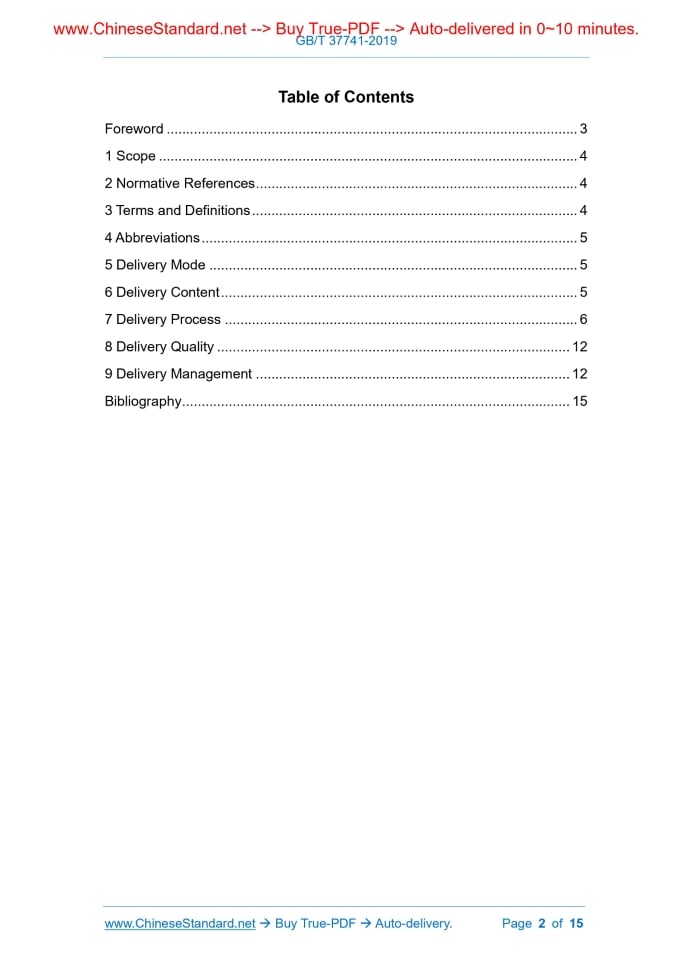 Similar standardsGB/T 37741-2019: Information Technology - Cloud Computing - Cloud Service Delivery Requirements---This is an excerpt. Full copy of true-PDF in English version (including equations, symbols, images, flow-chart, tables, and figures etc.), auto-downloaded/delivered in 9 seconds, can be purchased online: https://www.ChineseStandard.net/PDF.aspx/GBT37741-2019NATIONAL STANDARD OF THE PEOPLE’S REPUBLIC OF CHINA ICS 35.240.01 L 70 Information Technology - Cloud Computing - Cloud Service Delivery Requirements ISSUED ON: AUGUST 30, 2019 IMPLEMENTED ON: MARCH 1, 2020 Issued by: State Administration for Market Regulation; Standardization Administration of the People’s Republic of China. Table of ContentsForeword ... 3 1 Scope ... 4 2 Normative References ... 4 3 Terms and Definitions ... 4 4 Abbreviations ... 5 5 Delivery Mode ... 5 6 Delivery Content ... 5 7 Delivery Process ... 6 8 Delivery Quality ... 12 9 Delivery Management ... 12 Bibliography ... 15 Information Technology - Cloud Computing - Cloud Service Delivery Requirements1 ScopeThis Standard stipulates the modes, content, process, quality and management requirements for cloud service delivery. This Standard is applicable to: a) CSP’s evaluation and improvement of its own delivery capabilities; b) CSC and third-party institution’s evaluation and certification of CSP’s delivery capabilities.2 Normative ReferencesThe following documents are indispensable to the application of this document. In terms of references with a specified date, only versions with a specified date are applicable to this document. In terms of references without a specified date, the latest version (including all the modifications) is applicable to this document. GB/T 32400-2015 Information Technology - Cloud Computing - Overview and Vocabulary GB/T 36326-2018 Information Technology - Cloud Computing - General Operational Requirements of Cloud Service GB/T 37738-2019 Information Technology - Cloud Computing - Cloud Service Quality Evaluation Indicator3 Terms and DefinitionsWhat is defined in GB/T 32400-2015, and the following terms and definitions are applicable to this document. 3.1 Cloud Service Delivery Cloud service delivery refers to a series of process, in which, CSP provides basic services included in cloud computing and the supporting service tools to CSC. NOTE: it includes: migration of operations to cloud, service provision, customer service b) Provide stable, secure and elastic cloud service. c) Provide a complete cloud service catalog, which includes, but is not limited to: functions, specifications and prices, etc. d) Provide explicit CSLA definition of the content of cloud service. e) Provide self-service function, through which, CSC may independently carry out service purchase, activation, alteration and termination operations. f) Provide account management functions, through which, CSC may independently conduct business activities, such as: recharge, balance inquiry, consumption audit, invoice request and application for contract, etc. g) Provide complete cloud service assistance documentation. h) Provide the process of immigration and emigration, including process specification, technical support and data elimination, etc. i) Provide CSC service channel; provide consulting, technical support and complaint handling services, such as: call center and online system, etc. j) In accordance with its actual condition, CSP may also provide various professional services, which include, but are not limited to: 1) Consulting and design service; 2) Migration and deployment service; 3) Operation maintenance and management service; 4) Optimization and promotion service. k) Provide value-added service and differentiated service, such as: the provision of monthly product usage report, and suggestions on optimal allocation of resources.7 Delivery Process7.1 Migration of Operations to Cloud 7.1.1 Information collection Collect existing information of operation system; combine the results of previous demand analysis, provide sufficient basis to the design of delivery scheme. CSP shall: a) Clarify the content of information collection; satisfy the design requirements of delivery scheme; a) Review service resources; ensure that the capacity design requirements of CSC scheme are satisfied; b) In accordance with the scheme, allocate resources and configurate connections; verify necessary connectivity and basic functions; c) Assist CSC in the deployment of operation system; provide technical support. In terms of the migration of traditional operation system to the cloud, this process shall also include the following activities: a) Before the migration to the cloud, test and verify the functions and performance of the traditional operation system; b) In accordance with the migration scheme, conduct the migration of applications and data; c) In case of migration failure, in accordance with the rollback scheme, recover to the status of not affecting the operation. 7.1.4 Effect verification After deployment on the cloud is completed, CSP shall: a) Examine service readiness; ensure that cloud service purchased by CSC and the status of cloud service can satisfy the planning and contract requirements; b) Confirm the system architecture on the cloud; ensure thorough compliance with the design requirements of the deployment scheme, including network topology and connectivity, etc. Under the circumstance of hybrid cloud, it shall also be confirmed whether it meets the hybrid cloud connection scheme; c) Verify operation status; timely troubleshoot and deal with problems found during the verification process; make sure the operation is in a normal status; d) Complete deployment verification report; confirm operation status. 7.2 Service Provision 7.2.1 Service provision In the duration of contract, CSP shall: a) Provide automated management capabilities of the entire life cycle of cloud service, such as: application, allocation, operation, alteration and cancella