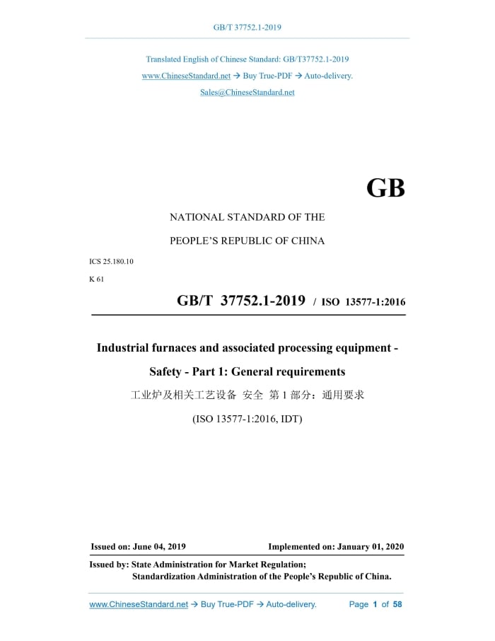 GB/T 37752.1-2019: Industrial furnaces and associated processing equipment -- Safety -- Part 1: General requirements Delivery: 9 seconds. True-PDF full-copy in English & invoice will be downloaded + auto-delivered via email. See step-by-step procedure Status: Valid