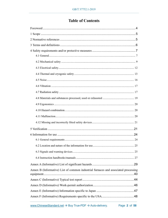Similar standardsGB/T 37752.1-2019: Industrial furnaces and associated processing equipment -- Safety -- Part 1: General requirements---This is an excerpt. Full copy of true-PDF in English version (including equations, symbols, images, flow-chart, tables, and figures etc.), auto-downloaded/delivered in 9 seconds, can be purchased online: https://www.ChineseStandard.net/PDF.aspx/GBT37752.1-2019 GB NATIONAL STANDARD OF THE PEOPLE’S REPUBLIC OF CHINA ICS 25.180.10 K 61 GB/T 37752.1-2019 / ISO 13577-1.2016 Industrial furnaces and associated processing equipment - Safety - Part 1.General requirements (ISO 13577-1.2016, IDT) Issued on. JUNE 04, 2019 Implemented on. JANUARY 01, 2020 Issued by. State Administration for Market Regulation; Standardization Administration of the People’s Republic of China. Table of ContentsForeword... 4 1 Scope... 5 2 Normative references... 5 3 Terms and definitions... 6 4 Safety requirements and/or protective measures... 7 4.1 General... 7 4.2 Mechanical safety... 9 4.3 Electrical safety... 12 4.4 Thermal and cryogenic safety... 13 4.5 Noise... 16 4.6 Vibration... 17 4.7 Radiation safety... 17 4.8 Materials and substances processed, used or exhausted... 19 4.9 Ergonomics... 20 4.10 Hazard combination... 20 4.11 Malfunction... 20 4.12 Missing and incorrectly fitted safety devices... 21 5 Verification... 21 6 Information for use... 24 6.1 General requirements... 24 6.2 Location and nature of the information for use... 25 6.3 Signals and warning devices... 25 6.4 Instruction handbooks/manuals... 27 Annex A (Informative) List of significant hazards... 29 Annex B (Informative) List of common industrial furnaces and associated processing equipment... 40 Annex C (Informative) Typical test report... 44 Annex D (Informative) Work-permit authorization... 46 Annex E (Informative) Information specific to Japan... 47 Annex F (Informative) Requirements specific to the USA... 48 Annex G (Informative) Requirements specific to the EU and associated countries... 51 Annex H (Informative) Requirements specific to Canada... 53 Annex I (Informative) Requirements specific to China... 54 Annex NA (Informative) List of Chinese documents that have consistent correspondence with the international documents normatively referenced in this Part ... 55 Bibliography... 56ForewordGB/T 37752, Industrial furnaces and associated processing equipment - Safety, is divided as follows. — Part 1.General requirements. This Part is Part 1 of GB/T 37752. This Part is drafted in accordance with the rules given in GB/T 1.1-2009. This Part is identical to ISO 13577-1.2016 Industrial furnaces and associated processing equipment - Safety - Part 1.General requirements by using the translation method. See Annex NA for Chinese documents that have consistent correspondence with the international documents normatively referenced in this Part. This Part makes the following editorial changes. — Change the unit “gal” in 4.1.2 to “cm/s2”; — Change the unit “bar” to “Pa”; — Add the informative annex NA. This Part was proposed by China Electrical Equipment Industry Association. This Part shall be under the jurisdiction of the National Technical Committee on Industrial Electro-heat Equipment of Standardization Administration of China (SAC/TC 121). Drafting organizations of this Part. Xi’an Electric Furnace Institute Co., Ltd., Chongqing CISDI Thermal & Environmental Engineering Co., Ltd., Shaanxi Hongxinyuan Metallurgical Equipment Industry Co., Ltd., Henan Tianli Thermal Equipment Co., Ltd., Zhuzhou Electric Cooker Factory, National Center for Quality Supervision and Test of Electric Furnace, Xi’an Flit Heat Treatment Co., Ltd. Main drafters of this Part. Ge Huashan, Li Kun, Yu Weijiang, Cheng Shuming, Li Mingke, Yang Zhen, Yan Xianbin, Zhang Yongwu, Yuan Fanglan, Yang Jia. Industrial furnaces and associated processing equipment - Safety - Part 1.General requirements1 ScopeThis Part of GB/T 37752 specifies the general safety requirements common to industrial furnaces and associated processing equipment (TPE).2 Normative referencesThe following documents are referred to in the text in such a way that some or all of their content constitutes requirements of this document. For dated references, only the edition cited applies. For undated references, the latest edition of the referenced document (including any amendments) applies. ISO 12100.2010, Safety of machinery - General principles for design - Risk assessment and risk reduction3 Terms and definitionsFor the purposes of this document, the terms and definitions given in ISO 12100 and ISO 13574 apply.4 Safety requirements and/or protective measuresThe manufacturer shall maintain evidence that all safety requirements of the design have been fulfilled.5 VerificationProof of compliance of the safety requirements and/or protective measures shall be demonstrated by any one, or a combination, of the following.6 Information for useWith this in view, it shall inform and warn the operator; the supervisor shall be notified and warned of residual risks. Requirements concerning where signals and warning devices shall be fitted are given in Clause 4.Annex A(Informative) List of significant hazards This annex lists all significant hazards, hazardous situations and events, as far as they are dealt with in this document, that are identified by risk assessment as significant for this type of equipment and that require action to eliminate or reduce the risk. The following significant hazards can occur in the use of TPE. ......Source: Above contents are excerpted from the full-copy PDF -- translated/reviewed by: www.ChineseStandard.net / Wayne Zheng et al. Tips & Frequently Asked Questions:Question 1: How long will the true-PDF of English version of GB/T 37752.1-2019 be delivered?Answer: The full copy PDF of English version of GB/T 37752.1-2019 can be downloaded in 9 seconds, and it will also be emailed to you in 9 seconds (double mechanisms to ensure the deliv