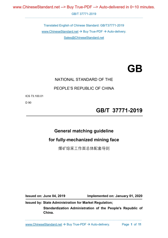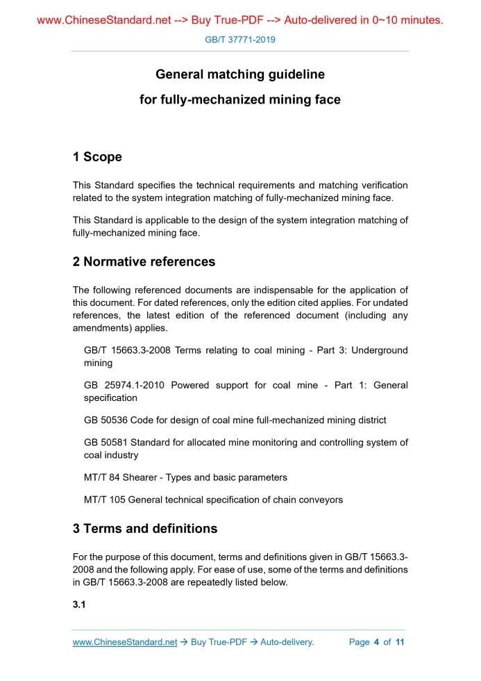 Similar standardsGB/T 37771-2019: General matching guideline for fully-mechanized mining face---This is an excerpt. Full copy of true-PDF in English version (including equations, symbols, images, flow-chart, tables, and figures etc.), auto-downloaded/delivered in 9 seconds, can be purchased online: https://www.ChineseStandard.net/PDF.aspx/GBT37771-2019NATIONAL STANDARD OF THE PEOPLE’S REPUBLIC OF CHINA ICS 73.100.01 D 90 General matching guideline for fully-mechanized mining face ISSUED ON: JUNE 04, 2019 IMPLEMENTED ON: JANUARY 01, 2020 Issued by: State Administration for Market Regulation; Standardization Administration of the People's Republic of China. Table of ContentsForeword ... 3 1 Scope ... 4 2 Normative references ... 4 3 Terms and definitions ... 4 4 Technical requirements ... 6 5 Matching verification ... 10 General matching guideline for fully-mechanized mining face1 ScopeThis Standard specifies the technical requirements and matching verification related to the system integration matching of fully-mechanized mining face. This Standard is applicable to the design of the system integration matching of fully-mechanized mining face.2 Normative referencesThe following referenced documents are indispensable for the application of this document. For dated references, only the edition cited applies. For undated references, the latest edition of the referenced document (including any amendments) applies. GB/T 15663.3-2008 Terms relating to coal mining - Part 3: Underground mining GB 25974.1-2010 Powered support for coal mine - Part 1: General specification GB 50536 Code for design of coal mine full-mechanized mining district GB 50581 Standard for allocated mine monitoring and controlling system of coal industry MT/T 84 Shearer - Types and basic parameters MT/T 105 General technical specification of chain conveyors3 Terms and definitionsFor the purpose of this document, terms and definitions given in GB/T 15663.3- 2008 and the following apply. For ease of use, some of the terms and definitions in GB/T 15663.3-2008 are repeatedly listed below. 3.1 working face. 3.8 left working face Standing on the head of the scraper conveyor, facing the tail of the scraper conveyor, the working face where the coal wall is located on the left-hand side. 3.9 right working face Standing on the head of the scraper conveyor, facing the tail of the scraper conveyor, the working face where the coal wall is located on the right-hand side. 3.10 system integration matching According to the coal seam occurrence conditions and mine design requirements, carry out the coordination design of the matching relationship of fully-mechanized mining face’s fully-mechanized mining equipment, liquid supply system, automatic control system, dust reduction system, power supply system, etc.4 Technical requirements4.1 General requirements 4.1.1 Fully-mechanized mining face’s system integration matching mainly consists of the selection of system related equipment such as coal mining, transportation, support, liquid supply, power supply and dust prevention of the working face AND the coordination design of matching relationship. At the same time, it shall meet the requirements of systems such as drainage, ventilation, fire prevention, monitoring of the working face. Fully-mechanized mining face mainly refers to the working face of fully-mechanized mining of thin seam, fully- mechanized mining in medium-thickness coal seam, fully-mechanized mining with large cutting height, fully-mechanized mining with super large mining height, fully-mechanized top coal caving, fully-mechanized mining with large cutting height and top coal caving, fully-mechanized mining with super large cutting height and top coal caving, fully-mechanized mining with large dip angle and fully-mechanized top coal caving with large dip angle. 4.1.2 The basic contents of fully-mechanized mining face’s system integration matching are shown in Figure 1. - Belt conveyor; - Liquid supply equipment; - Power supply equipment; - Dust prevention equipment; - Ventilation equipment; - Drainage equipment; - Monitoring equipment; - Other auxiliary equipment; - Equipment capacity accounting; - Integration matching verification. Figure 1 -- Basic contents of fully- mechanized mining face’s system integration matching 4.1.3 The results of fully-mechanized mining face’s system integration matching mainly consist of the equipment selection basis, process, results of fully- mechanized mining equipment, liquid supply system, power supply system, dust prevention system, etc. of the working face and matching relationship design drawings. 4.2 Basic requirements 4.2.1 The design of fully-mechanized mining face’s system integration matching shall be based on coal seam occurrence conditions, mining method selection, working face length, machine mining height, roadway section size, mine construction target, etc., and shall meet the relevant provisions of GB 50536. 4.2.2 The design of fully-mechanized mining face’s system integration matching shall be based on the basic principles of intrinsic safety, technical feasibility, economic rationality, equipment reliability and equipment technology forward- looking. 4.2.3 The design of fully-mechanized mining face’s system integration matching shall be matched with the design of overall system of the mine. 4.2.4 Fully-mechanized mining face shall be subjected to the system integration matching design before putting into production. 4.3 Equipment selection and system integration matching requirements 4.3.1 The technical parameters of fully-mechanized equipment and the matching auxiliary equipment such as liquid supply, power supply, drainage, ventilation, dust prevention, fire prevention and monitoring shall be adapted to the working face’s coal seam occurrence conditions, shall meet the requirements of the working face’s mining height, length, inclination, mine 4.3.5 The working face equipment of fully-mechanized mining with 