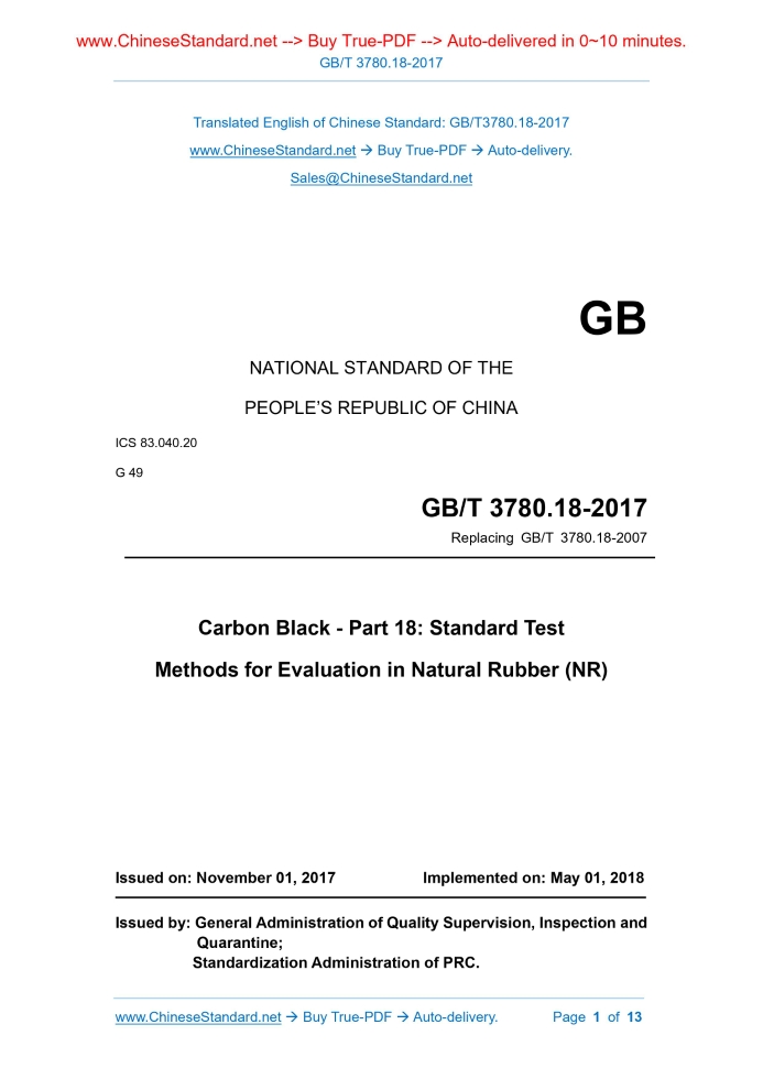 GB NATIONAL STANDARD OF THE PEOPLE’S REPUBLIC OF CHINA ICS 83.040.20 G 49 Replacing GB/T 3780.18-2007 Carbon Black - Part 18. Standard Test Methods for Evaluation in Natural Rubber (NR) Issued on: NOVEMBER 01, 2017 Implemented on: MAY 01, 2018 Issued by. General Administration of Quality Supervision, Inspection and Quarantine; Standardization Administration of PRC.