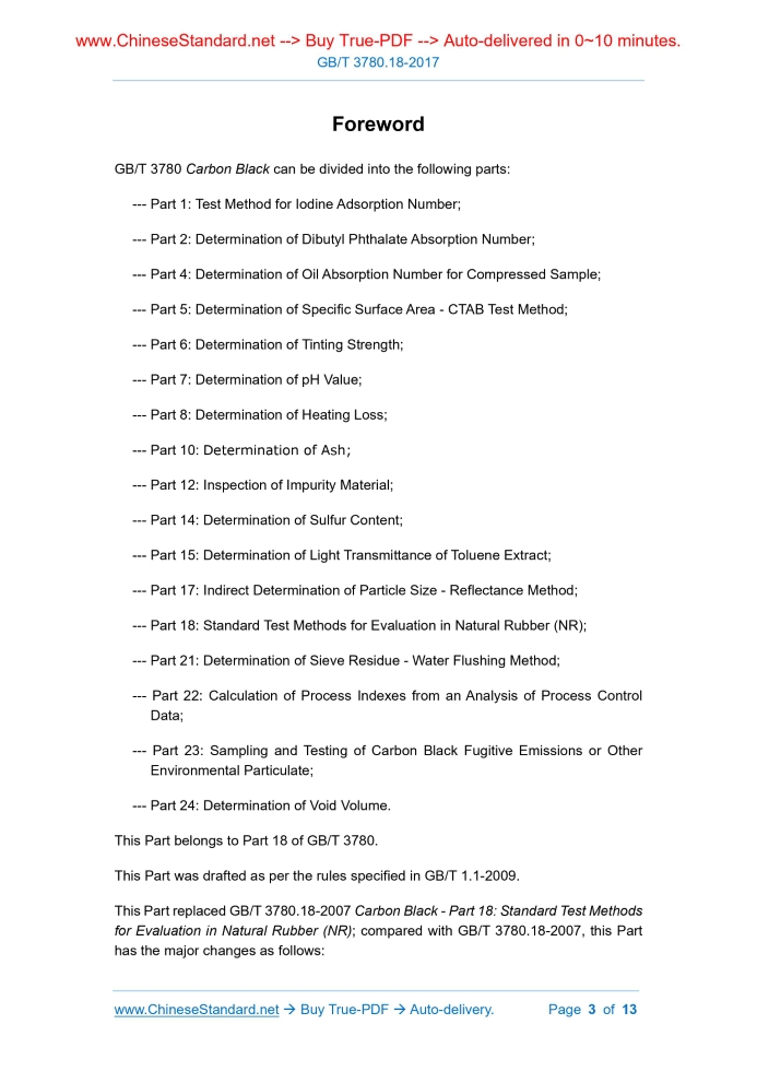 GB/T 3780 Carbon Black can be divided into the following parts. --- Part 1. Test Method for Iodine Adsorption Number; --- Part 2. Determination of Dibutyl Phthalate Absorption Number; --- Part 4. Determination of Oil Absorption Number for Compressed Sample; --- Part 5. Determination of Specific Surface Area - CTAB Test Method; --- Part 6. Determination of Tinting Strength; --- Part 7. Determination of pH Value; --- Part 8. Determination of Heating Loss; --- Part 10. Determination of Ash; --- Part 12. Inspection of Impurity Material; --- Part 14. Determination of Sulfur Content; --- Part 15. Determination of Light Transmittance of Toluene Extract; --- Part 17. Indirect Determination of Particle Size - Reflectance Method; --- Part 18. Standard Test Methods for Evaluation in Natural Rubber (NR); --- Part 21. Determination of Sieve Residue - Water Flushing Method; --- Part 22. Calculation of Process Indexes from an Analysis of Process Control Data; --- Part 23. Sampling and Testing of Carbon Black Fugitive Emissions or Other Environmental Particulate; --- Part 24. Determination of Void Volume. This Part belongs to Part 18 of GB/T 3780. This Part was drafted as per the rules specified in GB/T 1.1-2009. This Part replaced GB/T 3780.18-2007 Carbon Black - Part 18. Standard Test Methods for Evaluation in Natural Rubber (NR); compared with GB/T 3780.18-2007, this Part has the major changes as follows. Carbon Black - Part 18. Standard Test Methods for Evaluation in Natural Rubber (NR) WARNINGS. Personnel using this Part shall have practical working experience in the formal laboratory. This Part does not address all the possible security issues. The users are responsible to take appropriate safety and health measures; and ensure the compliance with conditions set by relevant national regulations.