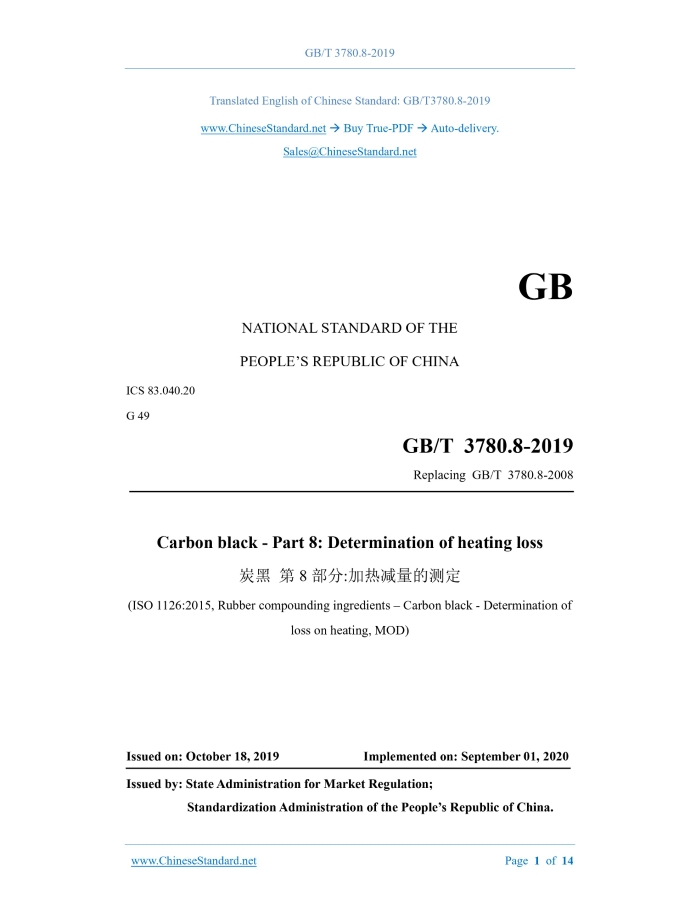 GB/T 3780.8-2019: Carbon black -- Part 8: Determination of heating loss Delivery: 9 seconds. True-PDF full-copy in English & invoice will be downloaded + auto-delivered via email. See step-by-step procedure Status: Valid GB/T 3780.8: Historical versions