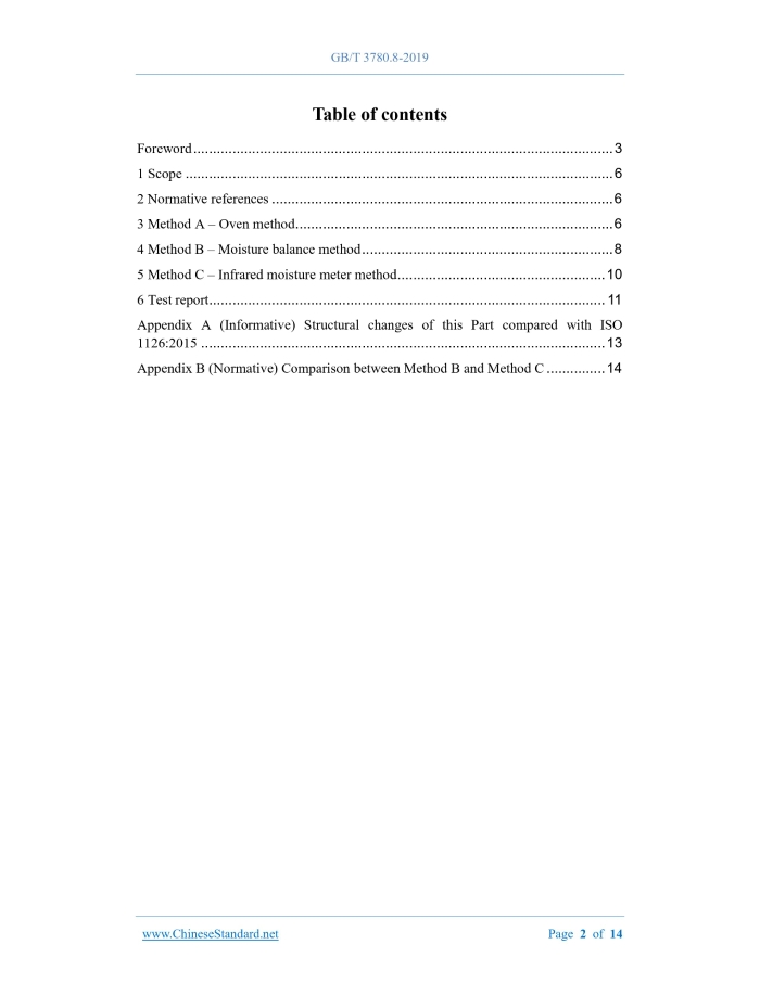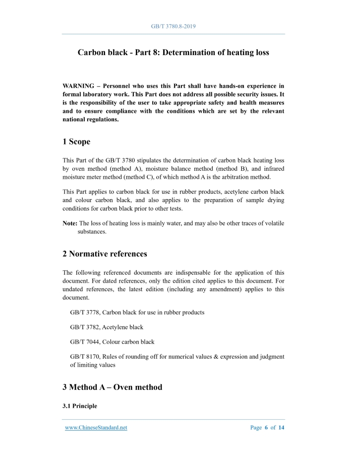 Similar standardsGB/T 3780.8-2019: Carbon black -- Part 8: Determination of heating loss---This is an excerpt. Full copy of true-PDF in English version (including equations, symbols, images, flow-chart, tables, and figures etc.), auto-downloaded/delivered in 9 seconds, can be purchased online: https://www.ChineseStandard.net/PDF.aspx/GBT3780.8-2019GB NATIONAL STANDARD OF THE PEOPLE’S REPUBLIC OF CHINA ICS 83.040.20 G 49 Replacing GB/T 3780.8-2008 Carbon black - Part 8: Determination of heating loss (ISO 1126:2015, Rubber compounding ingredients – Carbon black - Determination of loss on heating, MOD) ISSUED ON: OCTOBER 18, 2019 IMPLEMENTED ON: SEPTEMBER 01, 2020 Issued by: State Administration for Market Regulation; Standardization Administration of the People’s Republic of China. Table of ContentsForeword ... 3 1 Scope ... 6 2 Normative references ... 6 3 Method A – Oven method ... 6 4 Method B – Moisture balance method ... 8 5 Method C – Infrared moisture meter method ... 10 6 Test report... 11 Appendix A (Informative) Structural changes of this Part compared with ISO 1126:2015 ... 13 Appendix B (Normative) Comparison between Method B and Method C ... 14 Carbon black - Part 8: Determination of heating loss WARNING – Personnel who uses this Part shall have hands-on experience in formal laboratory work. This Part does not address all possible security issues. It is the responsibility of the user to take appropriate safety and health measures and to ensure compliance with the conditions which are set by the relevant national regulations.1 ScopeThis Part of the GB/T 3780 stipulates the determination of carbon black heating loss by oven method (method A), moisture balance method (method B), and infrared moisture meter method (method C), of which method A is the arbitration method. This Part applies to carbon black for use in rubber products, acetylene carbon black and colour carbon black, and also applies to the preparation of sample drying conditions for carbon black prior to other tests. Note: The loss of heating loss is mainly water, and may also be other traces of volatile substances.2 Normative referencesThe following referenced documents are indispensable for the application of this document. For dated references, only the edition cited applies to this document. For undated references, the latest edition (including any amendment) applies to this document. GB/T 3778, Carbon black for use in rubber products GB/T 3782, Acetylene black GB/T 7044, Colour carbon black GB/T 8170, Rules of rounding off for numerical values & expression and judgment of limiting values3 Method A – Oven method3.1 Principle Spread a certain amount of carbon black evenly on the bottom of the weighing bottle; heat it in an oven at 125 °C for 1 h; then, place the weighing bottle in a desiccator to cool to room temperature and weigh; calculate the heating loss. 3.2 Instruments and equipment 3.2.1 Oven, gravitational convection, temperature controlled at (125±1) °C, temperature uniformity ≤ ±5 °C. 3.2.2 Weighing bottle, short, 30 mm in height, 60 mm in diameter, equipped with a ground glass cover. When the test requires more samples, an open container shall be used, and the sample thickness shall not exceed 10 mm during the heating process. 3.2.3 Analytical balance, resolution of 0.1 mg. 3.2.4 Desiccator, equipped with an effective desiccant. 3.3 Sample 3.3.1 Different types of carbon black shall be sampled according to the provisions of GB/T 3778, GB/T 3782 or GB/T 7044, respectively. 3.3.2 The collected samples shall be placed in a closed sample container, and the samples shall be brought to room temperature before the test. 3.4 Test steps 3.4.1 Perform two tests in parallel. 3.4.2 Put the weighing bottle and the cap in an oven at 125 °C; open the cap and dry for 30 minutes. Then, move the weighing bottle and the cap into a desiccator and cool to room temperature. Weigh the mass (m0) of the bottle and the cap, accurate to 0.1 mg. 3.4.3 Spread about 2 g of carbon black for use in rubber products or colour carbon black (1 g of acetylene carbon black or powdered carbon black) evenly on the bottom of the weighing bottle; cover and weigh (m1), accurate to 0.1 mg. 3.4.4 Put the sample weighed in 3.4.3 into the oven; uncover; dry at 125 °C for 1 h. 3.4.5 Cover the weighing bottle cap and transfer it to a desiccator; remove the cap and cool to room temperature; cover the cap and re-weigh (m2), accurate to 0.1 mg. When taking the weighing bottle out of the oven or desiccator, or during the transfer process, the bottle cap shall be covered to avoid loss of carbon black due to air flow. 3.5 Test data processing 4.3 Sample 4.3.1 Different types of carbon black shall be sampled according to the provisions of GB/T 3778, GB/T 3782 and GB/T 7044, respectively. 4.3.2 The collected samples shall be placed in a closed sample container, and the samples shall be brought to room temperature before the test. 4.4 Test steps 4.4.1 Install the moisture balance according to the instrument manual, and set the temperature to 125 °C. At the set temperature, dry the empty weighing plate for 30 min and cool to room temperature before proceeding to the sample determination. 4.4.2 Spread about 10 g of carbon black for use in rubber products or colour carbon black (2 g of acetylene carbon black or powdered carbon black) evenly on the weighing plate of the moisture balance, and weigh the mass (m3), accurate to 1 mg. 4.4.3 Gently close the upper cover of the moisture balance, and start the instrument to start heating the sample. 4.4.4 Under this drying condition, after continuing to dry for a period of time, if the mass change displayed on the moisture balance display within 30 s is less than 1 mg, the sample has been dried, stop heating and record the mass value (m4) on the display. 4.5 Test data processing 4.5.1 The heating loss H of carbon black is expressed in mass fraction, and the value is expressed in percentage (%), cal