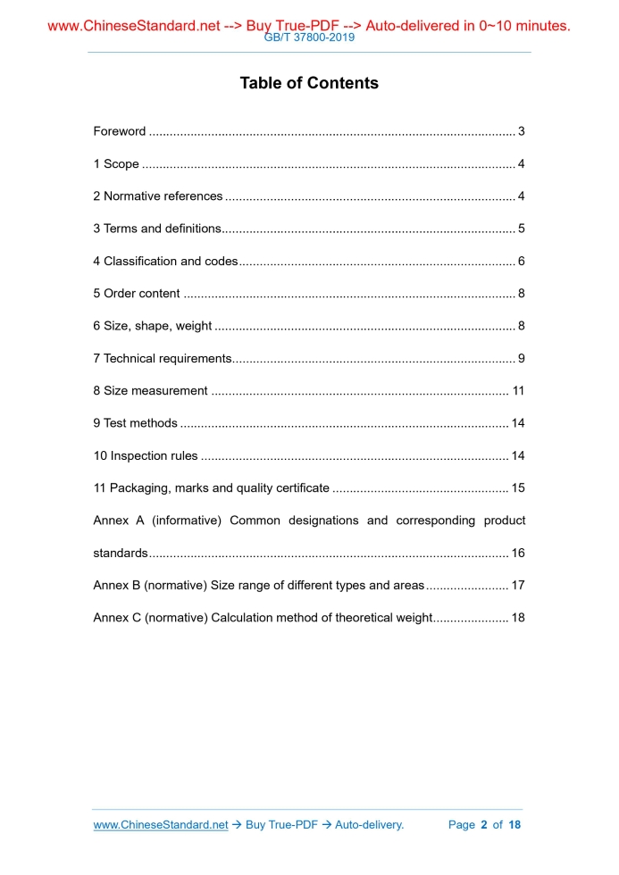 Similar standardsGB/T 37800-2019: Hot rolled longitudinally profiled steel plate---This is an excerpt. Full copy of true-PDF in English version (including equations, symbols, images, flow-chart, tables, and figures etc.), auto-downloaded/delivered in 9 seconds, can be purchased online: https://www.ChineseStandard.net/PDF.aspx/GBT37800-2019NATIONAL STANDARD OF THE PEOPLE’S REPUBLIC OF CHINA ICS 77.140.50 H 46 Hot rolled longitudinally profiled steel plate ISSUED ON: AUGUST 30, 2019 IMPLEMENTED ON: JULY 01, 2020 Issued by: State Administration for Market Regulation; Standardization Administration of the People's Republic of China. Table of ContentsForeword ... 3 1 Scope ... 4 2 Normative references ... 4 3 Terms and definitions ... 5 4 Classification and codes ... 6 5 Order content ... 8 6 Size, shape, weight ... 8 7 Technical requirements ... 9 8 Size measurement ... 11 9 Test methods ... 14 10 Inspection rules ... 14 11 Packaging, marks and quality certificate ... 15 Annex A (informative) Common designations and corresponding product standards ... 16 Annex B (normative) Size range of different types and areas ... 17 Annex C (normative) Calculation method of theoretical weight ... 18 Hot rolled longitudinally profiled steel plate1 ScopeThis Standard specifies the terms and definitions, classification and codes, order content, dimensions, shape, weight, technical requirements, dimensional measurements, test methods, inspection rules, packaging, marks and quality certificates of hot rolled longitudinally profiled steel plate. This Standard is applicable to the hot rolled longitudinally profiled steel plate of general structure and of which the engineering thickness is 10mm~400mm (hereinafter referred to as LP steel plate).2 Normative referencesThe following referenced documents are indispensable for the application of this document. For dated references, only the edition cited applies. For undated references, the latest edition of the referenced document (including any amendments) applies. GB/T 222, Method of sampling steel for determination of chemical composition and permissible variations for product analysis GB/T 247, General rule of package mark and certification for steel plates (sheets) and strips GB/T 699, Quality carbon structural steels GB/T 700, Carbon structural steels GB/T 711, Hot-rolled Quality Carbon Structural Steel Plates, Sheets and Wide Strips GB/T 712, Ship and ocean engineering structural steel GB/T 713, Steel plates for boilers and pressure vessels GB/T 714, Structural steel for bridge GB/T 1591, High strength low alloy structural steels GB/T 2970, Method for ultrasonic testing of thicker steel plates GB/T 3077, Alloy structure steels The part of variable thickness of which the upper and lower surfaces are not parallel in LP steel plate. 3.4 slope The half thickness of the thick end of variable thickness section of LP steel plate minus the half thickness of the thin end and then divided by the length of variable thickness section. Example: The slope of Type 01 LP steel plate k=(h2/2-h1/2)/L1. 3.5 nominal thickness of longitudinally profiled steel plate The nominal thickness of each equal thickness section of LP steel plate. 3.6 thickness tolerance of longitudinally profiled steel plate The allowable deviation of thickness of each equal thickness section of LP steel plate.4 Classification and codes4.1 Types There are ten types of LP steel plate. The type models are01~10. See Figure 1 for corresponding shape of each type. Agreed by the supplier and the purchaser, other types of LP steel plates can be supplied. 4.2 Expression methods for designations The designation of LP steel plate consists of three parts: steel designation of product standard, LP steel plate code (LP) and type number of LP steel plate. See Annex A for steel designations of common product standards. Example: Q345GJC-LP01 Q345GJC -- Designation in GB/T 19879; LP -- Code of LP steel plate; 01 -- LP steel plate of which the type is 01. 6.1.1 The size range of LP steel plate shall comply with the following provisions: a) Nominal thickness of LP steel plate: 10mm~400mm; b) Nominal width of LP steel plate: 900mm~5200mm; c) Nominal length of LP steel plate: 2000mm~25000mm; d) Maximum thickness change rate of thickened section of LP steel plate: 8mm/m (equivalent to slope of 0.004); e) Maximum thickness difference of LP steel plate: 45mm. 6.1.2 See Annex B for the size range of different types and areas. 6.2 Size and tolerance The size deviation of each segment of LP steel plate shall meet the requirements of the corresponding product standards. Measure the head and tail of each thickened segment for the thickness of LP steel plate. If the head and tail of the thickened segment are connected to the equal-thickness segment, it can use the thickness of the equal-thickness segment to replace. 6.3 Shape The shape deviation of LP steel plate shall meet the requirements of the corresponding product standards. 6.4 Weight LP steel plate is delivered in theoretical weight. See Annex C for the calculation method of theoretical weight. Agreed by the supplier and the purchaser, it can also use other theoretical weight calculation methods.7 Technical requirements7.1 Chemical composition 7.1.1 The chemical composition of each designation of LP steel plate shall comply with the provisions of GB/T 699, GB/T 700, GB/T 711, GB/T 712, GB/T 713, GB/T 714, GB/T 1591, GB/T 3077, GB/T 3274, GB/T 11251, GB/T 19879, GB/T 28410, GB/T 28415, GB/T 28905 or GB/T 28907, GB/T 31944 or GB/T 34560.5. Agreed by the supplier and the purchaser, the chemical composition specified in other product standards can also be used. 7.1.2 When the purchaser requires to guarantee the performance of the steel plate in the thickness direction, the S content shall meet the requirements of GB/T 5313. 7.1.3 The allowable deviation of the chemical composition of the finished steel sheet shall meet the requirements of GB/T 222. 7.2 Delivery state The delivery s