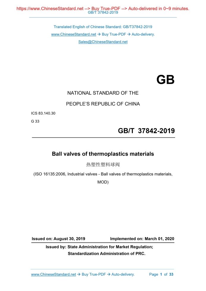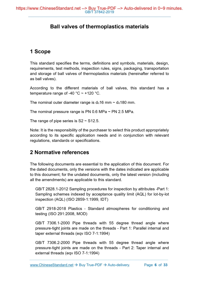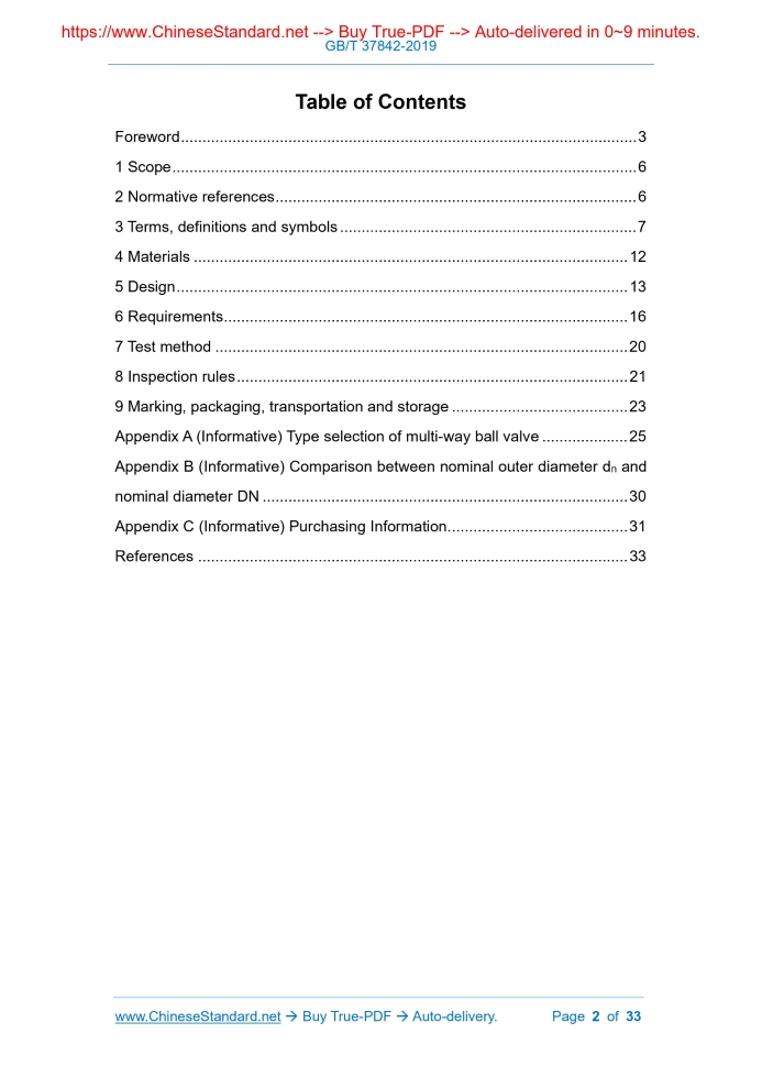 Similar standardsGB/T 37842-2019: Ball valves of thermoplastics materials---This is an excerpt. Full copy of true-PDF in English version (including equations, symbols, images, flow-chart, tables, and figures etc.), auto-downloaded/delivered in 9 seconds, can be purchased online: https://www.ChineseStandard.net/PDF.aspx/GBT37842-2019GB NATIONAL STANDARD OF THE PEOPLE’S REPUBLIC OF CHINA ICS 83.140.30 G 33 Ball valves of thermoplastics materials (ISO 16135.2006, Industrial valves - Ball valves of thermoplastics materials, MOD) Issued on. AUGUST 30, 2019 Implemented on. MARCH 01, 2020 Issued by. State Administration for Market Regulation; Standardization Administration of PRC. Table of ContentsForeword... 3 1 Scope... 6 2 Normative references... 6 3 Terms, definitions and symbols... 7 4 Materials... 12 5 Design... 13 6 Requirements... 16 7 Test method... 20 8 Inspection rules... 21 9 Marking, packaging, transportation and storage... 23 Appendix A (Informative) Type selection of multi-way ball valve... 25 Appendix B (Informative) Comparison between nominal outer diameter dn and nominal diameter DN... 30 Appendix C (Informative) Purchasing Information... 31 References... 33ForewordThis standard was drafted in accordance with the rules given in GB/T 1.1-2009. This standard uses the redrafting method to modify and adopt ISO 16135.2006 "Industrial valves - Ball valves of thermoplastics materials". Compared with ISO 16135.2006, this standard has the following structural changes. - In Terms and definitions, ADD "Symbols" (see 3.4); - DIVIDE Chapter 4 "Requirements" of ISO 16135.2006 into "Materials", "Design", "Requirements" of this standard (see Chapter 4 ~ Chapter 6); - DELETE the content of 4.7.2 and 4.8 in ISO 16135.2006; - DIVIDE Chapter 5 "Inspection procedure" of ISO 16135.2006 into "Test method" and "Inspection rules" (see Chapter 7 and Chapter 8); - DELETE Chapter 6 of ISO 16135.2006; - COMBINE Chapter 7 "Marking" and Chapter 8 "Transport and storage" of ISO 16135.2006 into "Marking, packaging, transport and storage" (see Chapter 9); - ADJUST Appendix B of ISO 16135.2006 to Appendix A (see Appendix A); - ADD the comparison between the nominal outer diameter dn and the nominal diameter DN (see Appendix B); - ADJUST Appendix A of ISO 16135.2006 to Appendix C (see Appendix C). Compared with ISO 16135.2006, the main technical differences of this standard and the reasons are as follows; - DELETE the pressure class (see Chapter 1); ADOPT metric units uniformly; - Regarding normative references, this standard has adjusted the specific technical differences, to adapt to China's technical conditions. The adjustments are collectively reflected in Chapter 2 "Normative references"; the specific adjustments are as follows. • USE GB/T 7306.1-2000 and GB/T 7306.2-2000 which equivalently adopt international standards to replace ISO7-1.1994 (see 6.3.1.3); • USE GB/T 12223-2005 which modifies and adopts international standard to replace ISO 5211.2001 (see 5.3.2); • USE GB/T GB/T 27726-2011 which modifies and adopts international standard to replace ISO 9393-2.2005 (see 6.4); • USE Appendix A of GB/T 28494-2012 which modifies and adopts international standard to replace EN 12570.2000 (see 5.4.2); • USE Appendix B of GB/T 28494-2012 which modifies and adopts international standard to replace ISO 8233-1998 (see 7.8); • USE Appendix C of GB/T 28494-2012 which modifies and adopts international standard to replace ISO 8659.1999 (see 7.9); • DELETE the ISO 228-1.2000, ISO 898-1.1999, ISO/TR 10358.1993, ISO 12092.2000, ISO 12162.1995, EN 558-1.1995, EN 558-2 that are not cited in the standard.1995, EN 736-1.1995, EN736-2.1997, EN 736- 3.1999, EN 1092-1.2001, EN 1267.1997, EN 1759-1.2004, EN 12107.1997, EN 12266-1.2003 which are not cited in the standard; • ADD reference to GB/T 2828.1-2012 (see 8.3.2); • ADD reference to GB/T 2918-2018 (see 7.1); • ADD reference to GB/T 8806-2008 (see 7.3); • ADD reference to GB/T 17219 (see 6.11); • ADD reference to GB/T 19278-2018 (see Chapter 3); • ADD reference to GB/T 21300-2007 (see 7.10); • ADD reference to GB/T 30832-2014 (see 7.6); - ADD the shell material requirements of the "polyphenylene ether (PPO/PPE), polyphenylene sulfone (PPSU), polyamide (PA)" (see 4.1); - MODIFY the requirements of 4.1.2.2c) in ISO 16135.2006; CHANGE it into that according to the definition of terms in GB/T 19278-2018, provide the dimensional requirements of clearway valves, full bore valves, reduced bore valves (see 6.3.2); - INCREASE the number of cycles of fatigue strength of ball valves with dn < 63 mm from 5000 to 15000; the number of cycles of fatigue strength of ball valves with dn ≥ 63 mm is 5000, which is consistent with ISO 16135.2006 (see 6.9). This standard has made the following editorial changes. - MODIFY the standard name to "Ball valves of thermoplastics materials"; - Specifications and sizes are expressed by the nominal outer diameter dn (see Chapter 1); - This part incorporates the revised content of ISO 16135.2006/FD Amd 1, which revised the derating factor fr. The clauses involved in these revisions have been marked by the vertical double line (||) on the outer margin of the margin. (See Table 1 in 4.3.2). Please note that some of the contents of this document may involve patents. The issuing agency of this document is not responsible for identifying these patents. This standard was proposed by the China National Light Industry Council. This standard shall be under the jurisdiction of the National Standardization Technical Committee for Plastic Products (SAC/TC 48). The main drafting organizations of this standard. Shanghai Sanshan Xinbang Technology Co., Ltd., Beijing Building Materials Inspection and Research Institute Co., Ltd. (National Water-saving Appliance Product Quality Supervision and Inspection Center), Shijiazhuang Development Zone Zhongshi Testing Equipment Co., Ltd., Chengde Precision Testing Machine Co., Ltd., Zhejiang Zhongcai P