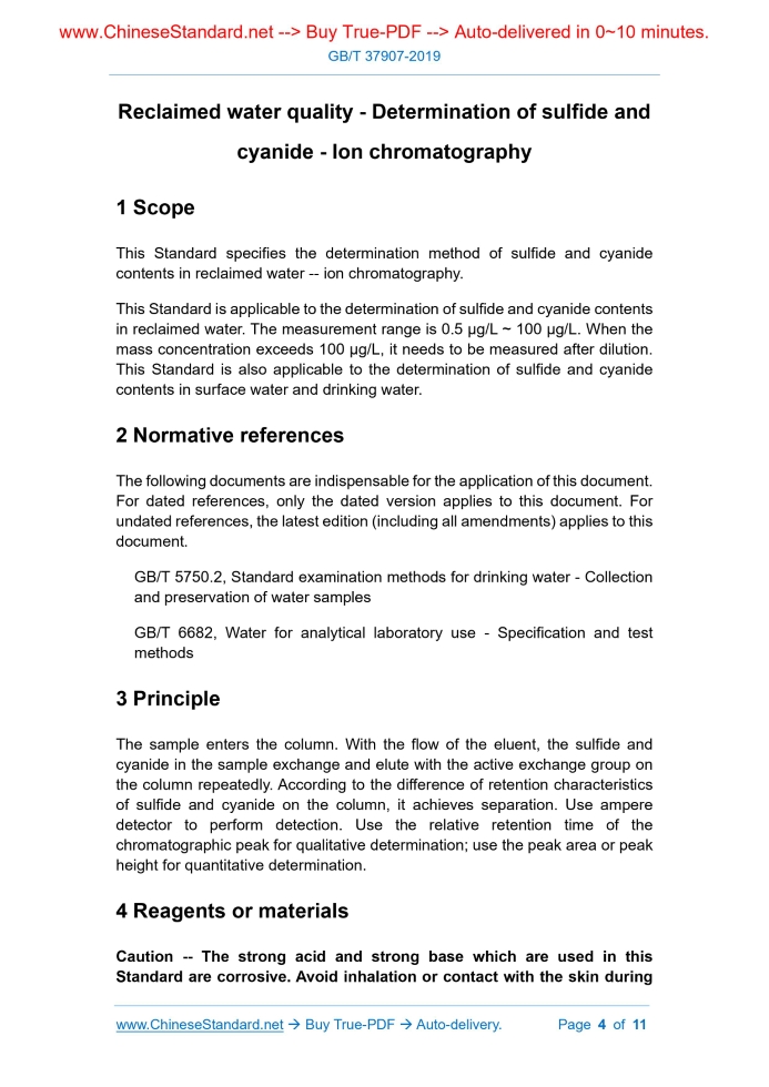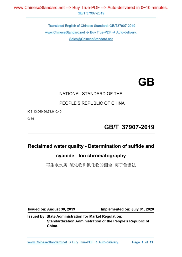 GB/T 37907-2019: Reclaimed water quality - Determination of sulfide and cyanide - Ion chromatography Delivery: 9 seconds. True-PDF full-copy in English & invoice will be downloaded + auto-delivered via email. See step-by-step procedure Status: Valid