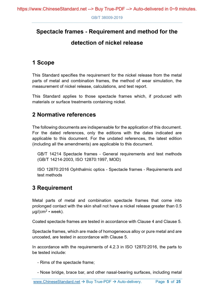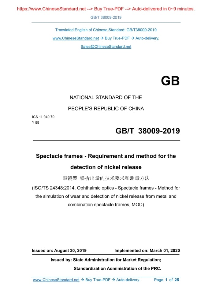 GB/T 38009-2019: Spectacle frames - Requirement and method for the detection of nickel release Delivery: 9 seconds. True-PDF full-copy in English & invoice will be downloaded + auto-delivered via email. See step-by-step procedure Status: Valid