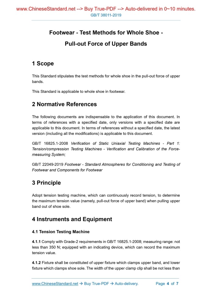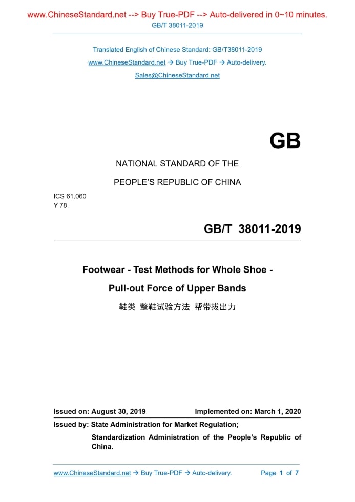 GB/T 38011-2019: Footwear - Test methods for whole shoe - Pull-out force of upper bands Delivery: 9 seconds. True-PDF full-copy in English & invoice will be downloaded + auto-delivered via email. See step-by-step procedure Status: Valid