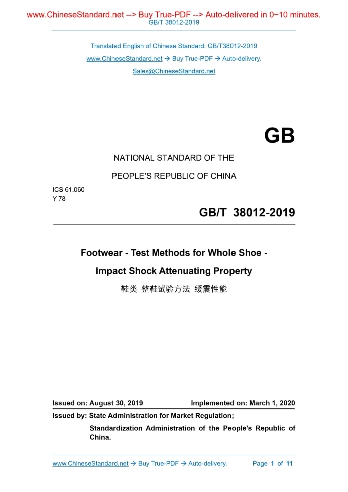 GB/T 38012-2019: Footwear - Test Methods for Whole Shoe - Impact Shock Attenuating Property Delivery: 9 seconds. True-PDF full-copy in English & invoice will be downloaded + auto-delivered via email. See step-by-step procedure Status: Valid
