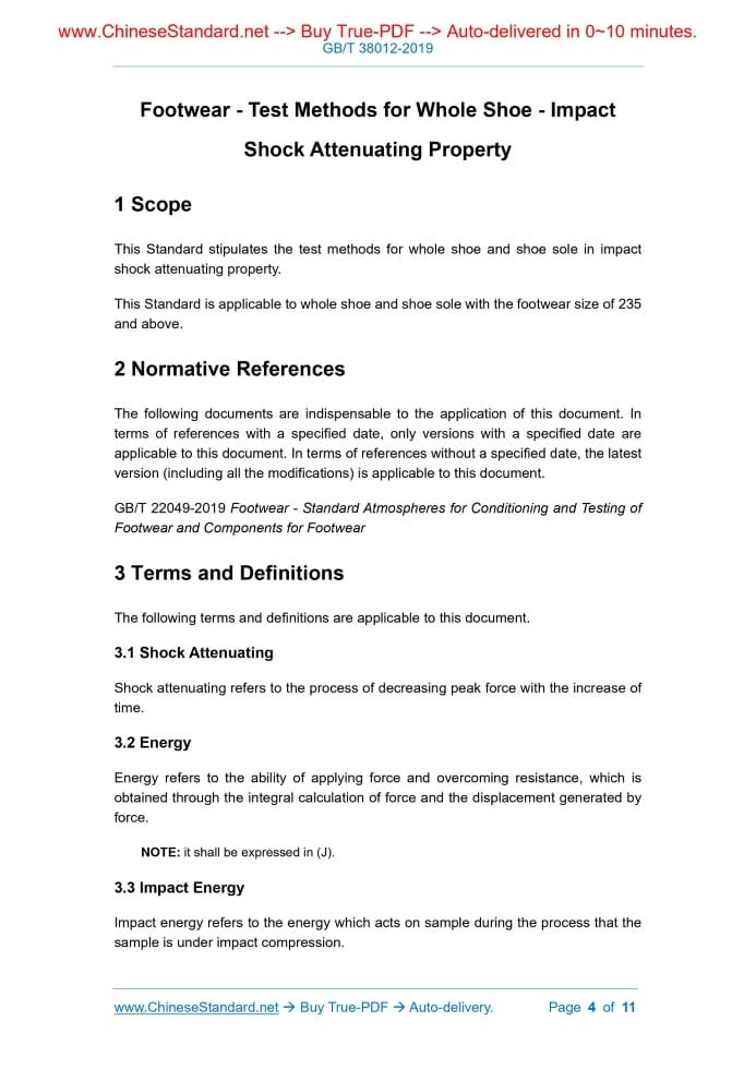 Similar standardsGB/T 38012-2019: Footwear - Test Methods for Whole Shoe - Impact Shock Attenuating Property---This is an excerpt. Full copy of true-PDF in English version (including equations, symbols, images, flow-chart, tables, and figures etc.), auto-downloaded/delivered in 9 seconds, can be purchased online: https://www.ChineseStandard.net/PDF.aspx/GBT38012-2019NATIONAL STANDARD OF THE PEOPLE’S REPUBLIC OF CHINA ICS 61.060 Y 78 Footwear - Test Methods for Whole Shoe - Impact Shock Attenuating Property ISSUED ON: AUGUST 30, 2019 IMPLEMENTED ON: MARCH 1, 2020 Issued by: State Administration for Market Regulation; Standardization Administration of the People’s Republic of China. Table of ContentsForeword ... 3 1 Scope ... 4 2 Normative References ... 4 3 Terms and Definitions ... 4 4 Principle ... 5 5 Test Equipment ... 5 6 Sample and Conditioning ... 7 7 Test Procedures ... 9 8 Test Result ... 9 9 Test Report ... 11 Footwear - Test Methods for Whole Shoe - Impact Shock Attenuating Property1 ScopeThis Standard stipulates the test methods for whole shoe and shoe sole in impact shock attenuating property. This Standard is applicable to whole shoe and shoe sole with the footwear size of 235 and above.2 Normative ReferencesThe following documents are indispensable to the application of this document. In terms of references with a specified date, only versions with a specified date are applicable to this document. In terms of references without a specified date, the latest version (including all the modifications) is applicable to this document. GB/T 22049-2019 Footwear - Standard Atmospheres for Conditioning and Testing of Footwear and Components for Footwear3 Terms and DefinitionsThe following terms and definitions are applicable to this document. 3.1 Shock Attenuating Shock attenuating refers to the process of decreasing peak force with the increase of time. 3.2 Energy Energy refers to the ability of applying force and overcoming resistance, which is obtained through the integral calculation of force and the displacement generated by force. NOTE: it shall be expressed in (J). 3.3 Impact Energy Impact energy refers to the energy which acts on sample during the process that the sample is under impact compression. frequency of the force sensor shall at least be: 2,500 Hz. 5.1.6 Displacement sensor: measuring range: 0 mm ~ 60 mm, accurate to 0.01 mm. The sampling frequency of the displacement sensor shall at least be: 2,500 Hz. 5.1.7 Software acquisition system: the application of the program enables the record of the time, displacement and force value data during each impact process. In addition, it enables the presentation of a relevant curve graph of force value-time, displacement- time, force value-displacement during the impact process. In accordance with the recorded force value and displacement data, through an integral summation formula [in which, W signifies energy, expressed in (J); F signifies force value, expressed in (N); ds signifies displacement, expressed in (mm)]. The system can calculate the numerical value of energyimpact energy during the impact compression process; the numerical value of energyenergy return during the impact return process. The difference value between them is energy absorption. 5.1.8 The waveform during the impact process: the process of the equipment’s force application can adopt triangular wave pattern for loading and unloading. 5.1.9 Loading and unloading time during the impact process: uniform time on the forefoot and the heel: loading time: 25 ms; unloading time: 40 ms. Or, in accordance with the actual demands (for example, motion state: quick start or jump to the ground), different loading and unloading time may be defined. 5.2 Thickness Measuring Instrument Measuring range: 0 mm ~ 50 mm, accurate to 0.01 mm. Compression diameter: (10 ± 0.5) mm; intensity of pressure: (29.3 ± 0.1) kPa.6 Sample and Conditioning6.1 Sample 6.1.1 Sample quantity Sample of whole shoe or shoe sole shall be not less than 1 pair. 6.1.2 Sample preparation 6.1.2.1 Pre-treatment In terms of shoe sole sample: pre-treatment is unnecessary. In terms of whole shoe sample: along the bottom line of the upper part, cut off the upper part of the shoe. If there is a movable inner sole, double-sided adhesive tape reference standard environment that complies with GB/T 22049-2019; adjust it for at least 4 h.7 Test Procedures7.1 Connect the central points of the test locations selected in 6.1.2.2, prolong it to intersect with both ends of the circle. Respectively measure-take the thickness of the test central location of the forefoot and the heel, and the thickness of the intersection part with the circle. Take the average value of the thickness of the three points as the original thickness B of the test part, accurate to 0.1 mm. 7.2 Fixate the shoe sole, so that the marked impact location is directly below the impact head. Make sure that the central point of the test location and the center of the impact head align with each other; pre-apply (10 ± 2) N of force to fixate the sample. 7.3 Select a suitable displacement impact pattern or force impact pattern; conduct pre- impact of the sample for once, then, check whether the impact force value can reach 2,300 N ~ 2,500 N. 7.4 In accordance with the pre-impact force, adjust the impact pattern, so that the maximum impact force that the sample receives can be between 2,300 N ~ 2,500 N. Impact adjustment shall not exceed 5 times, otherwise, the sample needs to be replaced, or, place the sample for 4 h, then, conduct the impact test. 7.5 After placing the sample still for 1 min, in accordance with the impact pattern adjusted in 7.4, conduct 30 times of cyclical impact on the sample; guarantee that the maximum impact force in the 30th time reaches (2,300 ± 200) N. 7.6 After the test is completed, take down the sample. Record the force value, displacement, time, impact energy, energy absorption, energy return and average stiffness dur