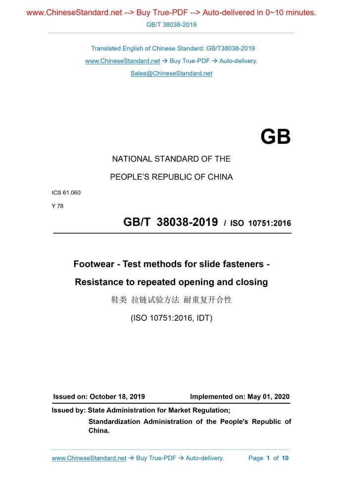 GB/T 38038-2019: Footwear - Test methods for slide fasteners - Resistance to repeated opening and closing Delivery: 9 seconds. True-PDF full-copy in English & invoice will be downloaded + auto-delivered via email. See step-by-step procedure Status: Valid