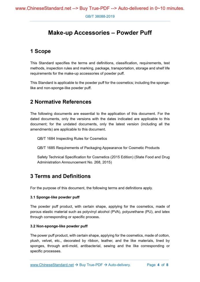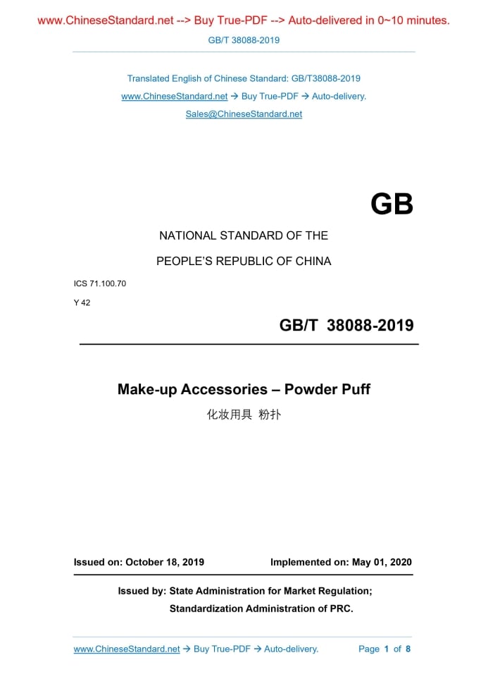 GB/T 38088-2019: Make-up accessories - Powder puff Delivery: 9 seconds. True-PDF full-copy in English & invoice will be downloaded + auto-delivered via email. See step-by-step procedure Status: Valid