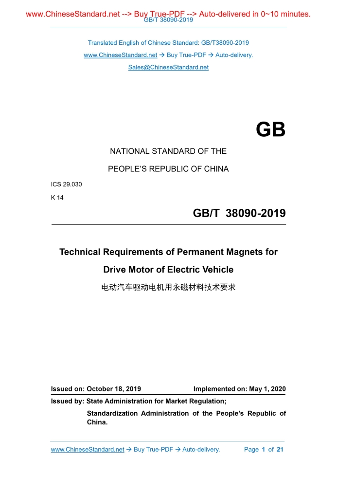 GB/T 38090-2019: Technical Requirements of Permanent Magnets for Drive Motor of Electric Vehicle Delivery: 9 seconds. True-PDF full-copy in English & invoice will be downloaded + auto-delivered via email. See step-by-step procedure Status: Valid