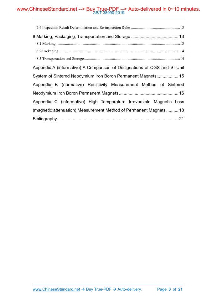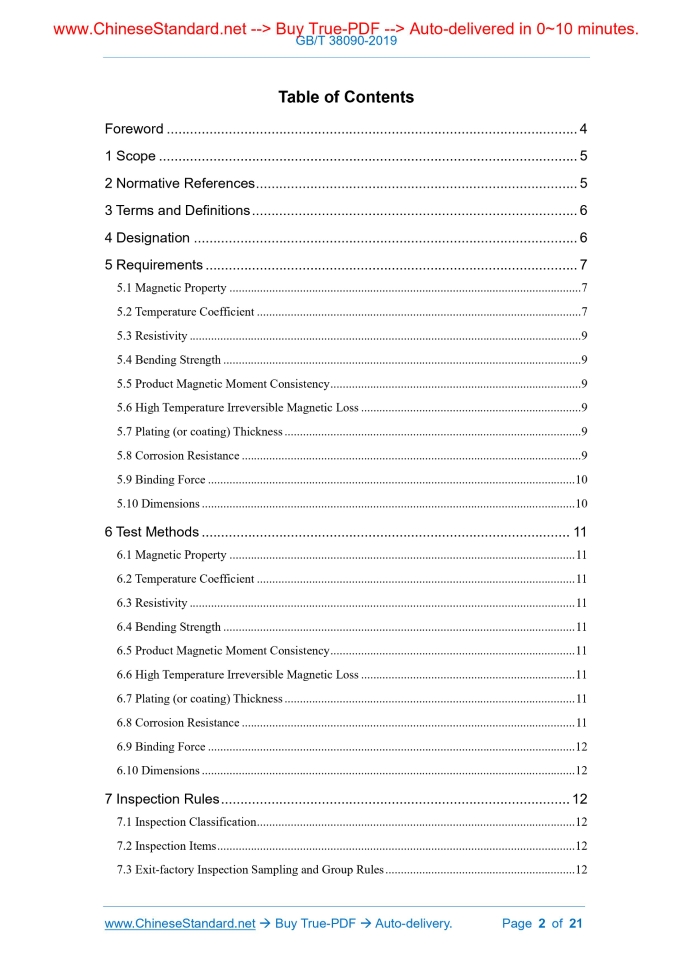 Similar standardsGB/T 38090-2019: Technical Requirements of Permanent Magnets for Drive Motor of Electric Vehicle---This is an excerpt. Full copy of true-PDF in English version (including equations, symbols, images, flow-chart, tables, and figures etc.), auto-downloaded/delivered in 9 seconds, can be purchased online: https://www.ChineseStandard.net/PDF.aspx/GBT38090-2019NATIONAL STANDARD OF THE PEOPLE’S REPUBLIC OF CHINA ICS 29.030 K 14 Technical Requirements of Permanent Magnets for Drive Motor of Electric Vehicle ISSUED ON: OCTOBER 18, 2019 IMPLEMENTED ON: MAY 1, 2020 Issued by: State Administration for Market Regulation; Standardization Administration of the People’s Republic of China. Table of ContentsForeword ... 4 1 Scope ... 5 2 Normative References ... 5 3 Terms and Definitions ... 6 4 Designation ... 6 5 Requirements ... 7 5.1 Magnetic Property ... 7 5.2 Temperature Coefficient ... 7 5.3 Resistivity ... 9 5.4 Bending Strength ... 9 5.5 Product Magnetic Moment Consistency ... 9 5.6 High Temperature Irreversible Magnetic Loss ... 9 5.7 Plating (or coating) Thickness ... 9 5.8 Corrosion Resistance ... 9 5.9 Binding Force ... 10 5.10 Dimensions ... 10 6 Test Methods ... 11 6.1 Magnetic Property ... 11 6.2 Temperature Coefficient ... 11 6.3 Resistivity ... 11 6.4 Bending Strength ... 11 6.5 Product Magnetic Moment Consistency ... 11 6.6 High Temperature Irreversible Magnetic Loss ... 11 6.7 Plating (or coating) Thickness ... 11 6.8 Corrosion Resistance ... 11 6.9 Binding Force ... 12 6.10 Dimensions ... 12 7 Inspection Rules ... 12 7.1 Inspection Classification ... 12 7.2 Inspection Items ... 12 7.3 Exit-factory Inspection Sampling and Group Rules ... 12 7.4 Inspection Result Determination and Re-inspection Rules ... 13 8 Marking, Packaging, Transportation and Storage ... 13 8.1 Marking ... 13 8.2 Packaging ... 14 8.3 Transportation and Storage ... 14 Appendix A (informative) A Comparison of Designations of CGS and SI Unit System of Sintered Neodymium Iron Boron Permanent Magnets... 15 Appendix B (normative) Resistivity Measurement Method of Sintered Neodymium Iron Boron Permanent Magnets ... 16 Appendix C (informative) High Temperature Irreversible Magnetic Loss (magnetic attenuation) Measurement Method of Permanent Magnets ... 18 Bibliography ... 21 Technical Requirements of Permanent Magnets for Drive Motor of Electric Vehicle1 ScopeThis Standard stipulates the technical requirements (magnetic property, temperature characteristics, allowable deviations of magnetic property, allowable deviations of dimensions and corrosion resistance) of sintered neodymium iron boron permanent magnets for drive motor of electric vehicle, as well as their test methods, inspection rules, marking, packaging, transportation and storage, etc. This Standard is applicable to sintered neodymium iron boron permanent magnets for drive motor of electric vehicle (hereinafter referred to as permanent magnets).2 Normative ReferencesThe following documents are indispensable to the application of this document. In terms of references with a specified date, only versions with a specified date are applicable to this document. In terms of references without a specified date, the latest version (including all the modifications) is applicable to this document. GB/T 2828.1-2012 Sampling Procedures for Inspection by Attribute - Part 1: Sampling Schemes Indexed by Acceptance Quality Limit (AQL) for Lot-by-lot Inspection GB/T 2900.60-2002 Electrotechnical Terminology - Electromagnetism GB/T 3217 Methods of Test of the Magnetic Properties of Permanent Magnetic (magnetically hard) Materials GB/T 6461-2002 Methods for Corrosion Testing of Metallic and Other Inorganic Coatings on Metallic Substrates - Rating of Test Specimens and Manufactured Articles Subjected to Corrosion Tests GB/T 6462 Metallic and Oxide Coatings - Measurement of Coating Thickness - Microscopical Method GB/T 9637-2001 Electrotechnical Terminology - Magnetic Materials and Components GB/T 10125 Corrosion Tests in Artificial Atmospheres - Salt Spray Tests GB/T 24270 Method of Measurement of Temperature Coefficient of Magnetic Properties of Permanent Magnetic Materials GB/T 29628 Guides for Methods of Measurement of the Magnetic Properties of 5.3 Resistivity The resistivity of permanent magnets perpendicular to the direction of easy magnetization shall be not less than 1.22 m; the resistivity of permanent magnets parallel to the direction of easy magnetization shall be not less than 1.38 m. 5.4 Bending Strength The bending strength of permanent magnets perpendicular to the direction of easy magnetization shall be not less than 220 MP; the bending strength of permanent magnets parallel to the direction of easy magnetization shall be not less than 180 MPa. 5.5 Product Magnetic Moment Consistency Product magnetic moment consistency (at the temperature condition of 20 °C) shall satisfy the following requirements: the magnetic moment deviation of permanent magnets whose mass is above 10 g shall be less than 4%; the magnetic moment deviation of permanent magnets whose mass is between 5 g ~ 10 g shall be less than 6%; the magnetic moment deviation of permanent magnets whose mass is below 5 g shall be less than 8%. 5.6 High Temperature Irreversible Magnetic Loss The high temperature irreversible magnetic loss of permanent magnets shall be determined by the demand-side and the supply-side through negotiation. 5.7 Plating (or coating) Thickness After surface treatment, the thickness range of the central plating (or coating) of permanent magnets is 3 m ~ 70 m; plating (or coating) thickness at the corners is allowed to be different from the thickness of the magnetic body’s central location, but this thickness difference shall be not more than 30 m. 5.8 Corrosion Resistance Corrosion resistance of permanent magnets shall satisfy the requirement of salt spray test time stipulated in Table 3. After the test, permanent magnets shall reach the requirements of protecti