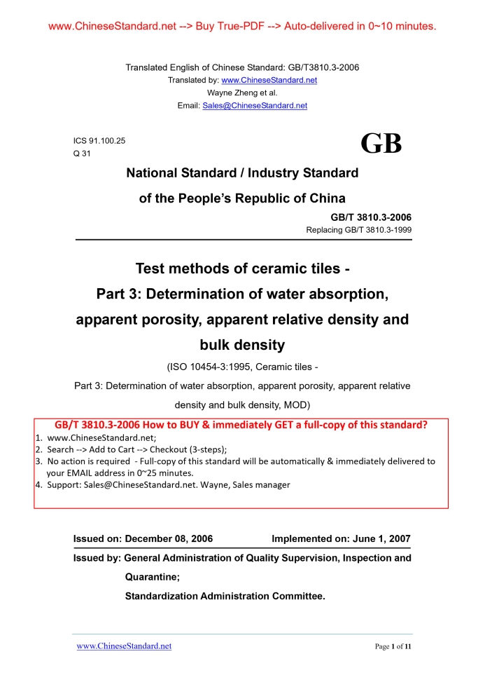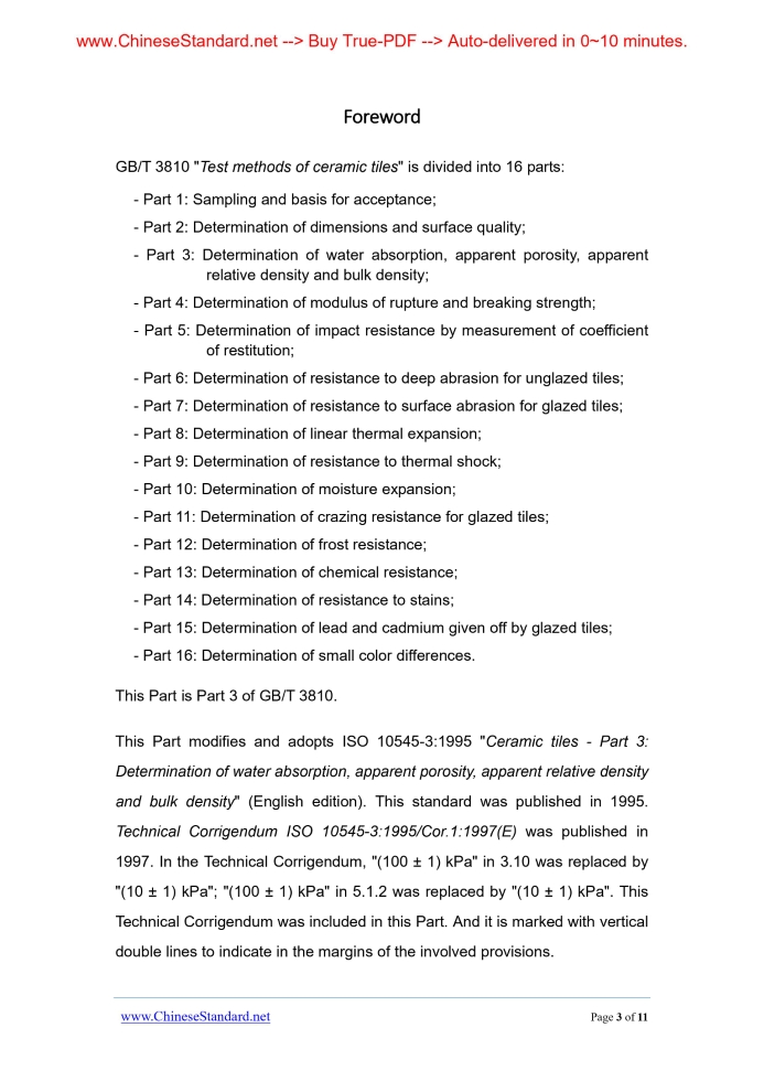 Similar standardsGB/T 3810.3-2006: Test methods of ceramic tiles -- Part 3: Determination of water absorption, apparent porosity, apparent relative density and bulk density---This is an excerpt. Full copy of true-PDF in English version (including equations, symbols, images, flow-chart, tables, and figures etc.), auto-downloaded/delivered in 9 seconds, can be purchased online: https://www.ChineseStandard.net/PDF.aspx/GBT3810.3-2006 ICS 91.100.25 Q 31 National Standard / Industry Standard of the People’s Republic of China Replacing GB/T 3810.3-1999 Test methods of ceramic tiles - Part 3.Determination of water absorption, apparent porosity, apparent relative density and bulk density (ISO 10454-3.1995, Ceramic tiles - Part 3.Determination of water absorption, apparent porosity, apparent relative density and bulk density, MOD) Issued on: DECEMBER 08, 2006 Implemented on: JUNE 1, 2007 Issued by. General Administration of Quality Supervision, Inspection and Quarantine; Standardization Administration Committee. GB Table of Contents1 Scope... 6 2 Principle... 6 3 Instruments... 6 4 Samples... 7 5 Steps... 8 6 Results expression... 9 7 Test reports... 11ForewordGB/T 3810 "Test methods of ceramic tiles" is divided into 16 parts. - Part 1.Sampling and basis for acceptance; - Part 2.Determination of dimensions and surface quality; - Part 3.Determination of water absorption, apparent porosity, apparent relative density and bulk density; - Part 4.Determination of modulus of rupture and breaking strength; - Part 5.Determination of impact resistance by measurement of coefficient of restitution; - Part 6.Determination of resistance to deep abrasion for unglazed tiles; - Part 7.Determination of resistance to surface abrasion for glazed tiles; - Part 8.Determination of linear thermal expansion; - Part 9.Determination of resistance to thermal shock; - Part 10.Determination of moisture expansion; - Part 11.Determination of crazing resistance for glazed tiles; - Part 12.Determination of frost resistance; - Part 13.Determination of chemical resistance; - Part 14.Determination of resistance to stains; - Part 15.Determination of lead and cadmium given off by glazed tiles; - Part 16.Determination of small color differences. This Part is Part 3 of GB/T 3810. This Part modifies and adopts ISO 10545-3.1995 "Ceramic tiles - Part 3. Determination of water absorption, apparent porosity, apparent relative density and bulk density" (English edition). This standard was published in 1995. Technical Corrigendum ISO 10545-3.1995/Cor.1.1997(E) was published in 1997.In the Technical Corrigendum, "(100 ± 1) kPa" in 3.10 was replaced by "(10 ± 1) kPa"; "(100 ± 1) kPa" in 5.1.2 was replaced by "(10 ± 1) kPa". This Technical Corrigendum was included in this Part. And it is marked with vertical double lines to indicate in the margins of the involved provisions. This Part was re-drafted according to ISO 10545-3.1995.For better adaptation to China's national conditions, this Part has modified ISO 10545-3.1995 when adopting. Main differences between this Part and ISO 10545-3.1995 are as follows. - ADD the sample requirements to large-sized tiles of which the length is longer than 400 mm. - For ease of use, the following editorial changes of this Part were made. a) "This part of ISO 10545" was revised to "This part of GB/T 3810"; b) DELETE the foreword of international standard. This Part replaces GB/T 3810.3-1999 "Determination methods of ceramic tiles - Part 3.Water absorption, apparent porosity, apparent relative density and bulk density." Compared with GB/T 3810.3-1999, main changes of this Part are as follows. - REVISE "HANG the dry ceramic tiles in the water after absorbing enough water. It is used in the calculation of the relationship among parameters of dry mass, mass after saturating, and suspended mass" in 2 [Translator. Chapter 2] to "PLACE the dry tiles in the water to absorb the water till saturation. USE the tile’s dry mass, the mass after absorbing the water till saturation, and the mass in the water TO calculate relevant characteristic parameters"; - REVISE "... vacuum box and the vacuum system. And it can reach a vacuum degree of 100kPa ± 1kPa..." in 3.10 [Translator. Section 3.10] to "... the vacuum systems of which the vacuum containers and vacuum-pumping can reach 10kPa ± 1kPa and maintain for 30 min"; - REVISE "When the side length of tiles is longer than 200 mm, calculate..." in 4.4 to "When the side length of tiles is longer than 200 mm and less than 400 mm, calculate... When the side length of tiles is longer than 400 mm, then at the middle of at least 3 whole tiles, CUT 5 pieces of samples of which the minimum side length is 100 mm; - REVISE "100kPa ± 1kPa" in 5.1.2 to "10kPa ± 1kPa"; - REVISE "The average value of each test performance’s results" in 7 d) to "The average value of each performance test’s results." This Part was proposed by China Building Material Federation. This Part shall be administrated by National Standardization Technical Committee of Building Sanitary Ceramics. Organization responsible for the drafting of this Part. Xianyang Ceramics Research and Design Institute. Organizations participated in the drafting of this Part. Foshan Shiwan Eagle Ceramics Co., Ltd., Guangdong Monalisa Ceramics (Group) Co., Ltd., Foshan Xinghui Ceramics Co., Ltd., and Hangzhou Nobel Group Co., Ltd. Main drafters of this Part. Liu Youhong, Bai Zhanying, Zhong Yingzhou, Zhang Qikang, Chen Hongzai, and Li Ying. The previous versions replaced by this Part are. - GB 2579-1981, GB 2579-1989; - GB/T 3810.3-1999. Test methods of ceramic tiles - Part 3.Determination of water absorption, apparent porosity, apparent relative density and bulk density1 ScopeThis Part of GB/T 3810 specifies the determination methods of ceramic tiles’ water absorption, apparent porosity, apparent relative density, and bulk density. For open pores of the samples to inhale saturated water, there are 2 methods. Soaking under boil