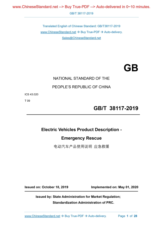 GB/T 38117-2019: Electric Vehicles Product Description - Emergency Rescue Delivery: 9 seconds. True-PDF full-copy in English & invoice will be downloaded + auto-delivered via email. See step-by-step procedure Status: Valid
