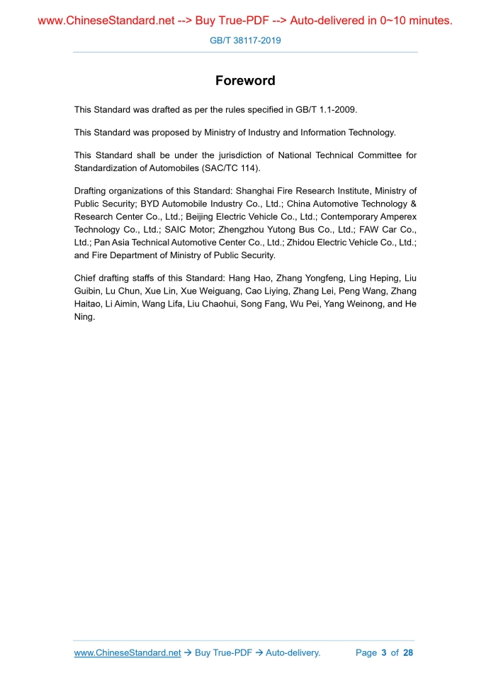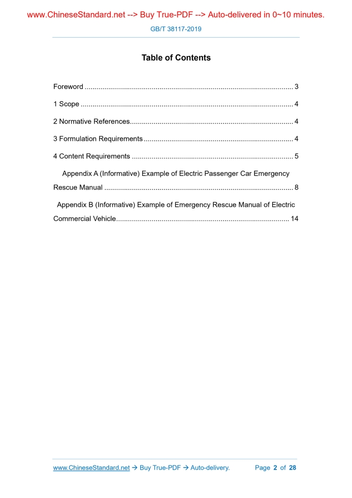 Similar standardsGB/T 38117-2019: Electric Vehicles Product Description - Emergency Rescue---This is an excerpt. Full copy of true-PDF in English version (including equations, symbols, images, flow-chart, tables, and figures etc.), auto-downloaded/delivered in 9 seconds, can be purchased online: https://www.ChineseStandard.net/PDF.aspx/GBT38117-2019NATIONAL STANDARD OF THE PEOPLE’S REPUBLIC OF CHINA ICS 43.020 T 09 Electric Vehicles Product Description - Emergency Rescue ISSUED ON: OCTOBER 18, 2019 IMPLEMENTED ON: MAY 01, 2020 Issued by: State Administration for Market Regulation; Standardization Administration of PRC. Table of ContentsForeword ... 3 1 Scope ... 4 2 Normative References ... 4 3 Formulation Requirements ... 4 4 Content Requirements ... 5 Appendix A (Informative) Example of Electric Passenger Car Emergency Rescue Manual ... 8 Appendix B (Informative) Example of Emergency Rescue Manual of Electric Commercial Vehicle ... 14ForewordThis Standard was drafted as per the rules specified in GB/T 1.1-2009. This Standard was proposed by Ministry of Industry and Information Technology. This Standard shall be under the jurisdiction of National Technical Committee for Standardization of Automobiles (SAC/TC 114). Drafting organizations of this Standard: Shanghai Fire Research Institute, Ministry of Public Security; BYD Automobile Industry Co., Ltd.; China Automotive Technology & Research Center Co., Ltd.; Beijing Electric Vehicle Co., Ltd.; Contemporary Amperex Technology Co., Ltd.; SAIC Motor; Zhengzhou Yutong Bus Co., Ltd.; FAW Car Co., Ltd.; Pan Asia Technical Automotive Center Co., Ltd.; Zhidou Electric Vehicle Co., Ltd.; and Fire Department of Ministry of Public Security. Chief drafting staffs of this Standard: Hang Hao, Zhang Yongfeng, Ling Heping, Liu Guibin, Lu Chun, Xue Lin, Xue Weiguang, Cao Liying, Zhang Lei, Peng Wang, Zhang Haitao, Li Aimin, Wang Lifa, Liu Chaohui, Song Fang, Wu Pei, Yang Weinong, and He Ning. Electric Vehicles Product Description - Emergency Rescue1 ScopeThis Standard specifies the contents and formulation requirements for the emergency rescue in the electric vehicle product description. This Standard is applicable to the contents and formulation of the emergency rescue in the electric vehicle product description.2 Normative ReferencesThe following documents are essential to the application of this document. For the dated documents, only the versions with the dates indicated are applicable to this document; for the undated documents, only the latest version (including all the amendments) are applicable to this document. GB/T 2893.1 Graphical Symbols - Safety Colors and Safety Signs - Part 1: Design Principles for Safety Signs and Safety Markings GB/T 5296.1 Instructions for Use of Products of Consumer Interest -- Part 1: General Principles GB/T 19596 Terminology of Electric Vehicles GB/T 24548 Fuel Cell Electric Vehicles -- Terminology3 Formulation Requirements3.1 The emergency rescue part of the electric vehicle product description shall form a separate manual; the paper version of it shall be accompanied by the vehicle; its contents and format can refer to Appendixes A and B. 3.2 The emergency rescue part of the electric vehicle product description shall include the following contents such as the electric vehicles’ product information, safety sign information, emergency rescue disposal procedure information, other information deemed necessary by the vehicle manufacturer, etc.; and it shall be formulated in the perspective view of the vehicle. 4.1.4.3 In addition to the requirements in 4.1.4.1, the fuel cell electric vehicle shall also include the information such as fuel cell system, on-board hydrogen supply system and location where leakage may occur, etc. When the information concerning the position is involved, it shall be given in the side perspective view and top-down perspective view of the vehicle. 4.1.4.4 The information on the type, rated voltage and rated capacity of the electric vehicle’s power battery; the number, size, voltage, capacity and weight of the battery pack; the rated voltage and rated capacity of the battery system shall be given. 4.1.5 Emergency device information The name, function, position and use of all emergency device and escape device in electric vehicle products shall be stated. The position and use method shall be illustrated in a top-down perspective view and side perspective view of vehicle; while the appearance shall be illustrated in the form of physical photograph. 4.2 Safety sign information All safety signs related to emergency rescue of the vehicle shall be given with an explanation. 4.3 Emergency rescue disposal procedure information The emergency rescue disposal procedure information of the electric vehicle product shall include but not limited to the following information: a) Relevant information such as types of protective equipment required for the emergency rescue personnel and the minimum requirements for protective performance; b) The operation manner in which the vehicle is stopped, and illustrate graphically; c) Procedures for high-voltage disconnection, the appearance, position and operation steps of all components and operation method for high-voltage disconnection shall be illustrate graphically; d) Fuel cell electric vehicles shall also provide equipment and methods required for hydrogen leakage and hydrogen fame detection; e) The parts that are difficult for the emergency rescue personnel to cut and expand, and the parts that can’t be cut, expanded and pierced shall be illustrated graphically; f) The emergency disposal methods and precautions of waterlogged vehicle and safety distance of 2m~3m from the fire source, hold the nozzle with the left hand. The nozzle is aligned with the root of the flame; the right hand presses the handle hard for extinguishing. B.1.5.5 Fire extinguishing system Function: When encountering the open flame or the temperature reaches 175°C, the fire extinguishing 