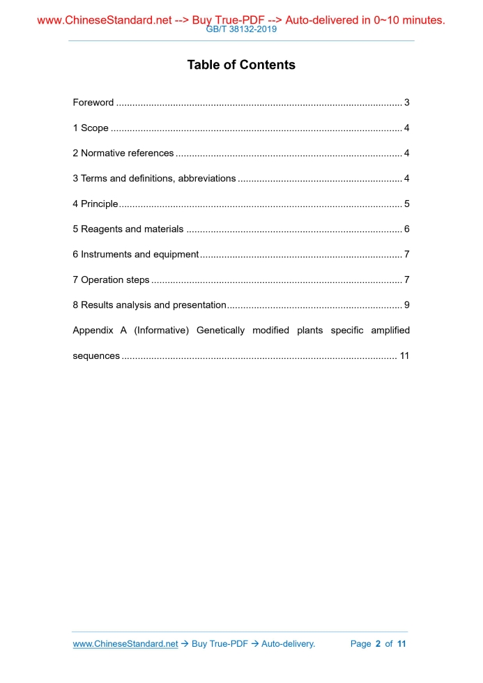 Similar standardsGB/T 38132-2019: Quantitative determination of genetically modified plants by digital PCR method---This is an excerpt. Full copy of true-PDF in English version (including equations, symbols, images, flow-chart, tables, and figures etc.), auto-downloaded/delivered in 9 seconds, can be purchased online: https://www.ChineseStandard.net/PDF.aspx/GBT38132-2019NATIONAL STANDARD OF THE PEOPLE’S REPUBLIC OF CHINA ICS 07.080 A 40 Quantitative determination of genetically modified plants by digital PCR method ISSUED ON: OCTOBER 18, 2019 IMPLEMENTED ON: OCTOBER 18, 2019 Issued by: State Administration for Market Regulation; Standardization Administration of the People’s Republic of China. Table of ContentsForeword ... 3 1 Scope ... 4 2 Normative references ... 4 3 Terms and definitions, abbreviations ... 4 4 Principle ... 5 5 Reagents and materials ... 6 6 Instruments and equipment ... 7 7 Operation steps ... 7 8 Results analysis and presentation ... 9 Appendix A (Informative) Genetically modified plants specific amplified sequences ... 11 Quantitative determination of genetically modified plants by digital PCR method1 ScopeThis Standard specifies the quantitative determination of genetically modified plants by digital PCR method. This Standard applies to the digital PCR method for quantitative determination of genetically modified maize MON810, MON89034, MIR162, genetically modified soybean GTS-40-3-2, genetically modified rice KMD event, genetically modified cotton GHB119, and genetically modified oilseed rape RT73 in seeds and physically-processed seeds. The quantitative detection limit of this method is 0.1% (mass fraction).2 Normative referencesThe following documents are indispensable for the application of this document. For dated references, only the dated version applies to this document. For undated references, the latest edition (including all amendments) applies to this document. GB/T 6682, Water for analytical laboratory use - Specification and test methods GB/T 19495.1, Detection of genetically modified organisms and derived products - General requirements and definitions GB/T 19495.3, Detection of genetically modified organisms and derived products - Nucleic acid extraction GB/T 19495.7, Detection of genetically modified organisms and derived products - Methods for sampling and sample preparation SN/T 4853, Quantitative detection of genetically modified rice - Digital PCR3 Terms and definitions, abbreviations3.1 Terms and definitions The following terms and definitions are applicable to this document. 3.1.1 Event specific sequence The neighbor-joining sequence that is recombined and produced after the exogenous DNA fragment is inserted into the recipient crop genome. 3.2 Abbreviations The following abbreviations are applicable to this document. Adh-1: Alcohol dehydrogenase 1 Adhc: Alcohol dehydrogenase C gene PCR: Polymerase chain reaction PEP: Phosphoenolpyruvate carboxylase gene PLD: Phospholipase D gene4 PrincipleThe technical principle of digital PCR is to segment the original PCR reaction system, and then to amplify and detect all small reaction systems. Through the limited segmentation of the reaction system, the entire reaction system can be more tolerant to the nucleic acid inhibitor, and can more stably, accurately, and rapidly perform a precise identification of the genetically modified organism of the trace. At present, digital PCR includes chip-type digital PCR and droplet-type digital PCR. The chip-type digital PCR uses a microfluidic chip to realize the segmentation of the original reaction system; this segmentation method has the advantages of good stability and uniformity; but the test cost is relatively high. The droplet-type digital PCR generates tiny water-in-oil system to realize the segmentation of the reaction system; this segmentation method has fast response speed and lower segmentation cost. In order to achieve quantitative determination of genetically modified plants by digital PCR, this Standard directly obtains the copy number content of exogenous genes (event specific sequence) and endogenous genes of genetically modified plants through digital PCR amplification reactions. The ratio (percentage) of the copy number of the exogenous gene to the endogenous gene in the sample DNA is the relative percentage content of the corresponding genetically modified plants in the sample. 7.5.2 Digital PCR reaction procedures The digital PCR reaction procedures are shown in Tables 4 and 5. 7.5.3 Setting of the control digital PCR reaction A positive control, a negative control and a blank control shall be set in the test. Use the genomic DNA of genetically modified plants that contains event specific sequence as the positive control; use the genomic DNA of non-genetically modified plants that contains the same endogenous genes as a negative control; use water as a blank control. In each control PCR reaction system, except for the template, the remaining components and PCR reaction conditions are the same as 7.5.1 and 7.5.2.8 Results analysis and presentation8.1 Quality control Set the threshold limit according to the end-point fluorescence value of the negative control in the digital PCR results; the threshold limit shall effectively distinguish the negative reaction microcells from the positive reaction microcells in the same sample. The negative control has endogenous gene amplification; neither the negative control nor the blank control has exogenous gene amplification. The relative standard deviation of the amplification parallel test result (percentage of genetically modified events) shall be less than or equal to 25%. ......Source: Above contents are excerpted from the full-copy PDF -- translated/reviewed by: www.ChineseStandard.net / Wayne Zheng et al. Tips & Frequently Asked Questions:Question 1: How long will the true-PDF of English version of GB/T 38132-2019 be delivered?Answer: The full copy PDF of English version of GB/T 38132-2019 can be