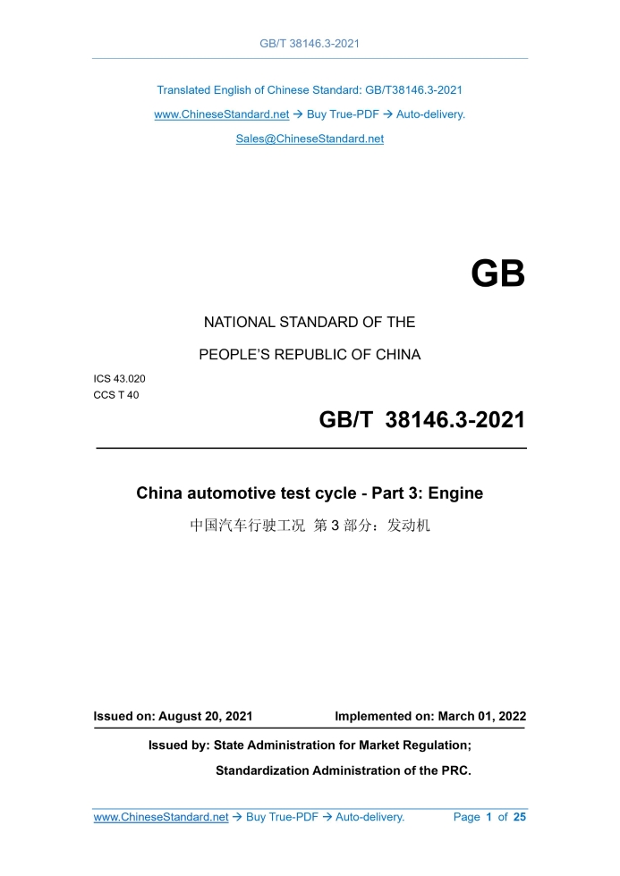 GB/T 38146.3-2021: China automotive test cycle - Part 3: Engine Delivery: 9 seconds. True-PDF full-copy in English & invoice will be downloaded + auto-delivered via email. See step-by-step procedure Status: Valid