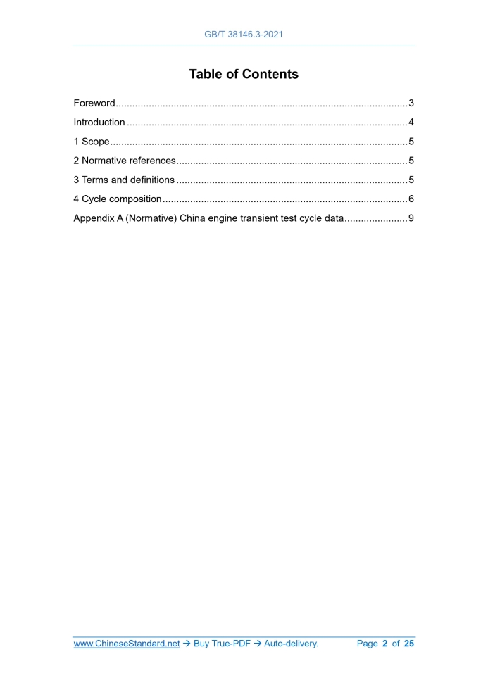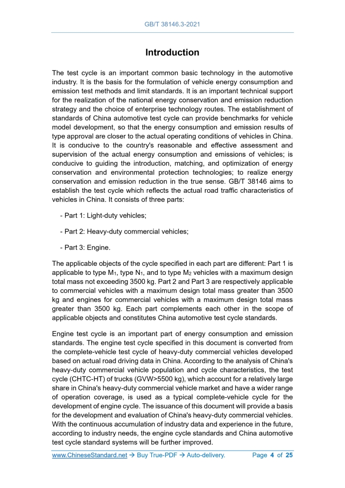 Similar standardsGB/T 38146.3-2021: China automotive test cycle - Part 3: Engine---This is an excerpt. Full copy of true-PDF in English version (including equations, symbols, images, flow-chart, tables, and figures etc.), auto-downloaded/delivered in 9 seconds, can be purchased online: https://www.ChineseStandard.net/PDF.aspx/GBT38146.3-2021GB NATIONAL STANDARD OF THE PEOPLE’S REPUBLIC OF CHINA ICS 43.020 CCS T 40 China automotive test cycle - Part 3: Engine ISSUED ON: AUGUST 20, 2021 IMPLEMENTED ON: MARCH 01, 2022 Issued by: State Administration for Market Regulation; Standardization Administration of the PRC. Table of ContentsForeword ... 3 Introduction ... 4 1 Scope ... 5 2 Normative references ... 5 3 Terms and definitions ... 5 4 Cycle composition ... 6 Appendix A (Normative) China engine transient test cycle data ... 9IntroductionThe test cycle is an important common basic technology in the automotive industry. It is the basis for the formulation of vehicle energy consumption and emission test methods and limit standards. It is an important technical support for the realization of the national energy conservation and emission reduction strategy and the choice of enterprise technology routes. The establishment of standards of China automotive test cycle can provide benchmarks for vehicle model development, so that the energy consumption and emission results of type approval are closer to the actual operating conditions of vehicles in China. It is conducive to the country's reasonable and effective assessment and supervision of the actual energy consumption and emissions of vehicles; is conducive to guiding the introduction, matching, and optimization of energy conservation and environmental protection technologies; to realize energy conservation and emission reduction in the true sense. GB/T 38146 aims to establish the test cycle which reflects the actual road traffic characteristics of vehicles in China. It consists of three parts: - Part 1: Light-duty vehicles; - Part 2: Heavy-duty commercial vehicles; - Part 3: Engine. The applicable objects of the cycle specified in each part are different: Part 1 is applicable to type M1, type N1, and to type M2 vehicles with a maximum design total mass not exceeding 3500 kg. Part 2 and Part 3 are respectively applicable to commercial vehicles with a maximum design total mass greater than 3500 kg and engines for commercial vehicles with a maximum design total mass greater than 3500 kg. Each part complements each other in the scope of applicable objects and constitutes China automotive test cycle standards. Engine test cycle is an important part of energy consumption and emission standards. The engine test cycle specified in this document is converted from the complete-vehicle test cycle of heavy-duty commercial vehicles developed based on actual road driving data in China. According to the analysis of China's heavy-duty commercial vehicle population and cycle characteristics, the test cycle (CHTC-HT) of trucks (GVW >5500 kg), which account for a relatively large share in China's heavy-duty commercial vehicle market and have a wider range of operation coverage, is used as a typical complete-vehicle cycle for the development of engine cycle. The issuance of this document will provide a basis for the development and evaluation of China's heavy-duty commercial vehicles. With the continuous accumulation of industry data and experience in the future, according to industry needs, the engine cycle standards and China automotive test cycle standard systems will be further improved. China automotive test cycle - Part 3: Engine1 ScopeThis document specifies the test cycle used in emission and fuel consumption tests for commercial vehicle engines. This document applies to engines for commercial vehicles with a maximum design total mass greater than 3500 kg.2 Normative referencesThe contents of the following documents, through normative references in this text, constitute indispensable provisions of this document. Among them, for dated references, only the edition corresponding to that date applies to this document. For undated references, the latest edition (including all amendments) applies to this document. GB/T 3730.1 Motor vehicles and trailers - Types - Terms and definitions GB/T 3730.2 Road vehicle - Masses - Vocabulary and codes GB/T 15089 Classification of power-driven vehicles and trailers GB/T 17692 Measurement methods of net power for automotive engines3 Terms and definitionsThe terms and definitions defined in GB/T 3730.1, GB/T 3730.2, GB/T 15089 and GB/T 17692 and the following ones apply to this document. 3.1 Normalized speed factor Nenorm The percent formed by normalizing the actual engine speed. Its calculation formula is as follows: Where: Ne - Actual engine speed, in revolutions per minute (r/min); Neidle - Engine idle speed, in revolutions per minute (r/min); Nerate - Rated engine speed, in revolutions per minute (r/min). Note 1: The engine idle speed refers to the engine no-load operating state; that is, the speed when the clutch is in the engaged position, the transmission is in the neutral position, and the accelerator pedal is in the fully released position. Note 2: The rated engine speed refers to the maximum full-load speed allowed by the governor specified by the manufacturer in its sales and service documents; or the speed corresponding to the maximum power of the engine when the governor is not installed, as specified by the manufacturer in its sales and service documents. 3.2 Percent load The maximum torque percent that can be achieved at a certain speed of the engine. 3.3 Engine test cycle The combination of time-normalized speed factor curve and time-percent load curve describing the operating characteristics of the engine.4 Cycle composition4.1 Overview China automotive test cycle is the general term for engine test cycle used in emission and fuel consumption tests for engines for commercial vehicles with a maximum design 