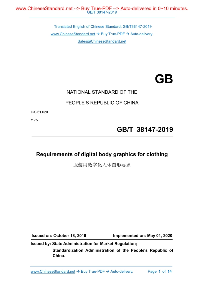GB/T 38147-2019: Requirements of digital body graphics for clothing Delivery: 9 seconds. True-PDF full-copy in English & invoice will be downloaded + auto-delivered via email. See step-by-step procedure Status: Valid