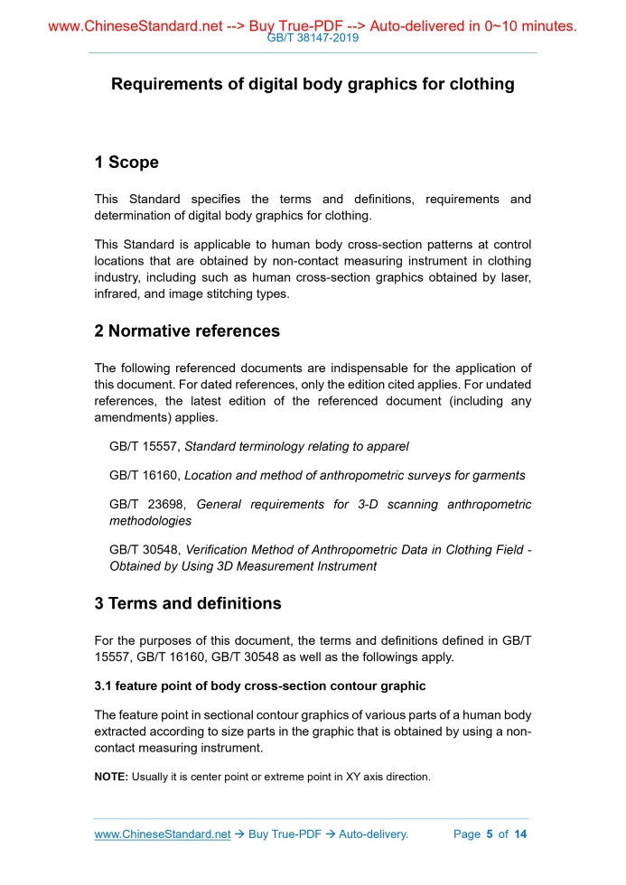 Similar standardsGB/T 38147-2019: Requirements of digital body graphics for clothing---This is an excerpt. Full copy of true-PDF in English version (including equations, symbols, images, flow-chart, tables, and figures etc.), auto-downloaded/delivered in 9 seconds, can be purchased online: https://www.ChineseStandard.net/PDF.aspx/GBT38147-2019NATIONAL STANDARD OF THE PEOPLE’S REPUBLIC OF CHINA ICS 61.020 Y 75 Requirements of digital body graphics for clothing ISSUED ON: OCTOBER 18, 2019 IMPLEMENTED ON: MAY 01, 2020 Issued by: State Administration for Market Regulation; Standardization Administration of the People's Republic of China. Table of ContentsForeword ... 3 Introduction ... 4 1 Scope ... 5 2 Normative references ... 5 3 Terms and definitions ... 5 4 Requirements ... 6 5 Determination ... 13 Bibliography ... 14 Requirements of digital body graphics for clothing1 ScopeThis Standard specifies the terms and definitions, requirements and determination of digital body graphics for clothing. This Standard is applicable to human body cross-section patterns at control locations that are obtained by non-contact measuring instrument in clothing industry, including such as human cross-section graphics obtained by laser, infrared, and image stitching types.2 Normative referencesThe following referenced documents are indispensable for the application of this document. For dated references, only the edition cited applies. For undated references, the latest edition of the referenced document (including any amendments) applies. GB/T 15557, Standard terminology relating to apparel GB/T 16160, Location and method of anthropometric surveys for garments GB/T 23698, General requirements for 3-D scanning anthropometric methodologies GB/T 30548, Verification Method of Anthropometric Data in Clothing Field - Obtained by Using 3D Measurement Instrument3 Terms and definitionsFor the purposes of this document, the terms and definitions defined in GB/T 15557, GB/T 16160, GB/T 30548 as well as the followings apply. 3.1 feature point of body cross-section contour graphic The feature point in sectional contour graphics of various parts of a human body extracted according to size parts in the graphic that is obtained by using a non- contact measuring instrument. NOTE: Usually it is center point or extreme point in XY axis direction. 3.2 body section figure After converting point clouds or solid images obtained using a non-contact measurement, a cross-section graphic of each control part taken from the image that is obtained by using software.4 Requirements4.1 Acquisition of body graphics and inspection principle Based on national standard and industry standard measurement methods, use a non-contact measuring instrument to collect samples to obtain image data. According to body size parts, section figures of different parts (bust, hip, waist, neck) are formed. Respectively check whether graphics are closed and continuous, whether the feature points are complete and the correlation is correct. Determine whether the feature points are offset and whether the offset is within the range. Finally, determine the accuracy of the graphics based on the above parameters. 4.2 Requirements for acquisition of body section figure 4.2.1 Figure acquisition instrument 4.2.1.1 Non-contact automatic human body measuring instrument for clothing. 4.2.1.2 Mobile terminal software or third-party compatible software that can collect body section figure. 4.2.2 Requirements for figure acquisition test 4.2.2.1 Selection of test sample It shall select any tested subject (normal body) who shall stand in the standard standing position. 4.2.2.2 Measurement methods According to the requirements of GB/T 23698, it shall use an automatic measuring instrument to measure the tested subject three times to obtain three sets of measurement results in total. 4.2.3 Figure acquisition methods 4.2.3.1 It can use the software tool of the measurement instrument to automatically intercept. 4.2.3.2 If there are no automatic intercept function, it can use a third-party Right hip point P42 □Yes □No Fore abdominal center point P43 □Yes □No Hind hip center point P44 □Yes □No Left hip protrusion P45 □Yes □No Right hip protrusion P46 □Yes □No 4.3.2.3 If the number of feature points of the figure of each part is consistent with Figure 1, then the feature points of the figure of the part are complete. Record as "Yes" in the checklist; otherwise determine as incomplete and record as "No". 4.3.2.4 If the position of the feature point of each part figure is consistent with Figure 1 and unique, then the feature point of the part figure is determined to be unique and recorded as "Yes" in the checklist. If there are multiple or missing feature points at the same location, it is determined that the feature points are not unique and recorded as "No" in the checklist. 4.3.3 Interrelationship requirements and inspection of feature points 4.3.3.1 In the coordinate axis of Figure 1, the angle between the line connecting the center point of each control part and the line connecting the left and right sides shall be 90° ± 2°. If the angle between the central point line of each control part and the left and right side points is 90° ± 2°, it is determined that the central point line of the part is perpendicular to the left and right side points. Record as "Yes" in the checklist (see Table 5). Record the actual angle. Otherwise, it shall be determined that it is not vertical. Record "No" in the checklist (see Table 5) and record the actual angle. 4.3.3.2 In the coordinate axis of Figure 1, the deviation of the ratio of the coordinate values of the two symmetrical points of each control part graphic shall be within a certain range. According to the allowable deviation table for the position of the symmetrical feature points of each part in the coordinate axis in Table 6, determine whether the position deviation ratio between the symmetrical feature points of 
