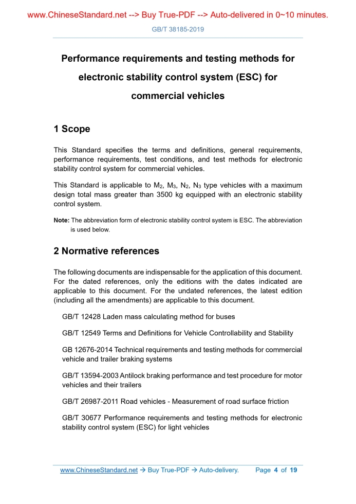 Similar standardsGB/T 38185-2019: Performance requirements and testing methods for electronic stability control system (ESC) for commercial vehicles---This is an excerpt. Full copy of true-PDF in English version (including equations, symbols, images, flow-chart, tables, and figures etc.), auto-downloaded/delivered in 9 seconds, can be purchased online: https://www.ChineseStandard.net/PDF.aspx/GBT38185-2019 NATIONAL STANDARD OF THE PEOPLE’S REPUBLIC OF CHINA ICS 43.040.40 T 24 Performance requirements and testing methods for electronic stability control system (ESC) for commercial vehicles ISSUED ON: OCTOBER 18, 2019 IMPLEMENTED ON: MAY 01, 2020 Issued by: State Administration for Market Regulation; Standardization Administration of the PRC. Table of ContentsForeword ... 3 1 Scope ... 4 2 Normative references ... 4 3 Terms and definitions ... 5 4 General requirements ... 5 5 Performance requirements ... 5 6 Test conditions ... 10 7 Test methods ... 13 Appendix A (Informative) Additional tests ... 17 Performance requirements and testing methods for electronic stability control system (ESC) for commercial vehicles1 ScopeThis Standard specifies the terms and definitions, general requirements, performance requirements, test conditions, and test methods for electronic stability control system for commercial vehicles. This Standard is applicable to M2, M3, N2, N3 type vehicles with a maximum design total mass greater than 3500 kg equipped with an electronic stability control system. Note: The abbreviation form of electronic stability control system is ESC. The abbreviation is used below.2 Normative referencesThe following documents are indispensable for the application of this document. For the dated references, only the editions with the dates indicated are applicable to this document. For the undated references, the latest edition (including all the amendments) are applicable to this document. GB/T 12428 Laden mass calculating method for buses GB/T 12549 Terms and Definitions for Vehicle Controllability and Stability GB 12676-2014 Technical requirements and testing methods for commercial vehicle and trailer braking systems GB/T 13594-2003 Antilock braking performance and test procedure for motor vehicles and their trailers GB/T 26987-2011 Road vehicles - Measurement of road surface friction GB/T 30677 Performance requirements and testing methods for electronic stability control system (ESC) for light vehicles a) During the period from 1.5 s after the subject vehicle enters the test starting point to passing the test end point, the ESC shall reduce the output torque of the engine/drive motor by 10% or more than that requested by the driver, which shall be lasted for at least 0.5 s; b) The wheel of the subject vehicle, during the process from the test starting point to passing the test end point, shall always remain in the test lane. 5.1.2 TEST according to 7.7.3. At least 6 of the 8 tests in each series meet the following requirements: a) The speed of the subject vehicle after passing the test starting point 3 s shall not exceed 47 km/h; b) The speed of the subject vehicle after passing the test starting point 4 s shall not exceed 45 km/h; c) The wheel of the subject vehicle, during the process from the test starting point to passing the test end point, shall always remain in the test lane; d) The ESC braking shall be activated. 5.2 ESC fault monitoring 5.2.1 The vehicle shall be fitted with an ESC signalling device and alert the driver if there is any fault in the system which affects ESC control, response signal generation or transmission. 5.2.2 The ESC fault signalling device shall meet the following requirements: a) It is in the front field of view of the driver, which is convenient for the driver at the driving position to check whether the state of the signalling device is normal; b) When observed during the travel of the vehicle, it shall be in an upright state. Its orientation is shown in Figure 1; c) It shall use one of the “ESC fault signal” identification symbols shown in Figure 1 or the word “ESC” for indication; d) It shall be yellow or amber; e) After the signalling device is lit, it shall be bright and conspicuous enough, so that the driver, after adapting to the environmental road lighting conditions, can clearly observe whether driving during the day or night; which no longer meets the performance requirements of 5.1.1 and 5.1.2, it is not necessary to indicate it in the way of 5.3.3. 5.4 ESC OFF signalling device 5.4.1 If the manufacturer, in accordance with 5.3, installs a control device to shut down or reduce the performance of the ESC, the signalling device requirements of 5.4.2~5.4.5 shall be met, to alert the driver when the ESC function is degraded. This requirement does not apply to the driver’s selection mode as described in 5.3.2b). 5.4.2 If the vehicle manufacturer sets a control mode which makes the ESC not meet the requirements of 5.1.1 and 5.1.2, an alarm device shall be provided to indicate when the ESC is in this control mode. 5.4.3 The signalling device shall meet the following requirements: a) It is in the front field of view of the driver, which is convenient for the driver at the driving position to check whether the state of the signalling device is normal; b) When observed during the travel of the vehicle, it shall be in an upright state. Its orientation is shown in Figure 2; c) It shall use the ESC OFF identification symbol specified in 5.3.3 or the word “ESC OFF” for indication. It is also possible to mark an “OFF” on the control device described in 5.3.3 or 5.3.5, the illuminated fault signalling device or its vicinity for indication; d) It shall be yellow or amber; e) After the signalling device is lit, it shall be bright and conspicuous enough, so that the driver, after adapting to the environmental road lighting conditions, can clearly observe whether driving during the day or night; f) As long as the ESC is in a mode which canno