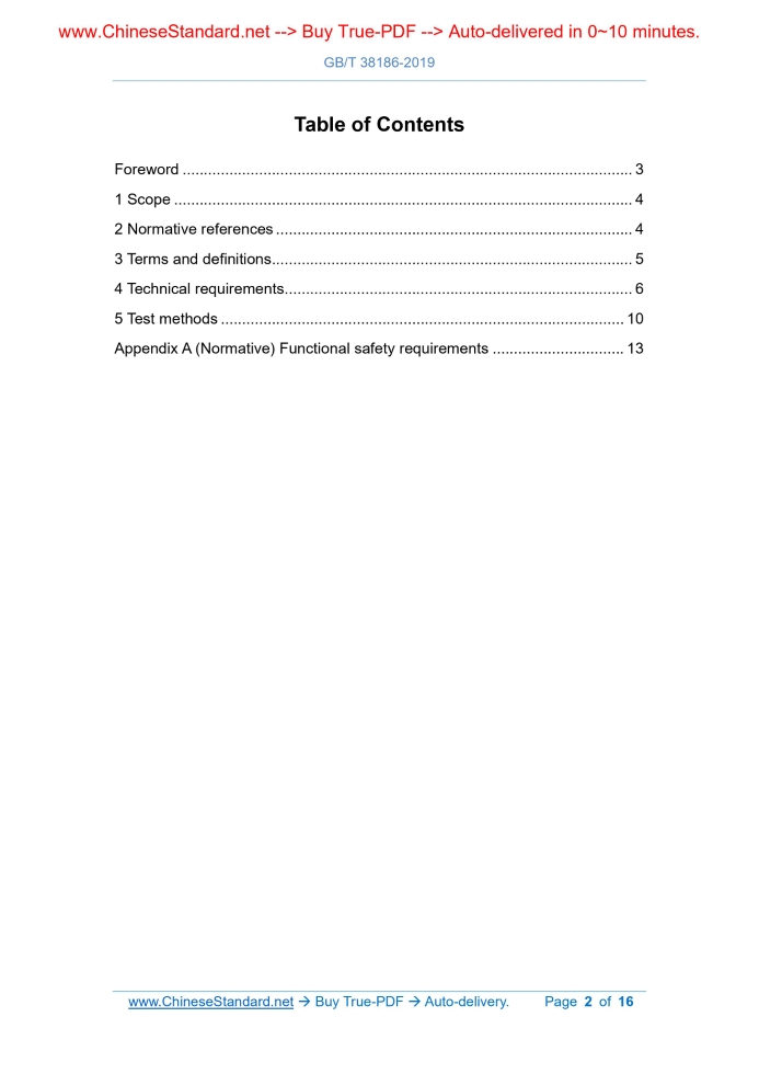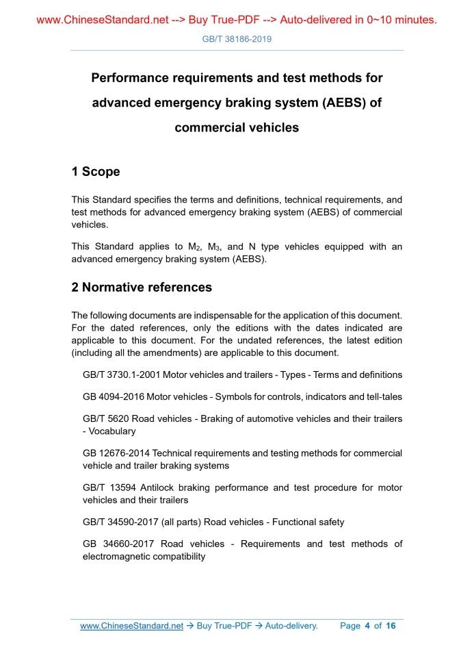 Similar standardsGB/T 38186-2019: Performance requirements and test methods for advanced emergency braking system (AEBS) of commercial vehicles---This is an excerpt. Full copy of true-PDF in English version (including equations, symbols, images, flow-chart, tables, and figures etc.), auto-downloaded/delivered in 9 seconds, can be purchased online: https://www.ChineseStandard.net/PDF.aspx/GBT38186-2019 NATIONAL STANDARD OF THE PEOPLE’S REPUBLIC OF CHINA ICS 43.040.40 T 24 Performance requirements and test methods for advanced emergency braking system (AEBS) of commercial vehicles Issued on. OCTOBER 18, 2019 Implemented on. MAY 01, 2020 Issued by. State Administration for Market Regulation; Standardization Administration of the PRC. Table of ContentsForeword... 3 1 Scope... 4 2 Normative references... 4 3 Terms and definitions... 5 4 Technical requirements... 6 5 Test methods... 10 Appendix A (Normative) Functional safety requirements... 13ForewordThis Standard is drafted in accordance with the rules given in GB/T 1.1-2009. This Standard was proposed by Ministry of Industry and Information Technology of the PRC. This Standard shall be under the jurisdiction of National Technical Committee of Auto Standardization (SAC/TC 114). Drafting organizations of this Standard. FAW Jiefang Automotive Co., Ltd., Anhui Jianghuai Automobile Group Corp., Ltd., China Automotive Technology and Research Center Co., Ltd., Dongfeng Commercial Vehicle Co., Ltd., Tsinghua University, Chongqing Vehicle Test & Research Institute Co., Ltd., Shanghai Motor Vehicle Inspection Certification & Tech Innovation Center Co., Ltd., China Automotive Engineering Research Institute Co., Ltd., WABCO Vehicle Control Systems (China) Co., Ltd., Zhejiang VIE Science & Technology Co., Ltd., Zhejiang Asia-pacific Mechanical & Electronic Co., Ltd., Jiaozuo BRK Control Technology Co., Ltd., Xiamen King Long United Automotive Industry Co., Ltd., Higer Bus Co., Ltd., Xiamen Golden Dragon Bus Co., Ltd., Beiben Trucks Group Co., Ltd., Neusoft Reach Automotive Technology (Shenyang) Co., Ltd. Main drafters of this Standard. Chen Yuchao, He Shaobin, Liu Di, Li Yang, Luo Yugong, Wang Kan, Yu Feng, Yang Liangyi, Wang Baiquan, Fu Zhiquan, Li Weibing, Lai Enming, Feng Jie, Chen Qichang, Qiu Yuanhong, Chen Dulian, Wang Yongfei, Liu Wei, Guo Liqun, Zhu Tong, Qing Peng, You Guoping, Cao Jianyong, Huang Junfu, Cheng Weitao, Song Xiaoyi, Pu Lin, Shen Geng, Liu Liren, Li Chun, Zhang Wenchao, Wang Weiguang, Fan Xiao. Performance requirements and test methods for advanced emergency braking system (AEBS) of commercial vehicles1 ScopeThis Standard specifies the terms and definitions, technical requirements, and test methods for advanced emergency braking system (AEBS) of commercial vehicles. This Standard applies to M2, M3, and N type vehicles equipped with an advanced emergency braking system (AEBS).2 Normative referencesThe following documents are indispensable for the application of this document. For the dated references, only the editions with the dates indicated are applicable to this document. For the undated references, the latest edition (including all the amendments) are applicable to this document. GB/T 3730.1-2001 Motor vehicles and trailers - Types - Terms and definitions GB 4094-2016 Motor vehicles - Symbols for controls, indicators and tell-tales GB/T 5620 Road vehicles - Braking of automotive vehicles and their trailers - Vocabulary GB 12676-2014 Technical requirements and testing methods for commercial vehicle and trailer braking systems GB/T 13594 Antilock braking performance and test procedure for motor vehicles and their trailers GB/T 34590-2017 (all parts) Road vehicles - Functional safety GB 34660-2017 Road vehicles - Requirements and test methods of electromagnetic compatibility3 Terms and definitionsThe terms and definitions defined in GB/T 5620 and the following ones apply to this document. 3.1 Advanced emergency braking system; AEBS The system which monitors the driving environment in front of the vehicle in real time and automatically starts the vehicle’s braking system to slow down the vehicle in the event of a possible collision hazard to avoid collision or mitigate collision. 3.2 Subject vehicle The vehicle subjected to the AEBS test in accordance with the requirements of this Standard. 3.3 Target The mass-produced ordinary passenger car having 4 or more seats and 2 or 4 side doors or the representative object of which the detection parameters can represent the above vehicle and which is suitable for AEBS sensing detection features. 3.4 Moving target The target which moves in the same direction at a constant speed in the center of the same lane ahead of the subject vehicle. 3.5 Stationary target The target which remains motionless in the center of the same lane ahead of the subject vehicle.4 Technical requirements4.1 General requirements 4.1.1 Vehicles equipped with AEBS shall be equipped with an antilock braking system which meets the requirements of GB/T 13594. 4.1.2 The electromagnetic compatibility of AEBS shall meet the requirements of GB 34660-2017. 4.2 Early-warning and warning signals 4.2.1 The AEBS shall be able to provide the driver with the appropriate early- warning and warning signals as follows. 4.2.2 The collision early-warning described in 4.2.1 shall be at least two signal early-warnings of acoustic, tactile, and optical signals. The timing of the early- warning shall be such that the driver can react to the risk of collision, control the vehicle in time, and premature or too frequent early-warnings are avoided to annoy the driver. 4.2.7 When the AEBS is temporarily inoperable due to environmental factors such as inclement weather, if an optical warning signal is provided to the driver, the signal shall be a constant yellow signal. The failure warning signal specified in 4.2.4 may be used. 4.3 Performance requirements 4.3.1 Basic performance When AEBS is operating normally, it shall meet the following requ
