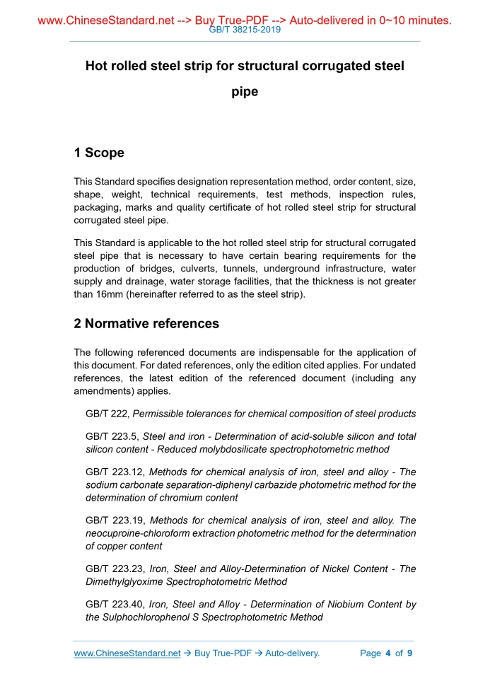Similar standardsGB/T 38215-2019: Hot rolled steel strip for structural corrugated steel pipe---This is an excerpt. Full copy of true-PDF in English version (including equations, symbols, images, flow-chart, tables, and figures etc.), auto-downloaded/delivered in 9 seconds, can be purchased online: https://www.ChineseStandard.net/PDF.aspx/GBT38215-2019NATIONAL STANDARD OF THE PEOPLE’S REPUBLIC OF CHINA ICS 77.140.50 H 46 Hot rolled steel strip for structural corrugated steel pipe ISSUED ON: OCTOBER 18, 2019 IMPLEMENTED ON: SEPTEMBER 01, 2020 Issued by: State Administration for Market Regulation; Standardization Administration of the People's Republic of China. Table of ContentsForeword ... 3 1 Scope ... 4 2 Normative references ... 4 3 Designation representation method ... 6 4 Order content ... 6 5 Size, shape, weight ... 7 6 Technical requirements ... 7 7 Test methods ... 8 8 Inspection rules ... 9 9 Packaging, marks and quality certificate ... 9 Hot rolled steel strip for structural corrugated steel pipe1 ScopeThis Standard specifies designation representation method, order content, size, shape, weight, technical requirements, test methods, inspection rules, packaging, marks and quality certificate of hot rolled steel strip for structural corrugated steel pipe. This Standard is applicable to the hot rolled steel strip for structural corrugated steel pipe that is necessary to have certain bearing requirements for the production of bridges, culverts, tunnels, underground infrastructure, water supply and drainage, water storage facilities, that the thickness is not greater than 16mm (hereinafter referred to as the steel strip).2 Normative referencesThe following referenced documents are indispensable for the application of this document. For dated references, only the edition cited applies. For undated references, the latest edition of the referenced document (including any amendments) applies. GB/T 222, Permissible tolerances for chemical composition of steel products GB/T 223.5, Steel and iron - Determination of acid-soluble silicon and total silicon content - Reduced molybdosilicate spectrophotometric method GB/T 223.12, Methods for chemical analysis of iron, steel and alloy - The sodium carbonate separation-diphenyl carbazide photometric method for the determination of chromium content GB/T 223.19, Methods for chemical analysis of iron, steel and alloy. The neocuproine-chloroform extraction photometric method for the determination of copper content GB/T 223.23, Iron, Steel and Alloy-Determination of Nickel Content - The Dimethylglyoxime Spectrophotometric Method GB/T 223.40, Iron, Steel and Alloy - Determination of Niobium Content by the Sulphochlorophenol S Spectrophotometric Method3 Designation representation methodA steel designation consists of three parts: “Q” that is the initial for Chinese pinyin “Qu” (yield strength), the specified minimum yield strength value and “BW” that is the initials for Chinese pinyin “Bo Wen” (corrugated) that represents usage. For example: Q235BW Where, Q - the initial for Chinese pinyin “Qu” (yield strength of steel); 235 - the specified minimum yield strength value, in megapascals (MPa); BW - the initials for Chinese pinyin “Bo Wen” (corrugated) that represents usage.4 Order content4.1 The contract and order sheet according to this Standard shall contain the following information: a) reference to this Standard; b) product name; c) designation; d) size and unevenness accuracy; e) weight; f) roll diameter; g) packaging method; h) edge state; i) other special requirements. 4.2 If the order contract does not specify the information such as the edge state, thickness accuracy, packaging method, it shall be supplied in the form of non- cutting, normal thickness accuracy and packaging provided by the supplier. ......Source: Above contents are excerpted from the full-copy PDF -- translated/reviewed by: www.ChineseStandard.net / Wayne Zheng et al. |