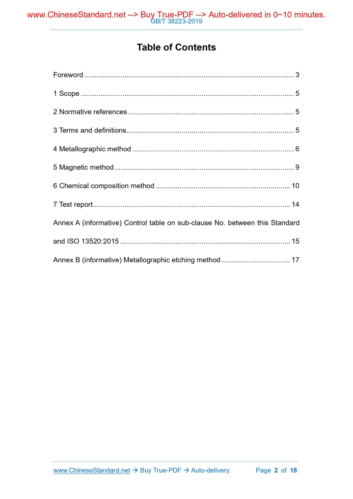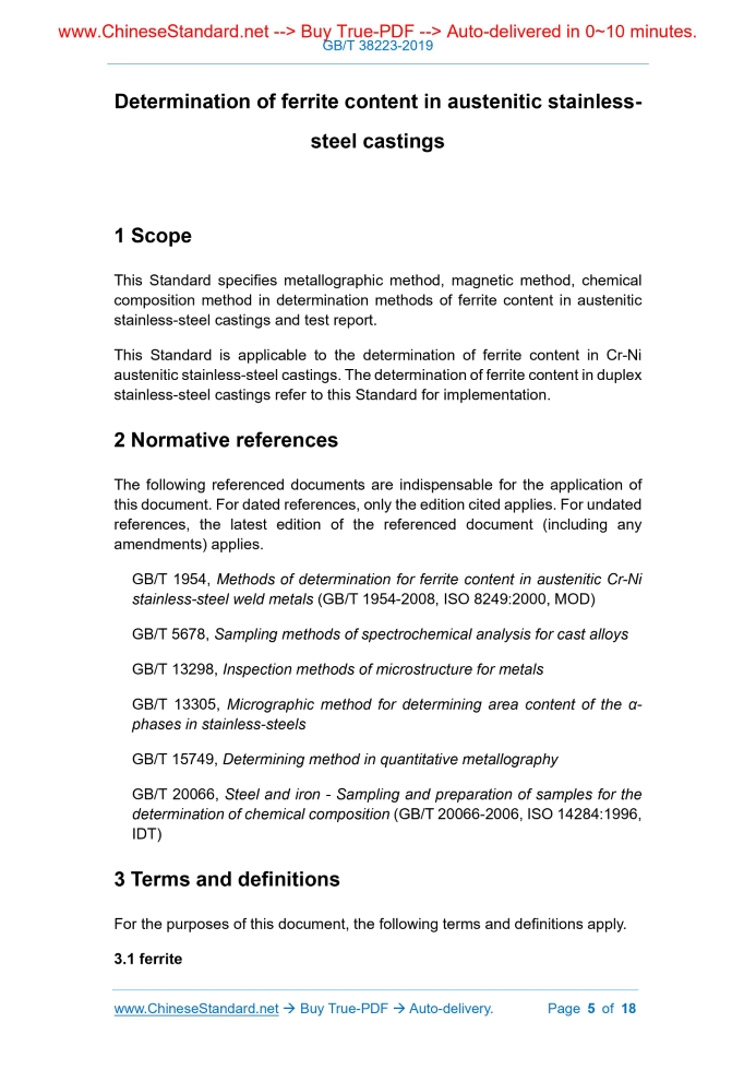 Similar standardsGB/T 38223-2019: Determination of ferrite content in austenitic stainless-steel castings---This is an excerpt. Full copy of true-PDF in English version (including equations, symbols, images, flow-chart, tables, and figures etc.), auto-downloaded/delivered in 9 seconds, can be purchased online: https://www.ChineseStandard.net/PDF.aspx/GBT38223-2019NATIONAL STANDARD OF THE PEOPLE’S REPUBLIC OF CHINA ICS 77.040.99 J 31 Determination of ferrite content in austenitic stainless- steel castings (ISO 13520:2015, MOD) ISSUED ON: OCTOBER 18, 2019 IMPLEMENTED ON: MAY 01, 2020 Issued by: State Administration for Market Regulation; Standardization Administration of the People's Republic of China. Table of ContentsForeword ... 3 1 Scope ... 5 2 Normative references ... 5 3 Terms and definitions ... 5 4 Metallographic method ... 6 5 Magnetic method ... 9 6 Chemical composition method ... 10 7 Test report ... 14 Annex A (informative) Control table on sub-clause No. between this Standard and ISO 13520:2015 ... 15 Annex B (informative) Metallographic etching method ... 17 Determination of ferrite content in austenitic stainless- steel castings1 ScopeThis Standard specifies metallographic method, magnetic method, chemical composition method in determination methods of ferrite content in austenitic stainless-steel castings and test report. This Standard is applicable to the determination of ferrite content in Cr-Ni austenitic stainless-steel castings. The determination of ferrite content in duplex stainless-steel castings refer to this Standard for implementation.2 Normative referencesThe following referenced documents are indispensable for the application of this document. For dated references, only the edition cited applies. For undated references, the latest edition of the referenced document (including any amendments) applies. GB/T 1954, Methods of determination for ferrite content in austenitic Cr-Ni stainless-steel weld metals (GB/T 1954-2008, ISO 8249:2000, MOD) GB/T 5678, Sampling methods of spectrochemical analysis for cast alloys GB/T 13298, Inspection methods of microstructure for metals GB/T 13305, Micrographic method for determining area content of the α- phases in stainless-steels GB/T 15749, Determining method in quantitative metallography GB/T 20066, Steel and iron - Sampling and preparation of samples for the determination of chemical composition (GB/T 20066-2006, ISO 14284:1996, IDT)3 Terms and definitionsFor the purposes of this document, the following terms and definitions apply. 3.1 ferrite 4.2.1 When sampling, the heat treatment state of the casting is agreed by the supplier and the purchaser. 4.2.2 It shall perform sampling on the base metal of the casting. The sampling position and quantity are agreed by the supplier and the purchaser. Cut the sample according to the provisions of GB/T 13305. 4.3 Test 4.3.1 Sample preparation Sample grinding, polishing and etching shall be carried out according to GB/T 13305 or GB/T 13298. The chemical etching method of the sample can be carried out according to GB/T 1954 or Annex B. 4.3.2 Selection of field of view 4.3.2.1 Use the worst field of view method or the average field of view method to determine the ferrite percentage in the sample, agreed by the supplier and the purchaser. When necessary, determine on two sections of the sample that are perpendicular to each other. 4.3.2.2 When using the worst field of view method, it shall select a lower amplification factor to fully observe the entire inspection surface. Select the field of view that has the most ferrite percentage to determine. 4.3.2.3 When using the average field of view method, generally, each detection surface randomly selects no less than 5 representative non-overlapping fields of view. Take the average value as the determination result. If the ferrite distribution is found to be uneven during the determination, it shall give the average, maximum and minimum percentages in the determination results and explain. 4.3.3 Selection of determination method 4.3.3.1 Use the grid number point method, grid line method and image analyzer method to determine the ferrite percentage in the field of view. During determination, it shall select a suitable determination method according to the ferrite morphology distribution. 4.3.3.2 The grid number point method is only applicable to the determination of ferrite percentage in casting that its form is approximately isometric. The grid line method and image analyzer method are applicable to the determination of ferrite percentage of all forms. 4.3.4 Determination of ferrite percentage 4.3.4.1 Grid number point method tested; d) Automatically determine the area fraction of the ferrite to be tested AA. According to equation (1), obtain the ferrite percentage of this sample.5 Magnetic method5.1 General rules 5.1.1 When the material requires heat treatment, the determination shall be performed after the casting is subject to the final heat treatment. During sampling, it shall avoid the effect of heat treated surface on the determination result. 5.1.2 The roughness of the surface to be tested shall meet Ra< 20μm. During sample processing, it shall use the minimum feed of the grinding machine to process the last 0.5mm. During determination, the distance between the determination point and the sample or component edge shall exceed 5mm. When determining on a curved surface, the radius of curvature shall be greater than 10mm. 5.2 Sampling rules 5.2.1 Except special requirements, the determination shall be performed on the sample (the sample is extracted from the base metal of casting, non-weld metal). If the determination position is the casting position designated on the design drawing, it shall be regulated on the agreement. 5.2.2 Extract the sample on the attaching casting test block of the casting. The minimum size of the sample shall be 30mm × 30mm × 30mm. When the sample is extracted from a single casting test block, the sample sha