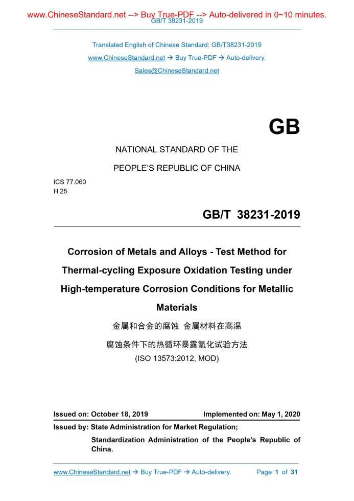 GB/T 38231-2019: Corrosion of metals and alloys - Test method for thermal-cycling exposure oxidation testing under high-temperature corrosion conditions for metallic materials Delivery: 9 seconds. True-PDF full-copy in English & invoice will be downloaded + auto-delivered via email. See step-by-step procedure Status: Valid
