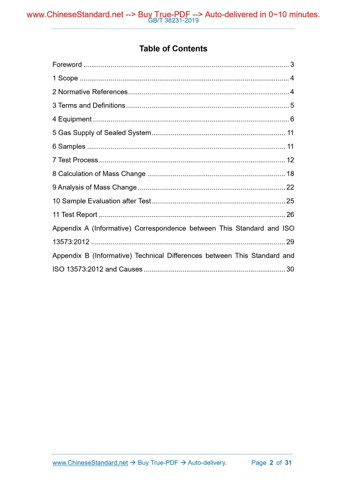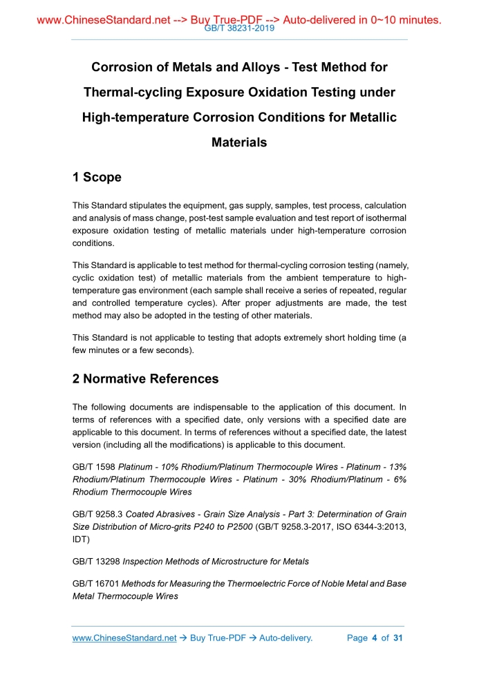 Similar standardsGB/T 38231-2019: Corrosion of metals and alloys - Test method for thermal-cycling exposure oxidation testing under high-temperature corrosion conditions for metallic materials---This is an excerpt. Full copy of true-PDF in English version (including equations, symbols, images, flow-chart, tables, and figures etc.), auto-downloaded/delivered in 9 seconds, can be purchased online: https://www.ChineseStandard.net/PDF.aspx/GBT38231-2019 NATIONAL STANDARD OF THE PEOPLE’S REPUBLIC OF CHINA ICS 77.060 H 25 Corrosion of Metals and Alloys - Test Method for Thermal-cycling Exposure Oxidation Testing under High-temperature Corrosion Conditions for Metallic Materials (ISO 13573:2012, MOD) ISSUED ON: OCTOBER 18, 2019 IMPLEMENTED ON: MAY 1, 2020 Issued by: State Administration for Market Regulation; Standardization Administration of the People’s Republic of China. Table of ContentsForeword ... 3 1 Scope ... 4 2 Normative References ... 4 3 Terms and Definitions ... 5 4 Equipment ... 6 5 Gas Supply of Sealed System ... 11 6 Samples ... 11 7 Test Process ... 12 8 Calculation of Mass Change ... 18 9 Analysis of Mass Change ... 22 10 Sample Evaluation after Test ... 25 11 Test Report ... 26 Appendix A (Informative) Correspondence between This Standard and ISO 13573:2012 ... 29 Appendix B (Informative) Technical Differences between This Standard and ISO 13573:2012 and Causes ... 30 Corrosion of Metals and Alloys - Test Method for Thermal-cycling Exposure Oxidation Testing under High-temperature Corrosion Conditions for Metallic Materials1 ScopeThis Standard stipulates the equipment, gas supply, samples, test process, calculation and analysis of mass change, post-test sample evaluation and test report of isothermal exposure oxidation testing of metallic materials under high-temperature corrosion conditions. This Standard is applicable to test method for thermal-cycling corrosion testing (namely, cyclic oxidation test) of metallic materials from the ambient temperature to high- temperature gas environment (each sample shall receive a series of repeated, regular and controlled temperature cycles). After proper adjustments are made, the test method may also be adopted in the testing of other materials. This Standard is not applicable to testing that adopts extremely short holding time (a few minutes or a few seconds).2 Normative ReferencesThe following documents are indispensable to the application of this document. In terms of references with a specified date, only versions with a specified date are applicable to this document. In terms of references without a specified date, the latest version (including all the modifications) is applicable to this document. GB/T 1598 Platinum - 10% Rhodium/Platinum Thermocouple Wires - Platinum - 13% Rhodium/Platinum Thermocouple Wires - Platinum - 30% Rhodium/Platinum - 6% Rhodium Thermocouple Wires GB/T 9258.3 Coated Abrasives - Grain Size Analysis - Part 3: Determination of Grain Size Distribution of Micro-grits P240 to P2500 (GB/T 9258.3-2017, ISO 6344-3:2013, IDT) GB/T 13298 Inspection Methods of Microstructure for Metals GB/T 16701 Methods for Measuring the Thermoelectric Force of Noble Metal and Base Metal Thermocouple Wires 4---humidity regulator (electronic); 5---hygrometer; 6---heating device with non-equilibrium gas mixture catalyst; 7---heating zone with heating belt; 8---heating device; 9---sample chamber; 10---sample; 11---sample holder; 12---thermocouple; 13---power/temperature control device; 14---moving direction of heating stove; 15---gas emission; 16---measurement device. Figure 2 (continued from previous page) 4.1.2 In the design of the heating device, the isolation of the sample chamber from the external environment shall be guaranteed. 4.1.3 It shall be guaranteed that flow that passes through the sample is continuous and within the stipulated range. 4.1.4 The sample chamber shall not adopt any materials that would react with the test environment during the testing process and lead to changes of the composition of the test environment. 4.1.5 If the sealed test system with sample chamber cannot be used, it is also allowable to conduct the test under the atmospheric environment in the laboratory. Atmospheric humidity shall be recorded; try to maintain at a constant temperature and be free from the effect of weather conditions in the laboratory. 4.1.6 Before the test, examine the heating stove at the exposure temperature of the test; determine the dimensions of the uniform temperature zone in the heating stove. Generally speaking, the method of independent activity thermocouple shall be adopted. 4.1.7 The temperature regulating device shall be able to guarantee that sample temperature maintains within the allowable deviation range that is stipulated in Table 4.2.5 Thermocouple wire shall adopt thermowell for protection. Thermowell shall be able to be used at the test temperature and under the test environment.5 Gas Supply of Sealed System5.1 Gas supply system shall be able to steadily provide gas for testing at a constant rate to the sample chamber. 5.2 Gas flow meter shall be adopted to monitor the gas flow. Flow meter shall be placed near the entrance of the sample chamber. However, when humidity regulator is used, flow meter shall be placed at the upstream of the humidifier. 5.3 When humidity regulator is used, humidity regulator shall be able to adjust humidity to an expected value. Unless it is otherwise stipulated, deionized water, whose conductivity is lower than 1 μS/cm shall be used. In order to prevent from condensation, the temperature of the space between the humidity regulator and the sample chamber shall be maintained above the dew point. 5.4 After gas is humidified, water vapor content shall be tested. Testing methods include: use a hygrometer to measure in front of sample chamber, or, measure water content after the condensation of the discharged gas, or, measure the amount of water consumption in the humidifier durin