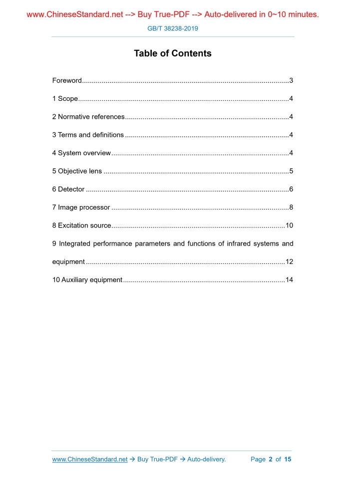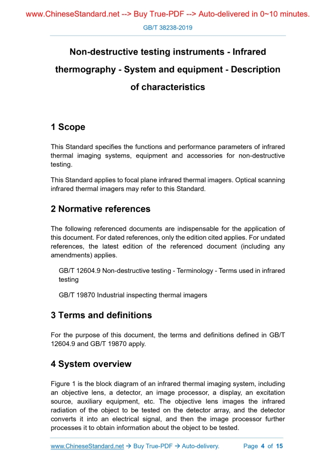Similar standardsGB/T 38238-2019: Non-destructive testing instruments - Infrared thermography - System and equipment - Description of characteristics---This is an excerpt. Full copy of true-PDF in English version (including equations, symbols, images, flow-chart, tables, and figures etc.), auto-downloaded/delivered in 9 seconds, can be purchased online: https://www.ChineseStandard.net/PDF.aspx/GBT38238-2019 GB NATIONAL STANDARD OF THE PEOPLE’S REPUBLIC OF CHINA ICS 19.100 J 04 Non-destructive testing instruments - Infrared thermography - System and equipment - Description of characteristics ISSUED ON: OCTOBER 18, 2019 IMPLEMENTED ON: MAY 01, 2020 Issued by: State Administration of Market Regulation; Standardization Administration of the People's Republic of China. Table of ContentsForeword ... 3 1 Scope ... 4 2 Normative references ... 4 3 Terms and definitions ... 4 4 System overview ... 4 5 Objective lens ... 5 6 Detector ... 6 7 Image processor ... 8 8 Excitation source ... 10 9 Integrated performance parameters and functions of infrared systems and equipment ... 12 10 Auxiliary equipment ... 14 Non-destructive testing instruments - Infrared thermography - System and equipment - Description of characteristics1 ScopeThis Standard specifies the functions and performance parameters of infrared thermal imaging systems, equipment and accessories for non-destructive testing. This Standard applies to focal plane infrared thermal imagers. Optical scanning infrared thermal imagers may refer to this Standard.2 Normative referencesThe following referenced documents are indispensable for the application of this document. For dated references, only the edition cited applies. For undated references, the latest edition of the referenced document (including any amendments) applies. GB/T 12604.9 Non-destructive testing - Terminology - Terms used in infrared testing GB/T 19870 Industrial inspecting thermal imagers3 Terms and definitionsFor the purpose of this document, the terms and definitions defined in GB/T 12604.9 and GB/T 19870 apply.4 System overviewFigure 1 is the block diagram of an infrared thermal imaging system, including an objective lens, a detector, an image processor, a display, an excitation source, auxiliary equipment, etc. The objective lens images the infrared radiation of the object to be tested on the detector array, and the detector converts it into an electrical signal, and then the image processor further processes it to obtain information about the object to be tested. affects the temperature measurement sensitivity of the testing system. The larger the aperture (the smaller the f number), the more the amount of light entering, the higher the system’s temperature measurement sensitivity, the smaller the temperature measurement range; the smaller the aperture (the larger the f number), the less the amount of light entering, the lower the system’s temperature measurement sensitivity, the larger he temperature measurement range. The aperture of the lens needs to be larger than the size of the detector to ensure that each element of the detector receives infrared radiation.6 Detector6.1 General Infrared thermal imaging systems use detectors to convert radiant energy into measurable electrical signals. Commonly used infrared radiation sensors include: microbolometers, optoelectronics, pyroelectric or quantum sensors, etc. The detector performance directly affects the spatial, temporal, and temperature resolution of the testing system. 6.2 Detector type Infrared thermal imaging detectors mainly have two types, i.e. thermal sensors and quantum sensors. Thermal sensors operate at room temperature, such as microbolometers and photoelectric sensors. Quantum sensors need to be cooled to a lower operating temperature. Compared to thermal sensors, quantum sensors have higher sensitivity and sampling frequency. 6.3 Detector array Infrared detectors can be single point, line array or two-dimensional array. A single point detector requires a scanning system to measure the object to be tested point by point and form a thermal image. A line array detector can be used to image moving objects such as production lines. A two-dimensional array detector uses a sensor unit to perform point-by-point scanning to obtain information to form a thermal image. 6.4 Scanning system Mechanical scanning can be achieved by moving mirrors, prisms, etc. However, since mechanical scanning limits the frame rate, thermal imagers with mechanical scanning system are not suitable for capturing high speed images compared to infrared thermal imagers with two-dimensional array detector. 6.5 Working band range. 6.12 Start-up time For uncooled detectors, a certain amount of preheating is required at startup to ensure that the temperature of the equipment itself is stable, reducing the effect of temperature drift on the measurement. For refrigerating detectors, it takes a certain amount of time to start up to ensure that the detector reaches the required operating temperature. The starting time is mainly determined by the type of chiller and the mode of cooling.7 Image processor7.1 General The image processor is used for the acquisition, analysis, processing, display and storage of infrared thermography. The analysis and processing of infrared thermography usually includes spatial distribution and changes with time of temperature fields, image enhancement, noise reduction, etc. The performance of the image processor mainly affects the speed, dynamic range, and imaging effects of the testing system. 7.2 Image acquisition 7.2.1 Timed acquisition Timing acquisition refers to image acquisition based on the internal clock of the system. Timing acquisition includes: single frame acquisition, equal time interval acquisition, and arbitrary set time interval acquisition. 7.2.2 Trigger acquisition Trigger acquisition is image acquisition based on the trigger source signal. The trigger source can be a trigger signal set internally 