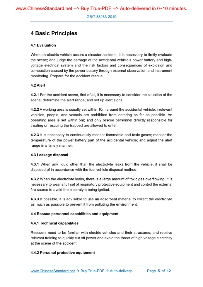 Similar standardsGB/T 38283-2019: Guidance for Electric Vehicles Fire Fighting and Emergency Rescue---This is an excerpt. Full copy of true-PDF in English version (including equations, symbols, images, flow-chart, tables, and figures etc.), auto-downloaded/delivered in 9 seconds, can be purchased online: https://www.ChineseStandard.net/PDF.aspx/GBT38283-2019NATIONAL STANDARD OF THE PEOPLE’S REPUBLIC OF CHINA ICS 43.020 T 09 Guidance for Electric Vehicles Fire Fighting and Emergency Rescue ISSUED ON: DECEMBER 10, 2019 IMPLEMENTED ON: JULY 01, 2020 Issued by: State Administration for Market Regulation; Standardization Administration of PRC. Table of ContentsForeword ... 3 1 Scope ... 4 2 Normative References ... 4 3 Terms and Definitions ... 4 4 Basic Principles ... 5 5 Vehicle Identification ... 6 6 Vehicle Fixing ... 6 7 Turn-off the Power ... 7 8 Collision Rescue ... 7 9 Waters Accident Rescue ... 9 10 Fire Extinguishing ... 11 11 Accident Rescue under Charging ... 12ForewordThis Standard was drafted as per the rules specified in GB/T 1.1-2009. This Standard was proposed by the Ministry of Industry and Information Technology of PRC. This Standard shall be under the jurisdiction of National Technical Committee for Standardization of Automobile (SAC/TC 114). Drafting organizations of this Standard: Shanghai Fire Research Institute of Ministry of Public Security; China Automotive Technology & Research Center Co., Ltd.; Beijing Electric Vehicle Co., Ltd.; BYD Automobile Industry Co., Ltd.; Technical Center for SAIC Motor Corporation Limit; Contemporary Amperex Technology Ltd.; Fire Department of Ministry of Public Security; China FAW Group Co., Ltd.; Pan Asia Technical Automotive Center Co., Ltd.; and Zhengzhou Yutong Bus Co., Ltd. Chief drafting staffs of this Standard: Cai Liying, He Ning, Li Peng, Fu Hedong, Lu Chun, Liu Guibin, Xue Lin, Zhang Yongfeng, Huang Hao, Tan Yi, Zhang Lei, Liu Chaohui, Fu Jiewen, Song Fang, Wu Pei, and Huang Dongyi. Guidance for Electric Vehicles Fire Fighting and Emergency Rescue1 ScopeThis Standard gives guidance on the fire fighting and emergency rescue in the event of a fire, collision, or water bubble for an electric vehicle. This Standard is applicable to the full-time rescue personnel for emergency rescue against the pure electric vehicles and hybrid electric vehicles. This Standard is inapplicable to the emergency rescue of the fuel cell electric vehicles.2 Normative ReferencesThe following documents are essential to the application of this document. For the dated documents, only the versions with the dates indicated are applicable to this document; for the undated documents, only the latest version (including all the amendments) are applicable to this document. GB/T 5907 (all parts) Fire Protection Vocabulary GB/T 19596 Terminology of Electric Vehicles GA/T 1276 Guidelines for Extricating Trapped Persons in Road Traffic Accidents3 Terms and DefinitionsFor the purpose of this document, the terms and definitions given in GB/T 5907 and GB/T 19596 and the following apply. 3.1 Offensive attack When a person is trapped or the high-voltage battery does not catch fire, an offensive fire extinguishing tactic is adopted under the condition of good personal protection. 3.2 Defensive attack When the high-voltage battery is ignited and no one is trapped, a defensive fire extinguishing tactic is adopted under the insufficient fire-extinguishing conditions.4 Basic Principles4.1 Evaluation When an electric vehicle occurs a disaster accident, it is necessary to firstly evaluate the scene; and judge the damage of the accidental vehicle’s power battery and high- voltage electrical system and the risk factors and consequences of explosion and combustion caused by the power battery through external observation and instrument monitoring. Prepare for the accident rescue. 4.2 Alert 4.2.1 For the accident scene, first of all, it is necessary to consider the situation of the scene; determine the alert range; and set up alert signs. 4.2.2 A working area is usually set within 10m around the accidental vehicle; irrelevant vehicles, people, and vessels are prohibited from entering as far as possible. An operating area is set within 5m; and only rescue personnel directly responsible for treating or rescuing the trapped are allowed to enter. 4.2.3 It is necessary to continuously monitor flammable and toxic gases; monitor the temperature of the power battery part of the accidental vehicle; and adjust the alert range in a timely manner. 4.3 Leakage disposal 4.3.1 When any liquid other than the electrolyte leaks from the vehicle, it shall be disposed of in accordance with the fuel vehicle disposal method. 4.3.2 When the electrolyte leaks, there is a large amount of toxic gas overflowing. It is necessary to wear a full set of respiratory protective equipment and control the external fire source to avoid the electrolyte being ignited. 4.3.3 If possible, it is advisable to use an adsorbent material to collect the electrolyte as much as possible to prevent it from polluting the environment. 4.4 Rescue personnel capabilities and equipment 4.4.1 Technical capabilities Rescuers need to be familiar with electric vehicles and their structures; and receive relevant training to quickly cut off power and avoid the threat of high voltage electricity at the scene of the accident. 4.4.2 Personal protective equipment In the event of an electric vehicle accident, especially when the battery is damaged or burned, in addition to the danger of electric shock, a large amount of toxic and harmful gases shall be released. To ensure the safety of rescuers, personal protective equipment shall be worn as follows: a) When dealing with fire accident, rescuers shall wear full sets of personal protective equipment and respiratory protective equipment as much as possible; b) When dealing with collisions and wading accidents, rescuers shall wear a full set of electrical insulation equipment as much as possible; an