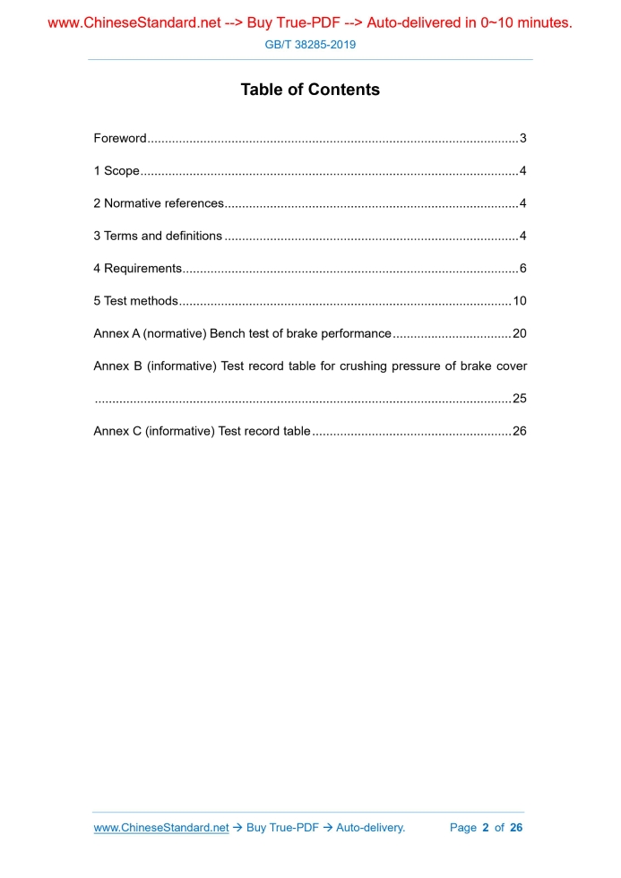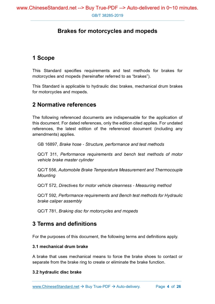 Similar standardsGB/T 38285-2019: Brakes for motorcycles and mopeds---This is an excerpt. Full copy of true-PDF in English version (including equations, symbols, images, flow-chart, tables, and figures etc.), auto-downloaded/delivered in 9 seconds, can be purchased online: https://www.ChineseStandard.net/PDF.aspx/GBT38285-2019GB NATIONAL STANDARD OF THE PEOPLE’S REPUBLIC OF CHINA ICS 43.140 T 82 Brakes for motorcycles and mopeds ISSUED ON: DECEMBER 10, 2019 IMPLEMENTED ON: JULY 01, 2020 Issued by: State Administration for Market Regulation; Standardization Administration of the People's Republic of China. Table of ContentsForeword ... 3 1 Scope ... 4 2 Normative references ... 4 3 Terms and definitions ... 4 4 Requirements ... 6 5 Test methods ... 10 Annex A (normative) Bench test of brake performance ... 20 Annex B (informative) Test record table for crushing pressure of brake cover ... 25 Annex C (informative) Test record table ... 26 Brakes for motorcycles and mopeds1 ScopeThis Standard specifies requirements and test methods for brakes for motorcycles and mopeds (hereinafter referred to as “brakes”). This Standard is applicable to hydraulic disc brakes, mechanical drum brakes for motorcycles and mopeds.2 Normative referencesThe following referenced documents are indispensable for the application of this document. For dated references, only the edition cited applies. For undated references, the latest edition of the referenced document (including any amendments) applies. GB 16897, Brake hose - Structure, performance and test methods QC/T 311, Performance requirements and bench test methods of motor vehicle brake master cylinder QC/T 556, Automobile Brake Temperature Measurement and Thermocouple Mounting QC/T 572, Directives for motor vehicle cleanness - Measuring method QC/T 592, Performance requirements and Bench test methods for Hydraulic brake caliper assembly QC/T 781, Braking disc for motorcycles and mopeds3 Terms and definitionsFor the purposes of this document, the following terms and definitions apply. 3.1 mechanical drum brake A brake that uses mechanical means to force the brake shoes to contact or separate from the brake ring to create or eliminate the brake function. 3.2 hydraulic disc brake The phenomenon that after a brake has water recession, the brake performance is restored due to the humidity drop. 3.12 drag torque The residual disc rotation torque when the hydraulic pressure or thrust of a brake is released. 3.13 caliper sliding resistance The resistance of floating brake caliper moving on sliding shaft.4 Requirements4.1 Basic requirements 4.1.1 The brake shall be manufactured according to the product drawings and technical documents approved by the prescribed procedures, in accordance with the provisions of this Standard. 4.1.2 The materials and related parts used for the brake shall meet the requirements of the relevant technical documents. 4.2 Hydraulic disc brake 4.2.1 Brake master cylinder 4.2.1.1 Tightness The vacuum tightness, pneumatic tightness and hydraulic tightness of the brake master cylinder shall comply with the provisions of QC/T 311. 4.2.1.2 Piston invalid stroke Invalid stroke is (1.1±0.7) mm at the piston of the master cylinder or the value required by the vehicle manufacturer. 4.2.1.3 Piston reset time The no-load reset time of the master cylinder piston shall not exceed 0.5s. 4.2.1.4 Followability of oil sump gasket In the followability test of the oil sump gasket of the brake master cylinder, the liquid level in the oil sump can drop smoothly. 4.2.1.5 Compressive strength 4.2.2.7 Torsional fatigue strength After the torsional fatigue strength test, the brake caliper shall not produce deformation or damage that affects the performance. There shall be no hydraulic leakage during the entire test. 4.2.2.8 Vibration durability The vibration durability of the brake caliper shall meet the requirements of QC/T 592. 4.2.2.9 Waterproof performance The waterproof performance of the brake caliper shall meet the requirements of QC/T 592. 4.2.3 Brake disc Brake discs for motorcycles and mopeds shall meet the relevant requirements of QC/T 781. 4.2.4 Brake tube Brake tubes for motorcycles and mopeds shall meet the relevant requirements of GB 16897. 4.2.5 Assembly 4.2.5.1 Tightness After the assembly is tested for tightness, there shall be no leakage at all connections. 4.2.5.2 Durability 4.2.5.2.1 Endurance at room temperature After the room temperature endurance test, there shall be no parts damage, no leakage, and the assembly can still work normally. 4.2.5.2.2 Endurance at high temperature After the high temperature endurance test, there shall be no parts damage, no leakage, and the assembly can still work normally. 4.2.5.2.3 Endurance at low temperature After the low temperature endurance test, there shall be no parts damage, no leakage, and the assembly can still work normally. a) Drain the brake fluid from the sample. Close the drain hole. Connect to the vacuum source from the sample cup opening; b) When the vacuum inside the sample reaches -98kPa±2kPa, turn off the vacuum source. Measure the pressure rise within 5s. 5.1.1.1.2 Air tightness The air tightness test is carried out as follows: a) Open the sample cup lid. Drain the brake fluid from the sample. Use the push rod of the driving device to push the brake handle or piston of the sample until push to exceed the maximum initial pressure build-up stroke of the sample; b) Connect the oil outlet of the sample to the test gas source. Adjust the air source pressure to 50kPa±2kPa. Turn off the air source; c) Measure the pressure drop of the sample brake cavity within 10s after stabilizing for 3s~5s; d) Return the push rod of the drive unit to its original position; e) The sample oil cup cover is assembled to the brake master cylinder according to the actual assembly state; f) Adjust the air source pressure to 0.5MPa±0.05MPa. Maintain 10s. Observe whether there is air leakage at the sample and the
