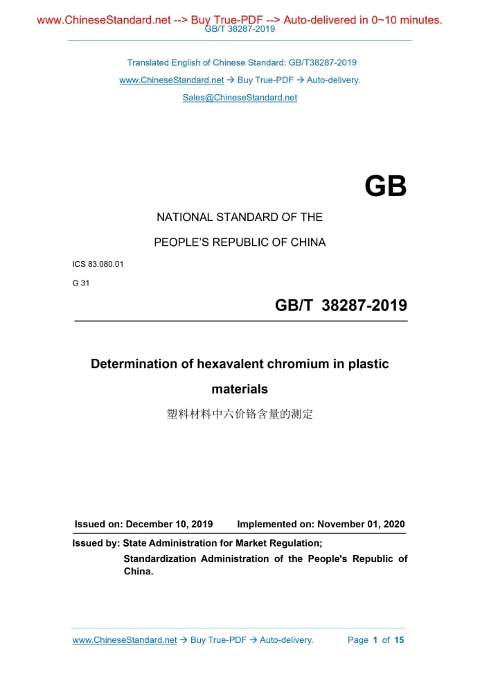 GB/T 38287-2019: Determination of hexavalent chromium in plastic materials Delivery: 9 seconds. True-PDF full-copy in English & invoice will be downloaded + auto-delivered via email. See step-by-step procedure Status: Valid