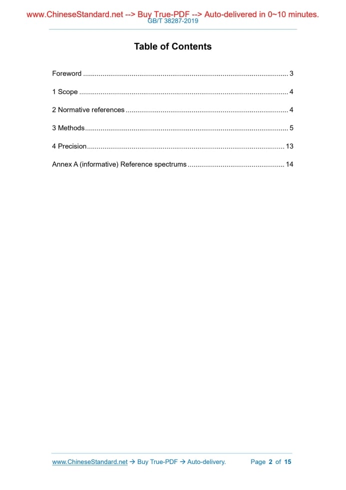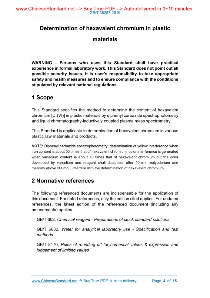 Similar standardsGB/T 38287-2019: Determination of hexavalent chromium in plastic materials---This is an excerpt. Full copy of true-PDF in English version (including equations, symbols, images, flow-chart, tables, and figures etc.), auto-downloaded/delivered in 9 seconds, can be purchased online: https://www.ChineseStandard.net/PDF.aspx/GBT38287-2019NATIONAL STANDARD OF THE PEOPLE’S REPUBLIC OF CHINA ICS 83.080.01 G 31 Determination of hexavalent chromium in plastic materials ISSUED ON: DECEMBER 10, 2019 IMPLEMENTED ON: NOVEMBER 01, 2020 Issued by: State Administration for Market Regulation; Standardization Administration of the People's Republic of China. Table of ContentsForeword ... 3 1 Scope ... 4 2 Normative references ... 4 3 Methods ... 5 4 Precision ... 13 Annex A (informative) Reference spectrums ... 14 Determination of hexavalent chromium in plastic materials WARNING - Persons who uses this Standard shall have practical experience in formal laboratory work. This Standard does not point out all possible security issues. It is user’s responsibility to take appropriate safety and health measures and to ensure compliance with the conditions stipulated by relevant national regulations.1 ScopeThis Standard specifies the method to determine the content of hexavalent chromium [Cr(VI)] in plastic materials by diphenyl carbazide spectrophotometry and liquid chromatography-inductively coupled plasma mass spectrometry. This Standard is applicable to determination of hexavalent chromium in various plastic raw materials and products. NOTE: Diphenyl carbazide spectrophotometry: determination of yellow interference when iron content is about 50 times that of hexavalent chromium; color interference is generated when vanadium content is about 10 times that of hexavalent chromium but the color developed by vanadium and reagent shall disappear after 10min; molybdenum and mercury above 200mg/L interfere with the determination of hexavalent chromium.2 Normative referencesThe following referenced documents are indispensable for the application of this document. For dated references, only the edition cited applies. For undated references, the latest edition of the referenced document (including any amendments) applies. GB/T 602, Chemical reagent - Preparations of stock standard solutions GB/T 6682, Water for analytical laboratory use - Specification and test methods GB/T 8170, Rules of rounding off for numerical values & expression and judgement of limiting values 3.1.2.13 Diphenyl carbazide acetone solution (color developer): Weigh 0.5g of diphenyl carbazide to dissolve in 100mL of acetone. Store in a brown bottle. It can be stored in a 4°C refrigerator for half a month. It cannot be used when the solution becomes deep. 3.1.2.14 Hexavalent chromium standard stock solution (100mg/L or other concentration): Use single-element or multi-element standard stock solution of a certain concentration that is certified by the country and awarded with a reference material certificate. It can also prepare the standard solution required according to GB/T 602. Accurately weigh 0.1414g of potassium dichromate that has been dried at 120°C for 2h. Use water to dissolve and move into a 1000mL volumetric flask. Use water to dilute to the scale. Shale well. The hexavalent chromium concentration of this solution is 100mg/L. 3.1.3 Instruments and equipment 3.1.3.1 Ultraviolet-visible spectrophotometer. 3.1.3.2 Constant temperature shaking water bath: Temperature control accuracy is ±1°C. 3.1.3.3 Microwave extraction instrument: equipped with Teflon extraction tank or other suitable extraction tank. 3.1.3.4 pH meter: resolution is 0.01pH. 3.1.3.5 Analytical balance: accuracy is 0.0001g. 3.1.3.6 Coarse grinder or cutter for stainless steel bottom screen. 3.1.3.7 Centrifugal grinder or ball mill. 3.1.3.8 Colorimetric tube or beaker. 3.1.3.9 All utensils and extraction tanks cannot use chromic acid washing liquid to soak. When necessary, the glassware and extraction tank used can be soaked in dilute nitric acid for more than 12h. Then use water to rinse before using. 3.1.4 Analysis steps 3.1.4.1 Sample crushing Crush a sample to obtain plastic sample powders of which particle size is less than 250μm. The difference in plastic material shall result in different minimum powder particle size. Minimize the particle size of plastic materials to accelerate sample leaching or extraction. The sample of which the particle size is still large after crushing can extend the leaching time or extraction time to promote the According to the sensitivity, linear range of the instrument and the actual content of hexavalent chromium in the sample solution, determine the concentration and scope of standard use solution. Usually use at least 5 concentration points (except blank). Standard solutions shall be stored in chromium-free plastic containers. Hexavalent chromium standard use solution shall be prepared when needed. 3.1.4.3.2 Establishment of standard curve Take zero point of hexavalent chromium standard series solution as reference. In ascending order of concentration, measure the absorbance of standard series solutions at 540nm. Use the concentration as the abscissa and the absorbance value as the ordinate to make a standard curve. Correlation coefficient (R2) is not less than 0.998. 3.1.4.3.3 Sample determination Perform two parallel experiments for each sample, while conducting a sample blank experiment. The color reaction of the extraction solution and the hexavalent chromium standard series solution shall be carried out simultaneously. The color- developed solution shall be measured within 15min after the color-developing agent is added. Calculate the content of hexavalent chromium in the extraction solution from the standard curve. If the measurement result exceeds the standard curve range, it shall be diluted before measuring or re-establishing a suitable standard curve. 3.1.5 Result calculation The content of hexavalent chr