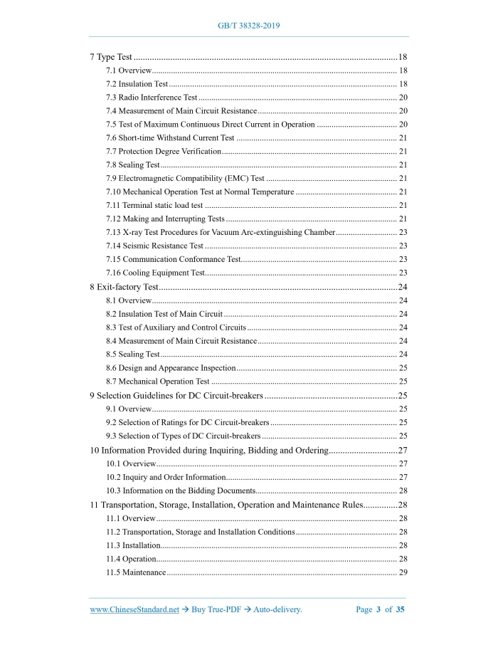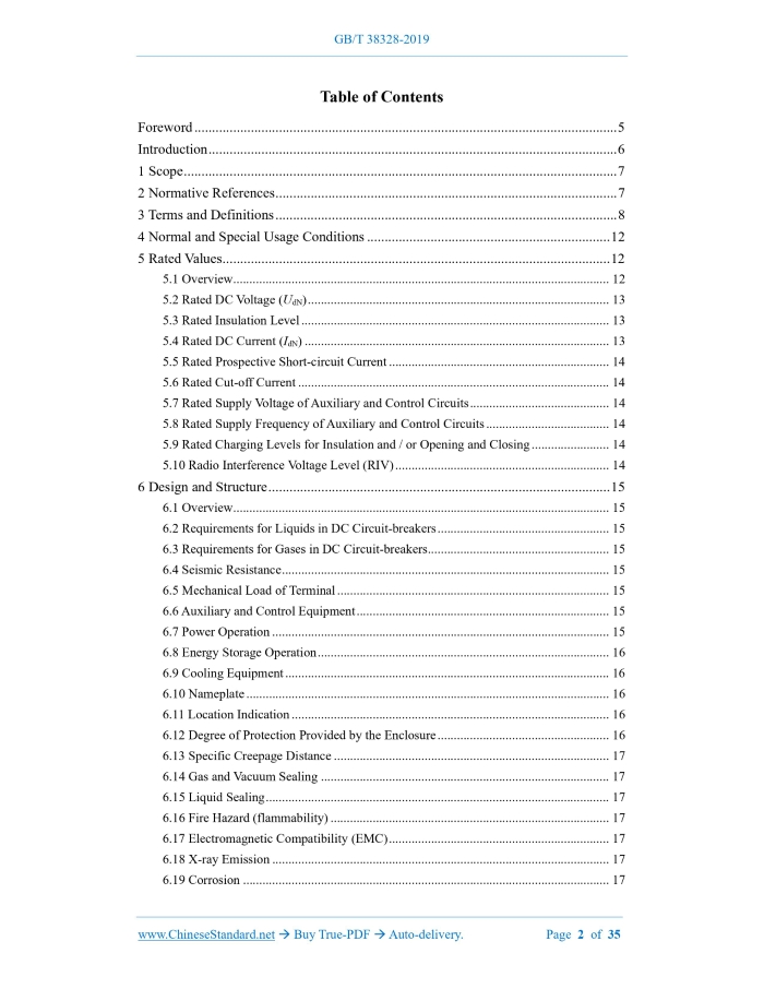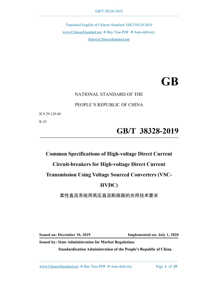 Similar standardsGB/T 38328-2019: Common specifications of high-voltage direct current circuit-breakers for high-voltage direct current transmission using voltage sourced converters (VSC-HVDC)---This is an excerpt. Full copy of true-PDF in English version (including equations, symbols, images, flow-chart, tables, and figures etc.), auto-downloaded/delivered in 9 seconds, can be purchased online: https://www.ChineseStandard.net/PDF.aspx/GBT38328-2019 GB NATIONAL STANDARD OF THE PEOPLE’S REPUBLIC OF CHINA ICS 29.120.40 K 43 Common Specifications of High-voltage Direct Current Circuit-breakers for High-voltage Direct Current Transmission Using Voltage Sourced Converters (VSC- HVDC) Issued on: DECEMBER 10, 2019 Implemented on: JULY 1, 2020 Issued by. State Administration for Market Regulation; Standardization Administration of the People’s Republic of China. Table of ContentsForeword... 5 Introduction... 6 1 Scope... 7 2 Normative References... 7 3 Terms and Definitions... 8 4 Normal and Special Usage Conditions... 12 5 Rated Values... 12 5.1 Overview... 12 5.2 Rated DC Voltage (UdN)... 13 5.3 Rated Insulation Level... 13 5.4 Rated DC Current (IdN)... 13 5.5 Rated Prospective Short-circuit Current... 14 5.6 Rated Cut-off Current... 14 5.7 Rated Supply Voltage of Auxiliary and Control Circuits... 14 5.8 Rated Supply Frequency of Auxiliary and Control Circuits... 14 5.9 Rated Charging Levels for Insulation and / or Opening and Closing... 14 5.10 Radio Interference Voltage Level (RIV)... 14 6 Design and Structure... 15 6.1 Overview... 15 6.2 Requirements for Liquids in DC Circuit-breakers... 15 6.3 Requirements for Gases in DC Circuit-breakers... 15 6.4 Seismic Resistance... 15 6.5 Mechanical Load of Terminal... 15 6.6 Auxiliary and Control Equipment... 15 6.7 Power Operation... 15 6.8 Energy Storage Operation... 16 6.9 Cooling Equipment... 16 6.10 Nameplate... 16 6.11 Location Indication... 16 6.12 Degree of Protection Provided by the Enclosure... 16 6.13 Specific Creepage Distance... 17 6.14 Gas and Vacuum Sealing... 17 6.15 Liquid Sealing... 17 6.16 Fire Hazard (flammability)... 17 6.17 Electromagnetic Compatibility (EMC)... 17 6.18 X-ray Emission... 17 6.19 Corrosion... 17 7 Type Test... 18 7.1 Overview... 18 7.2 Insulation Test... 18 7.3 Radio Interference Test... 20 7.4 Measurement of Main Circuit Resistance... 20 7.5 Test of Maximum Continuous Direct Current in Operation... 20 7.6 Short-time Withstand Current Test... 21 7.7 Protection Degree Verification... 21 7.8 Sealing Test... 21 7.9 Electromagnetic Compatibility (EMC) Test... 21 7.10 Mechanical Operation Test at Normal Temperature... 21 7.11 Terminal static load test... 21 7.12 Making and Interrupting Tests... 21 7.13 X-ray Test Procedures for Vacuum Arc-extinguishing Chamber... 23 7.14 Seismic Resistance Test... 23 7.15 Communication Conformance Test... 23 7.16 Cooling Equipment Test... 23 8 Exit-factory Test... 24 8.1 Overview... 24 8.2 Insulation Test of Main Circuit... 24 8.3 Test of Auxiliary and Control Circuits... 24 8.4 Measurement of Main Circuit Resistance... 24 8.5 Sealing Test... 24 8.6 Design and Appearance Inspection... 25 8.7 Mechanical Operation Test... 25 9 Selection Guidelines for DC Circuit-breakers... 25 9.1 Overview... 25 9.2 Selection of Ratings for DC Circuit-breakers... 25 9.3 Selection of Types of DC Circuit-breakers... 25 10 Information Provided during Inquiring, Bidding and Ordering... 27 10.1 Overview... 27 10.2 Inquiry and Order Information... 27 10.3 Information on the Bidding Documents... 28 11 Transportation, Storage, Installation, Operation and Maintenance Rules... 28 11.1 Overview... 28 11.2 Transportation, Storage and Installation Conditions... 28 11.3 Installation... 28 11.4 Operation... 28 11.5 Maintenance... 29 Common Specifications of High-voltage Direct Current Circuit-breakers for High-voltage Direct Current Transmission Using Voltage Sourced Converters1 ScopeThis Standard specifies the operating environmental conditions, terms and definitions, ratings, design and structure, type test, exit-factory test and selection guidelines, etc. of high-voltage DC circuit-breakers for the VSC-HVDC. This Standard is applicable to mechanical high-voltage DC circuit-breakers, power electronic DC circuit-breakers and hybrid DC circuit-breakers installed indoors and outdoors for the VSC- HVDC with a voltage level of DC 6 kV and above. This Standard does not apply to specific types of DC circuit-breakers that are otherwise specified in product standards related to DC circuit-breakers.2 Normative ReferencesThe following documents are indispensable to the application of this document. In terms of references with a specified date, only versions with a specified date are applicable to this document. In terms of references without a specified date, the latest version (including all the modifications) is applicable to this document. GB/T 311.1-2012 Insulation Co-ordination - Part 1.Definitions, Principles and Rules GB/T 1984-2014 High-voltage Alternating-current Circuit-breakers GB/T 2900.20-2016 Electrotechnical Terminology - High-voltage Switchgear and Controlgear GB/T 7354-2018 High-voltage Test Techniques - Partial Discharge Measurements GB/T 11022-2011 Common Specifications for High-voltage Switchgear and Controlgear Standards GB/T 13498-2017 Terminology for High-voltage Direct Current (HVDC) Transmission GB/T 13540-2009 Seismic Qualification for High-voltage Switchgear and Controlgear GB/T 16927.1-2011 High-voltage Test Techniques - Part 1.General Definitions and Test Requirements GB/T 20990.1-2007 Thyristor Valves for High Voltage Direct Current (HVDC) Power Transmission - Part 1.Electrical Testing GB/T 25091-2010 High-voltage Direct-current Disconnectors and Earthing Switches GB/T 30425-2013 Water Cooling Equipment for Converter Valves for High Voltage Direct Current (HVDC) Power Transmission GB/T 34139-2017 Technical Specification of Converters for High-voltage Direct Current (HVDC) Transmission Using Vo