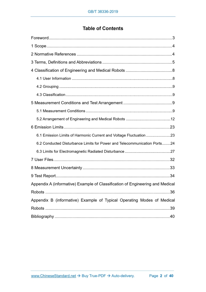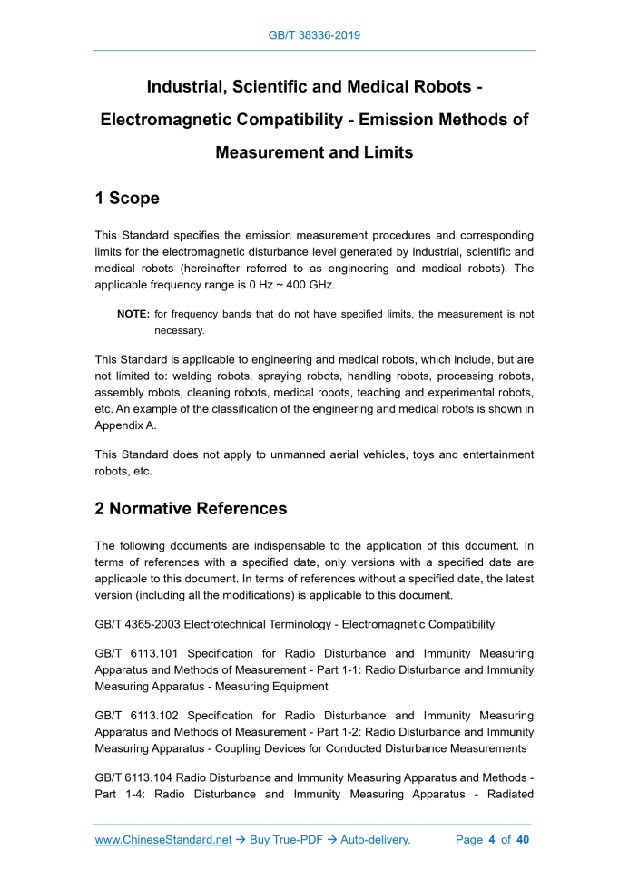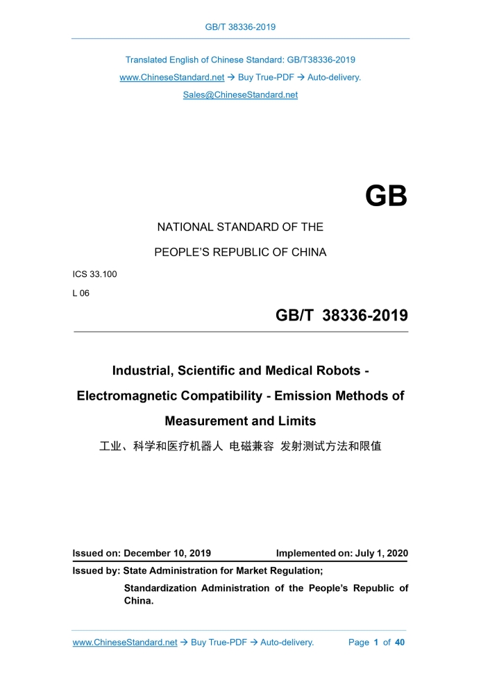 Similar standardsGB/T 38336-2019: Industrial, scientific and medical robots - Electromagnetic compatibility - Emission methods of measurement and limits---This is an excerpt. Full copy of true-PDF in English version (including equations, symbols, images, flow-chart, tables, and figures etc.), auto-downloaded/delivered in 9 seconds, can be purchased online: https://www.ChineseStandard.net/PDF.aspx/GBT38336-2019 GB NATIONAL STANDARD OF THE PEOPLE’S REPUBLIC OF CHINA ICS 33.100 L 06 Industrial, Scientific and Medical Robots - Electromagnetic Compatibility - Emission Methods of Measurement and Limits ISSUED ON: DECEMBER 10, 2019 IMPLEMENTED ON: JULY 1, 2020 Issued by: State Administration for Market Regulation; Standardization Administration of the People’s Republic of China. Table of ContentsForeword ... 3 1 Scope ... 4 2 Normative References ... 4 3 Terms, Definitions and Abbreviations ... 5 4 Classification of Engineering and Medical Robots ... 8 4.1 User Information ... 8 4.2 Grouping ... 9 4.3 Classification ... 9 5 Measurement Conditions and Test Arrangement ... 9 5.1 Measurement Conditions ... 9 5.2 Arrangement of Engineering and Medical Robots ... 12 6 Emission Limits ... 23 6.1 Emission Limits of Harmonic Current and Voltage Fluctuation ... 23 6.2 Conducted Disturbance Limits for Power and Telecommunication Ports ... 24 6.3 Limits for Electromagnetic Radiated Disturbance ... 27 7 User Files ... 32 8 Measurement Uncertainty ... 33 9 Test Report ... 34 Appendix A (informative) Example of Classification of Engineering and Medical Robots ... 36 Appendix B (informative) Example of Typical Operating Modes of Medical Robots ... 39 Bibliography ... 40 Industrial, Scientific and Medical Robots - Electromagnetic Compatibility - Emission Methods of Measurement and Limits1 ScopeThis Standard specifies the emission measurement procedures and corresponding limits for the electromagnetic disturbance level generated by industrial, scientific and medical robots (hereinafter referred to as engineering and medical robots). The applicable frequency range is 0 Hz ~ 400 GHz. NOTE: for frequency bands that do not have specified limits, the measurement is not necessary. This Standard is applicable to engineering and medical robots, which include, but are not limited to: welding robots, spraying robots, handling robots, processing robots, assembly robots, cleaning robots, medical robots, teaching and experimental robots, etc. An example of the classification of the engineering and medical robots is shown in Appendix A. This Standard does not apply to unmanned aerial vehicles, toys and entertainment robots, etc.2 Normative ReferencesThe following documents are indispensable to the application of this document. In terms of references with a specified date, only versions with a specified date are applicable to this document. In terms of references without a specified date, the latest version (including all the modifications) is applicable to this document. GB/T 4365-2003 Electrotechnical Terminology - Electromagnetic Compatibility GB/T 6113.101 Specification for Radio Disturbance and Immunity Measuring Apparatus and Methods of Measurement - Part 1-1: Radio Disturbance and Immunity Measuring Apparatus - Measuring Equipment GB/T 6113.102 Specification for Radio Disturbance and Immunity Measuring Apparatus and Methods of Measurement - Part 1-2: Radio Disturbance and Immunity Measuring Apparatus - Coupling Devices for Conducted Disturbance Measurements GB/T 6113.104 Radio Disturbance and Immunity Measuring Apparatus and Methods - Part 1-4: Radio Disturbance and Immunity Measuring Apparatus - Radiated Robot refers to an actuator that has two or more programmable axles and a certain degree of initiative ability, which enables it to move in the environment to perform expected tasks. NOTE 1: robot includes control system and control system interface. NOTE 2: Definition 2.6 of GB/T 12643-2013 is modified. 3.1.2 Mobile robot Mobile robot refers to a robot based on its own control and movement. NOTE: in this Standard, it is referred to as mobile engineering and medical robot. [GB/T 12643-2013, Definition 2.10] 3.1.3 Industrial robot Industrial robot refers to an automatically controlled, re-programmable, multi-purpose manipulator that can program three or more axles. It can be stationary-type or mobile- type. It is used in industrial automation. NOTE 1: industrial robot includes: ---manipulator, including actuator; ---controller, including teaching box and some communication interfaces (hardware and software). NOTE 2: it includes some integrated additional axles. [GB/T 12643-2013, Definition 2.9] 3.1.4 Medical robot Medical robot is a robot used as electrical medical equipment or electrical medical system. [IEC TR 60601-4-1: 2017, 3.20] 3.1.5 Electromagnetic environment Electromagnetic environment is the sum of all electromagnetic phenomena that exist in a certain given place. [GB/T 4365-2003, Definition 161-01-01] 3.1.6 Electromagnetic disturbance Electromagnetic disturbance refers to any electromagnetic phenomenon that may robot file. Meanwhile, the manufacturer and / or supplier shall also specify the meaning of the group and category in the robot file. 4.2 Grouping The engineering and medical robots within the scope of this Standard are divided into two groups, namely, Group 1 and Group 2. Group 1 of engineering and medical robots Other engineering and medical robots, other than Group 2 of engineering and medical robots within the scope of this Standard. Group 2 of engineering and medical robots They include all engineering and medical robots that intentionally generate and use or partially use radio frequency energy in the frequency range of 9 kHz ~ 400 GHz in the form of electromagnetic radiation, inductive and / or capacitive coupling, and are used for material processing or inspection / analysis purposes, or for the transmission of electromagnetic energy. 4.3 Classification In accordance with the intended use
