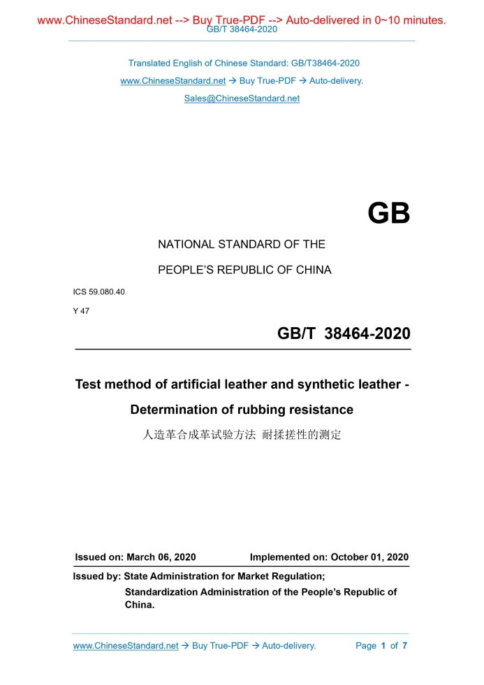 GB/T 38464-2020: Test method of artificial leather and synthetic leather - Determination of rubbing resistance Delivery: 9 seconds. True-PDF full-copy in English & invoice will be downloaded + auto-delivered via email. See step-by-step procedure Status: Valid